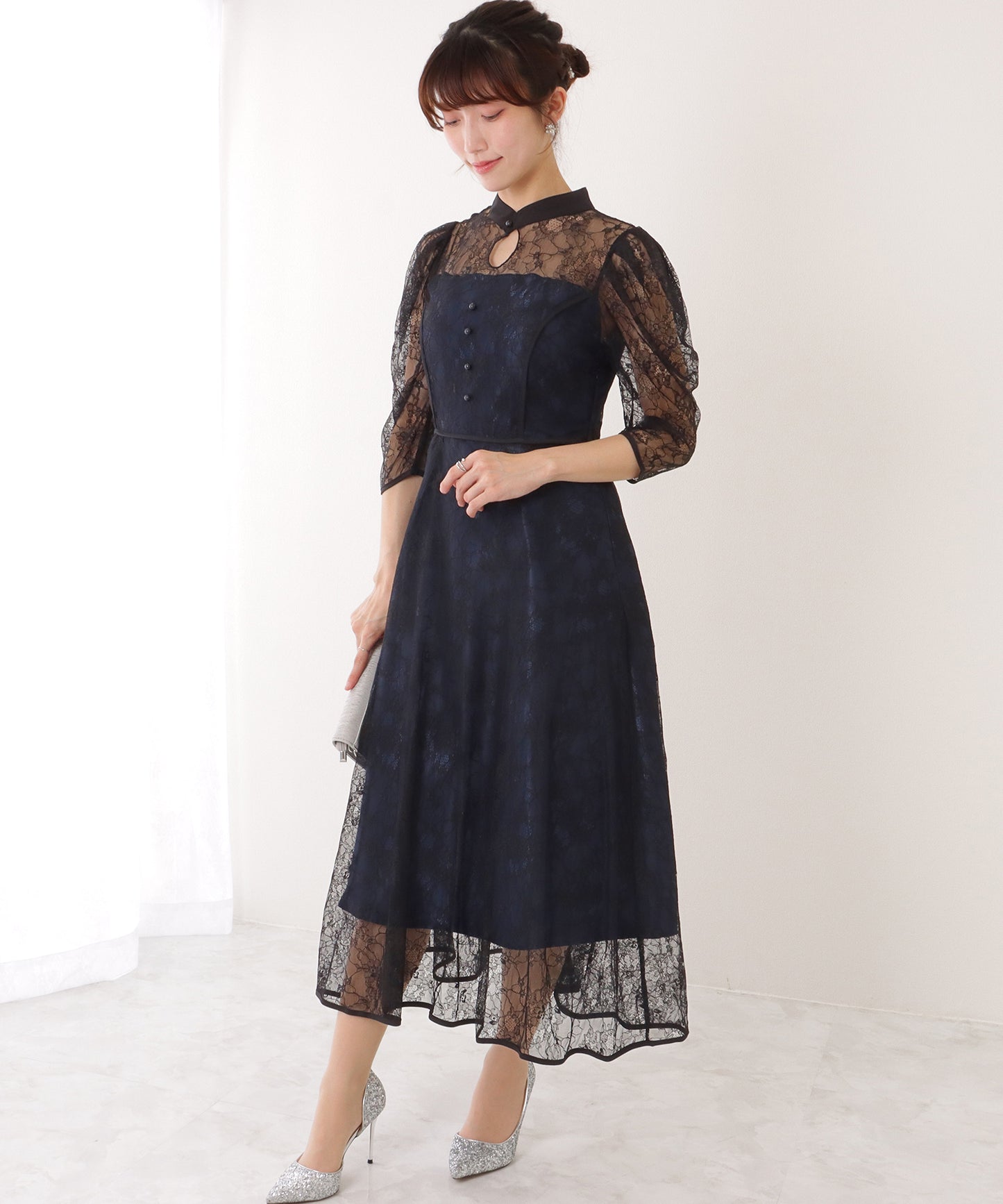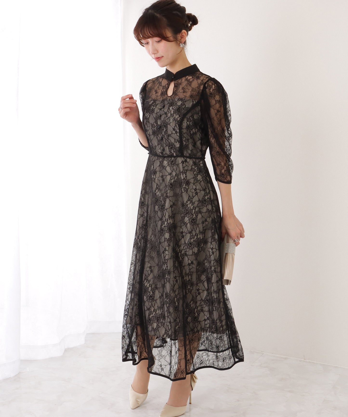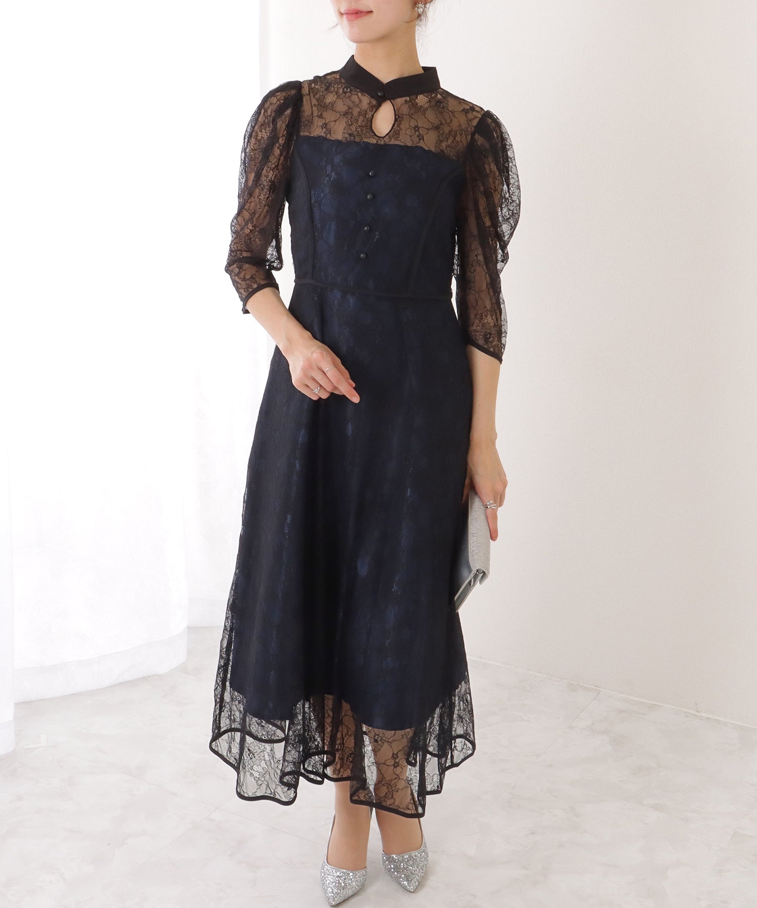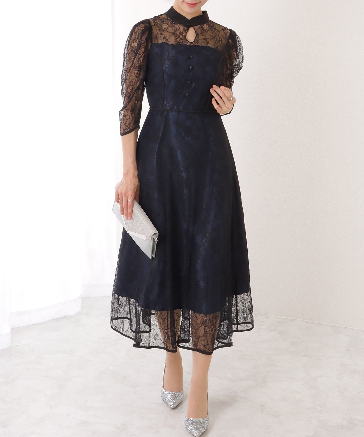7分袖 総レース 花柄 プチハイネック ワンピース