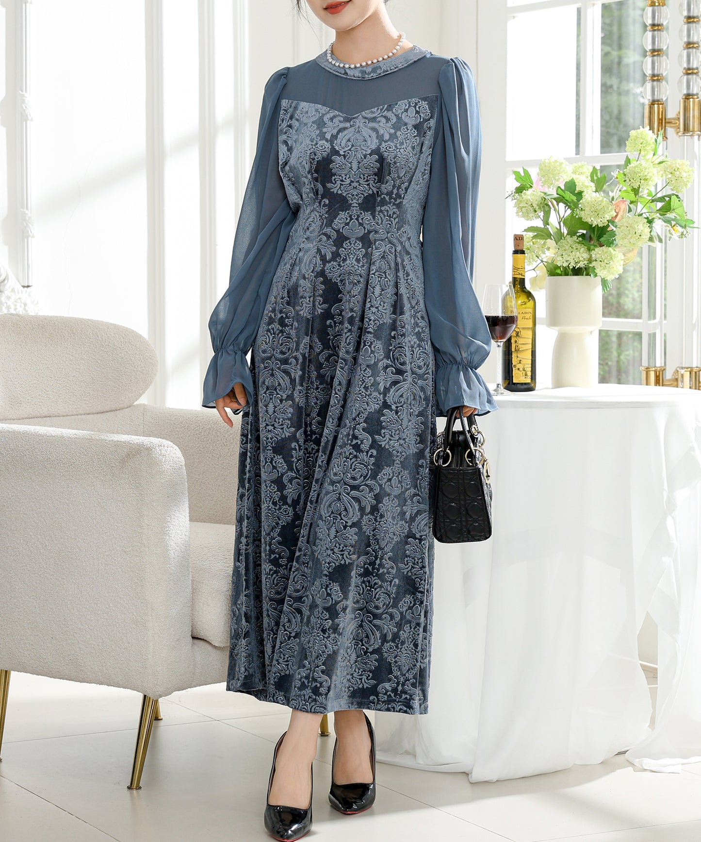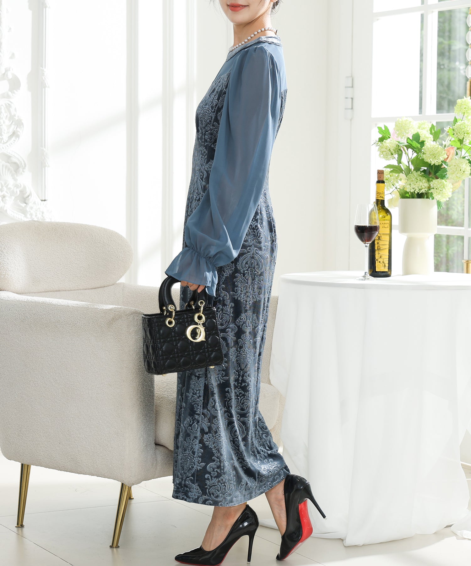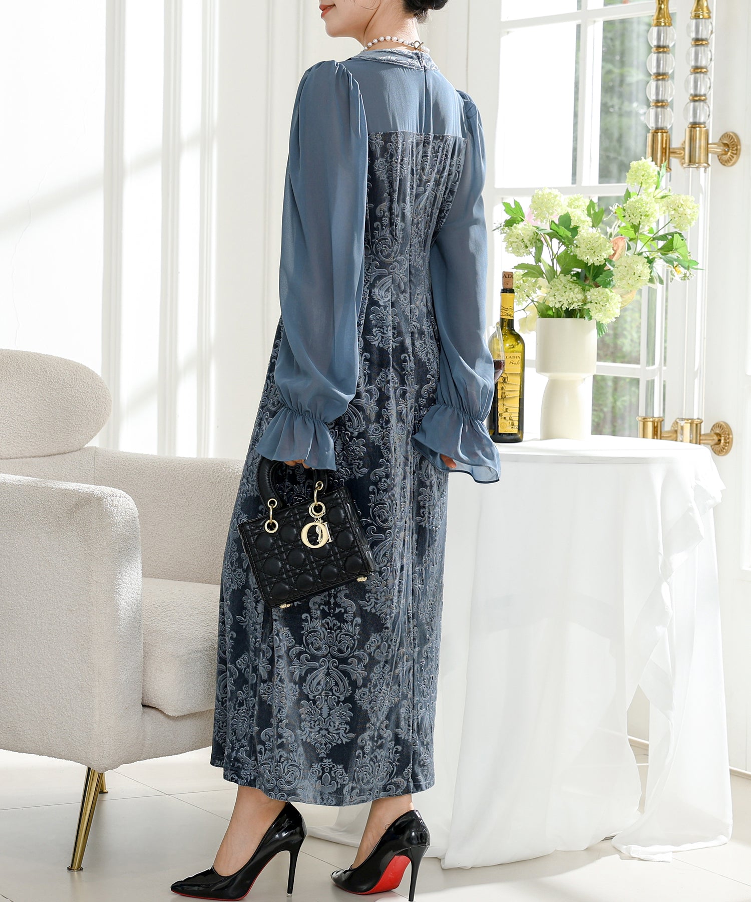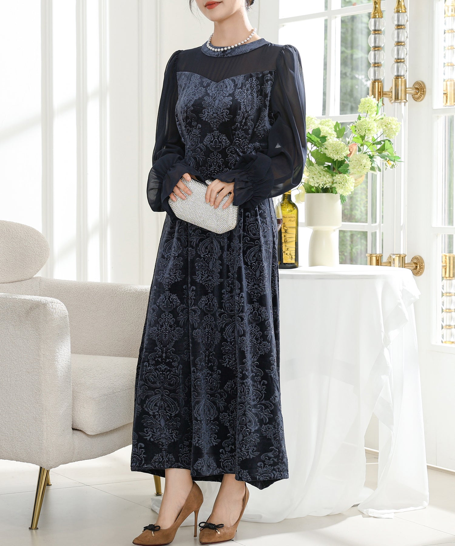 華やかなダマスク柄が、装いをエレガントに引き立てるマキシ丈ワンピース。