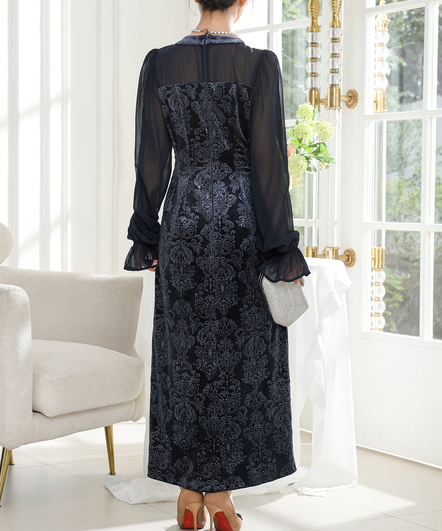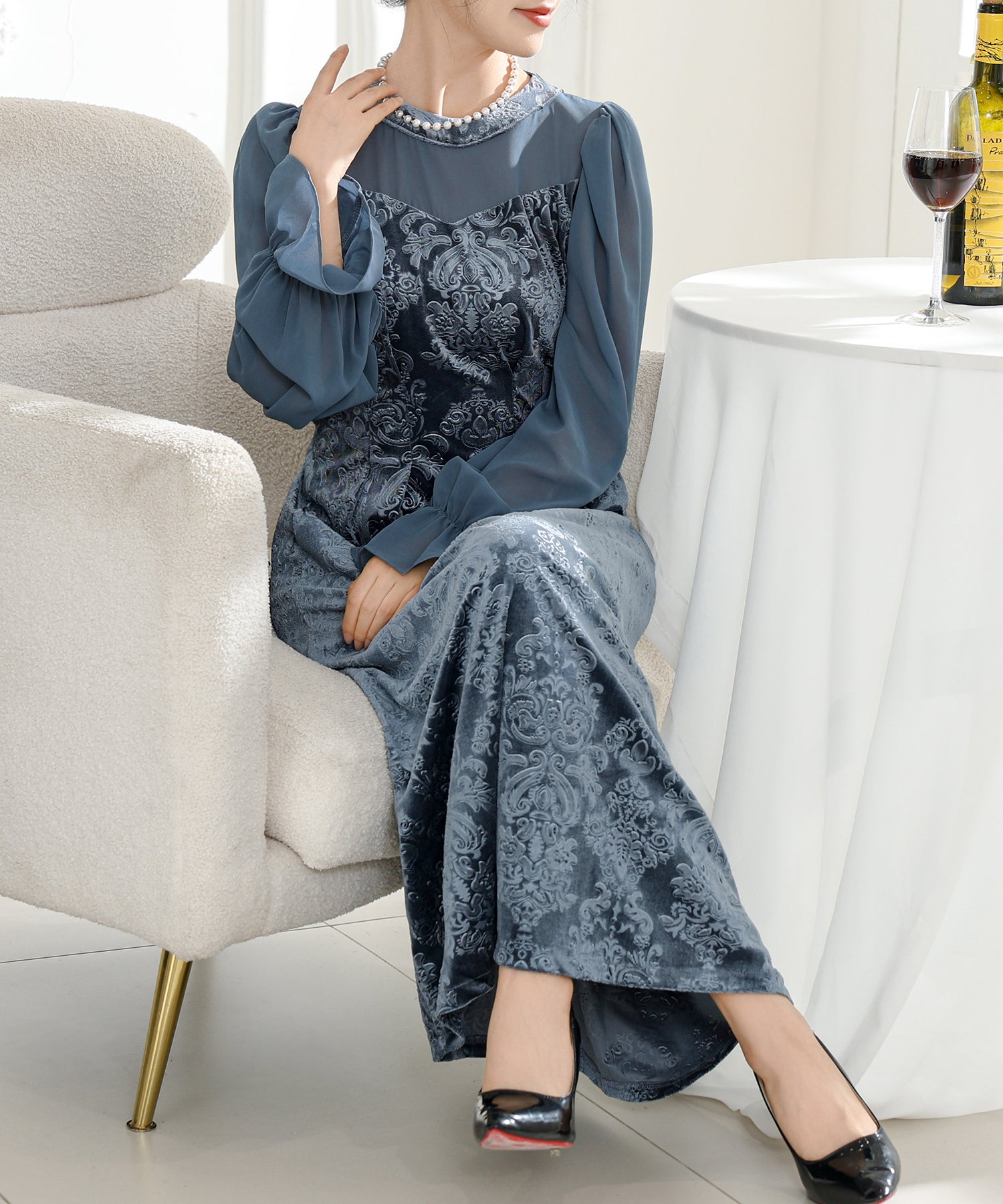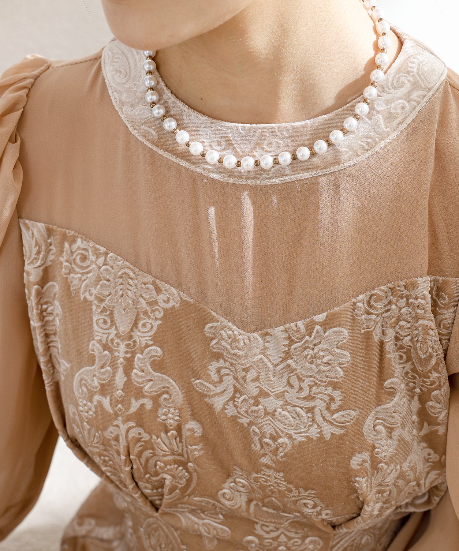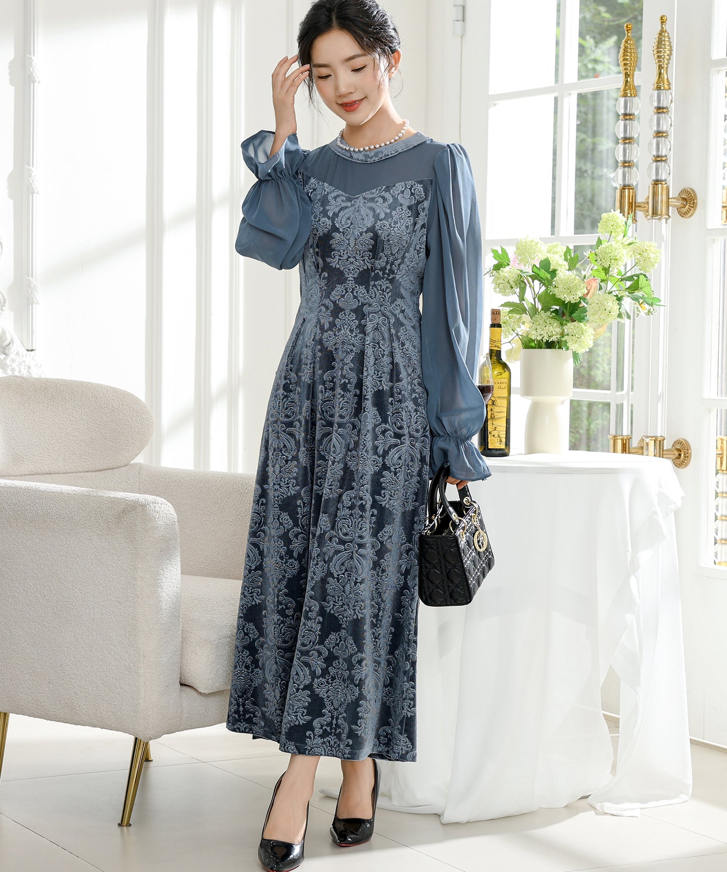 華やかなダマスク柄が、装いをエレガントに引き立てるマキシ丈ワンピース。