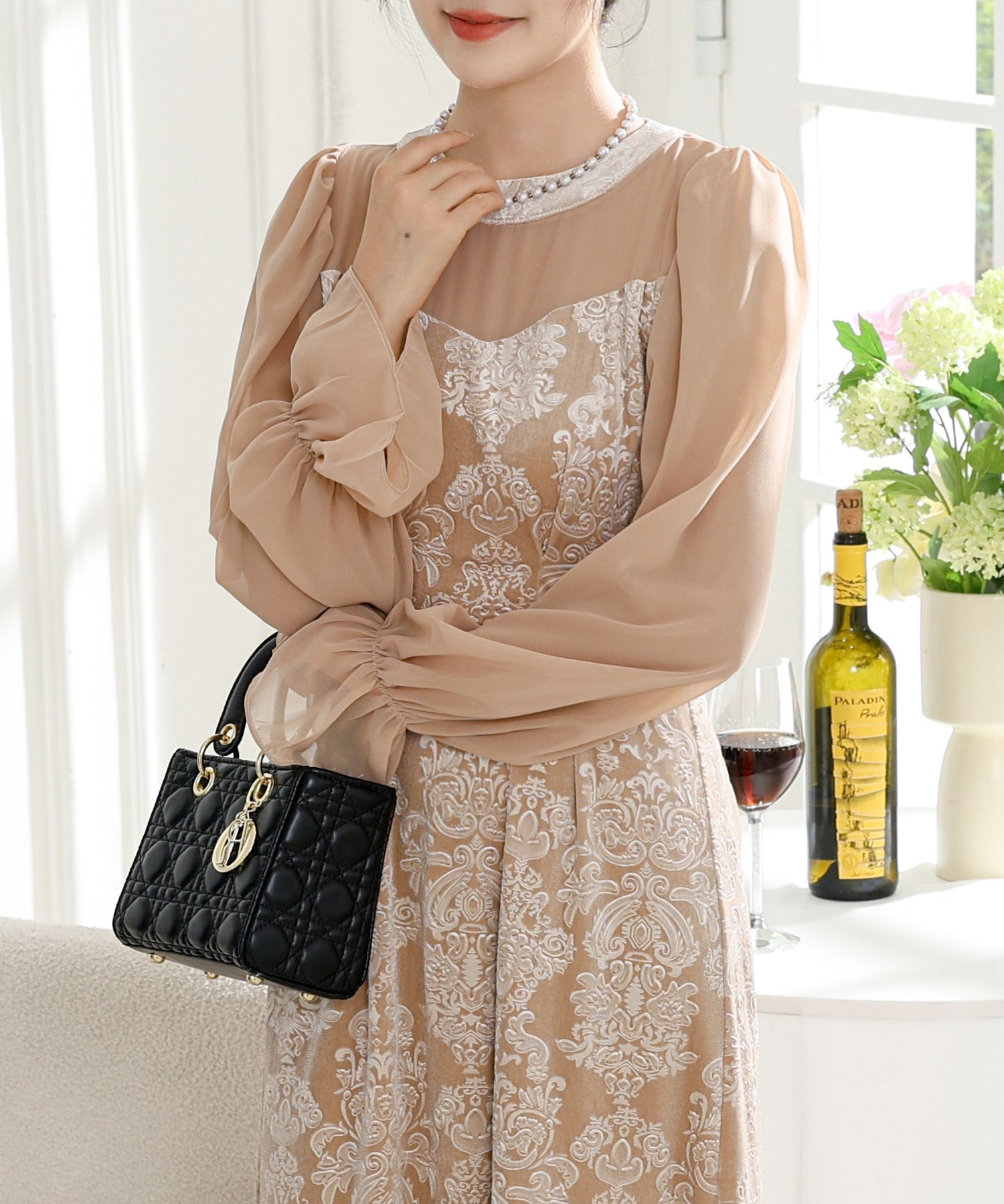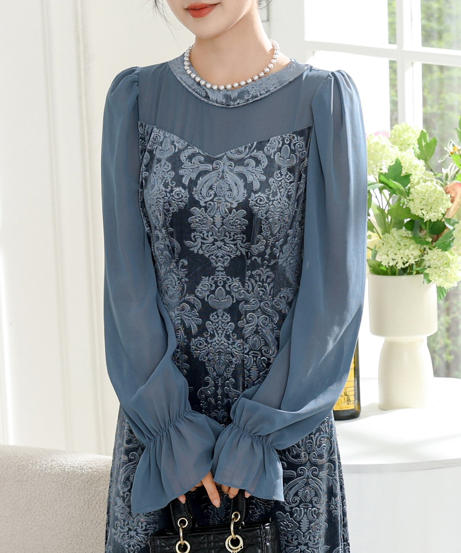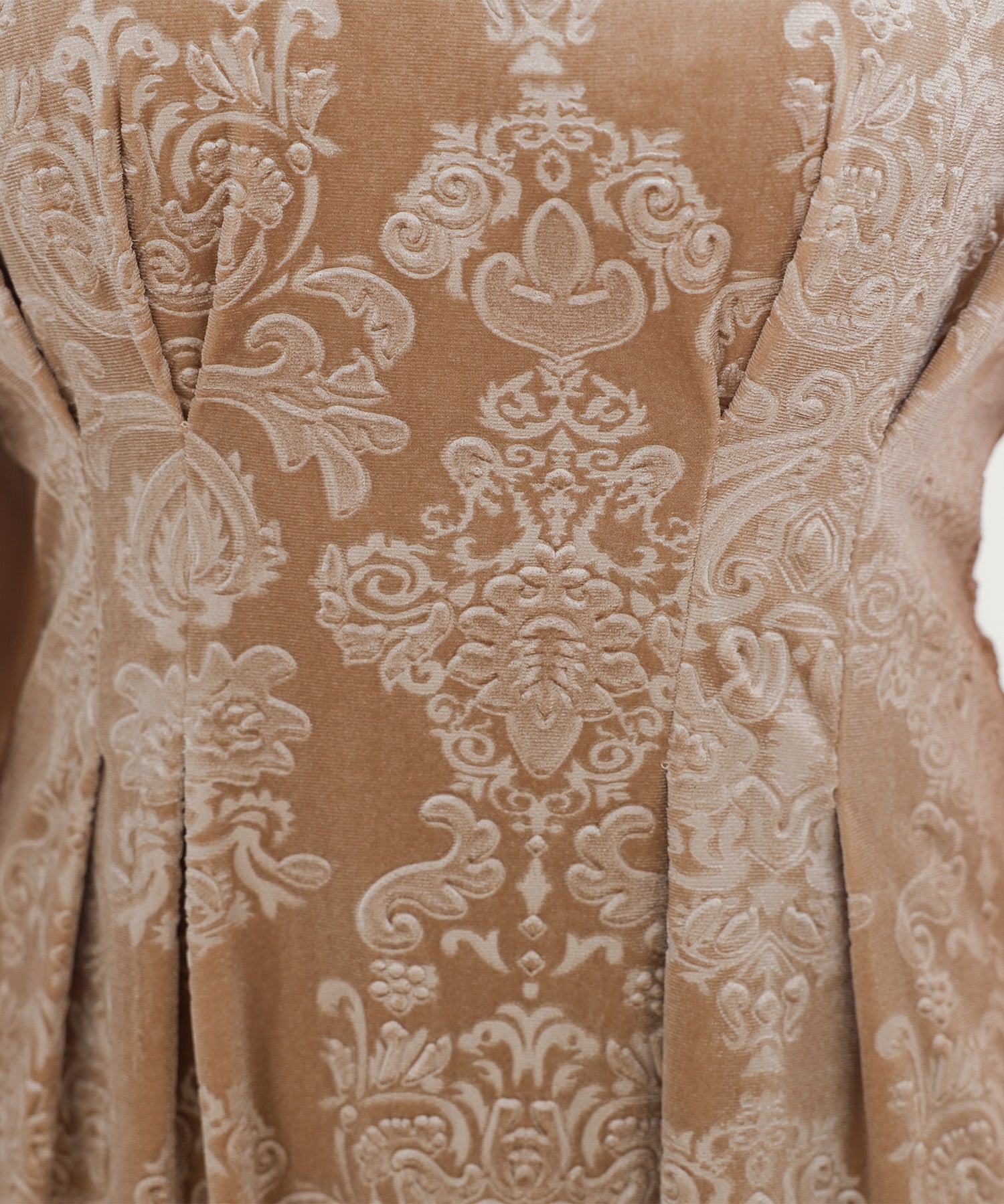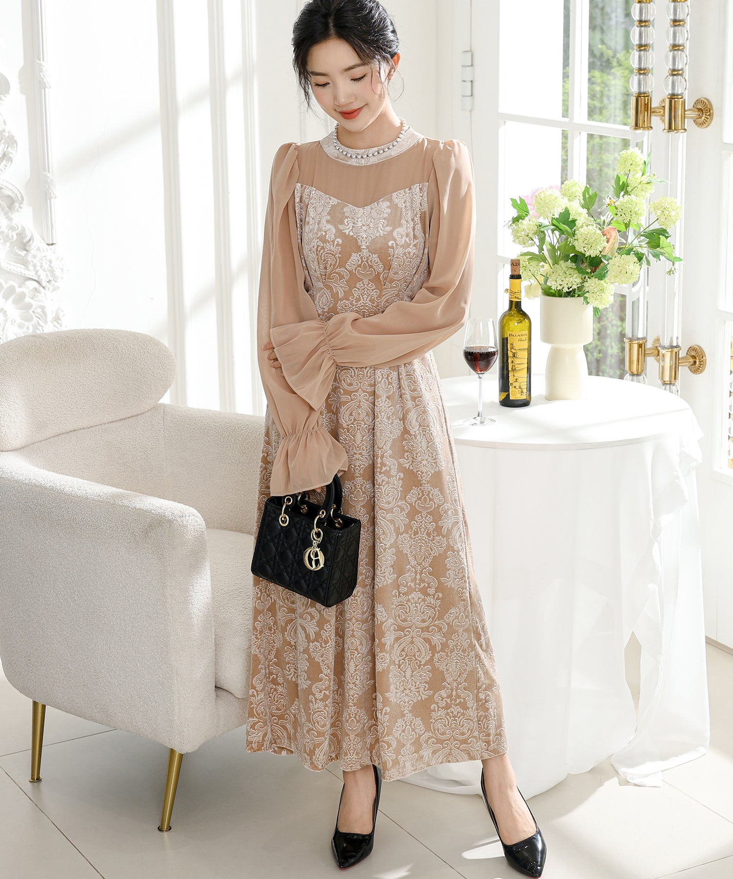 華やかなダマスク柄が、装いをエレガントに引き立てるマキシ丈ワンピース。