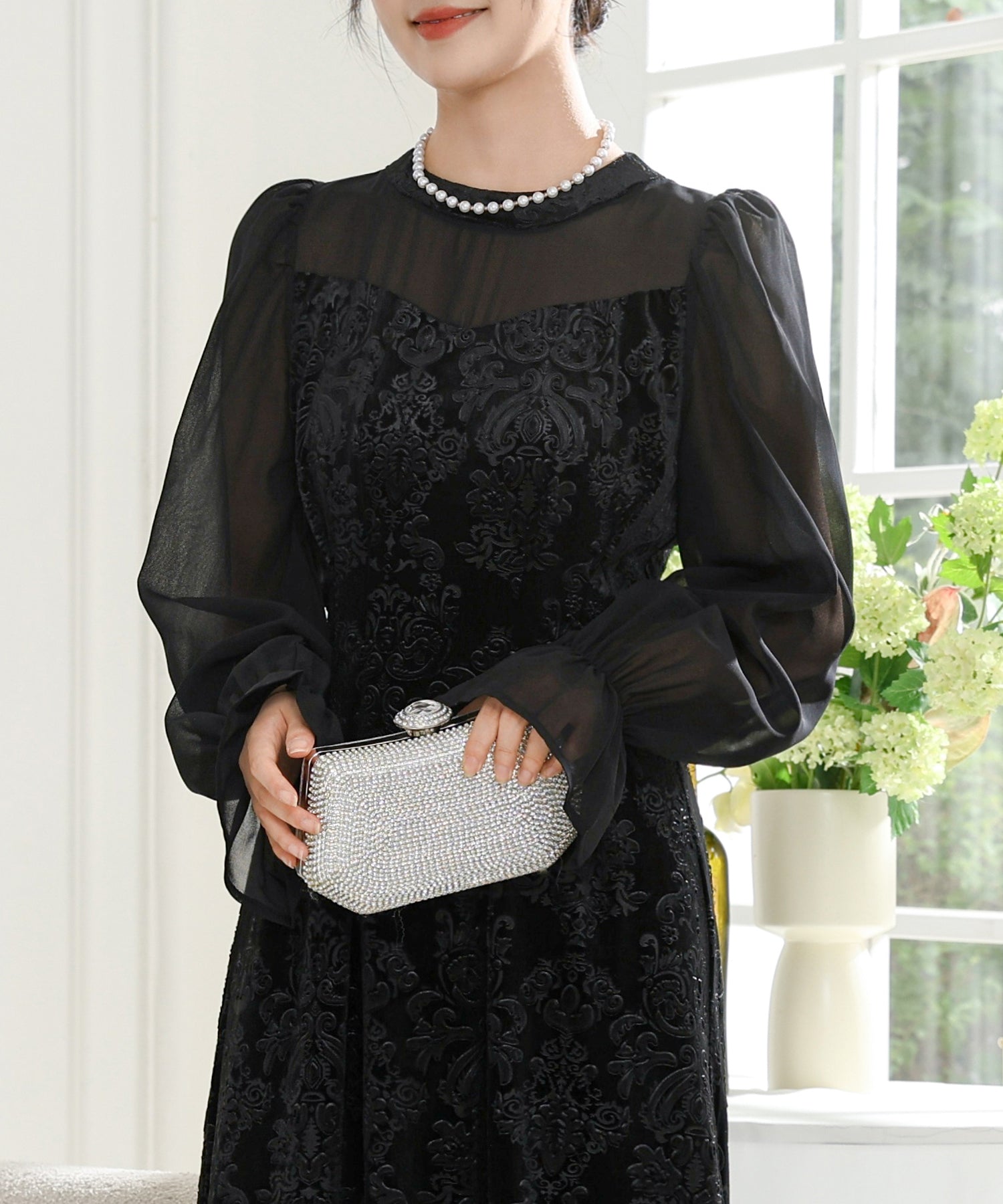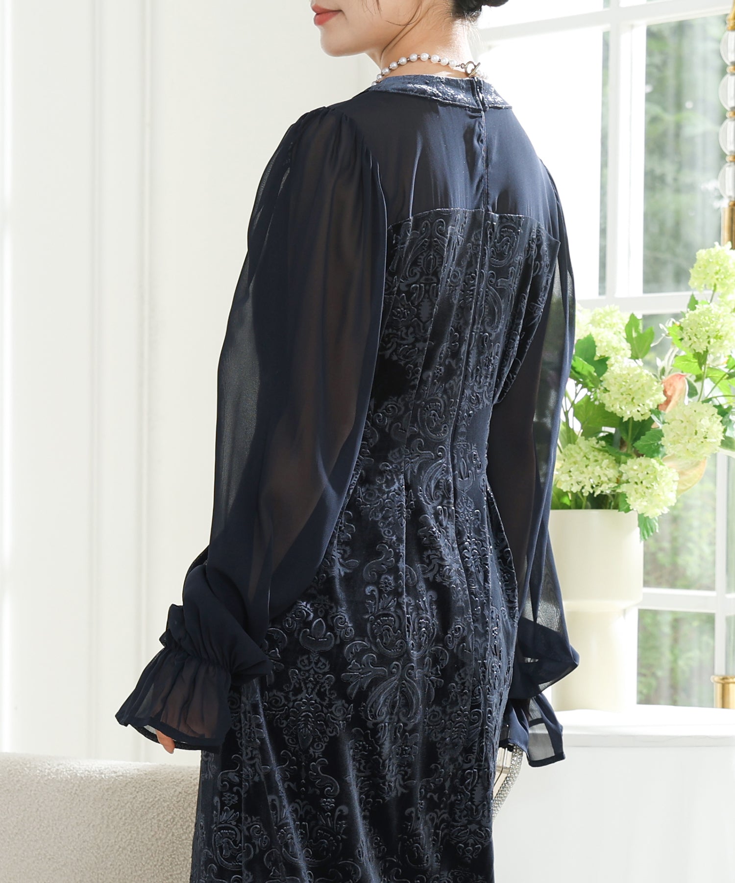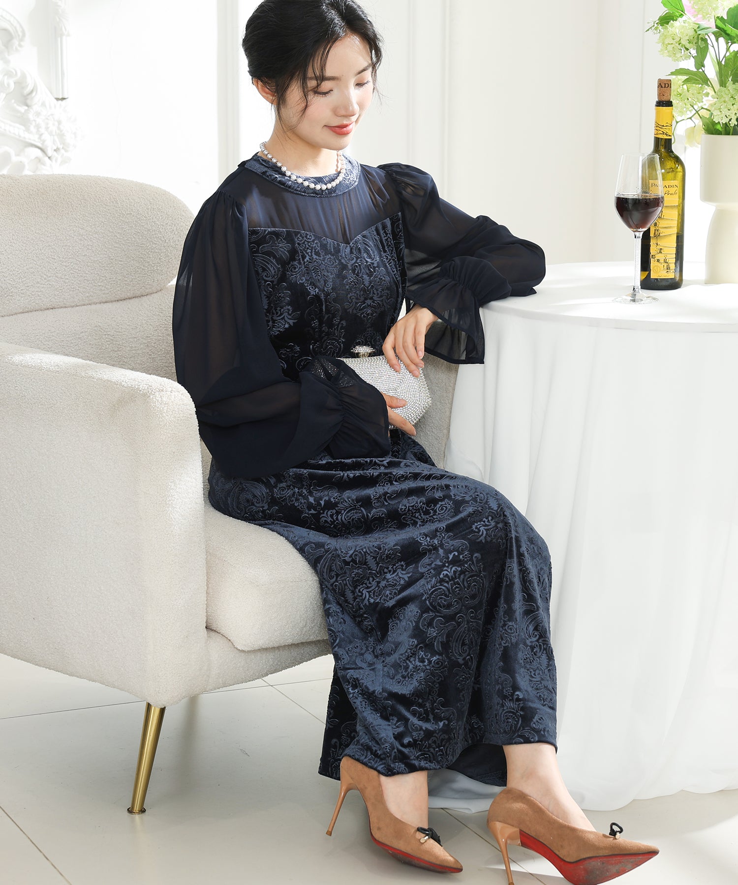 ベロア シアー フリルケープ付き ノースリーブ ドレス 3点セット