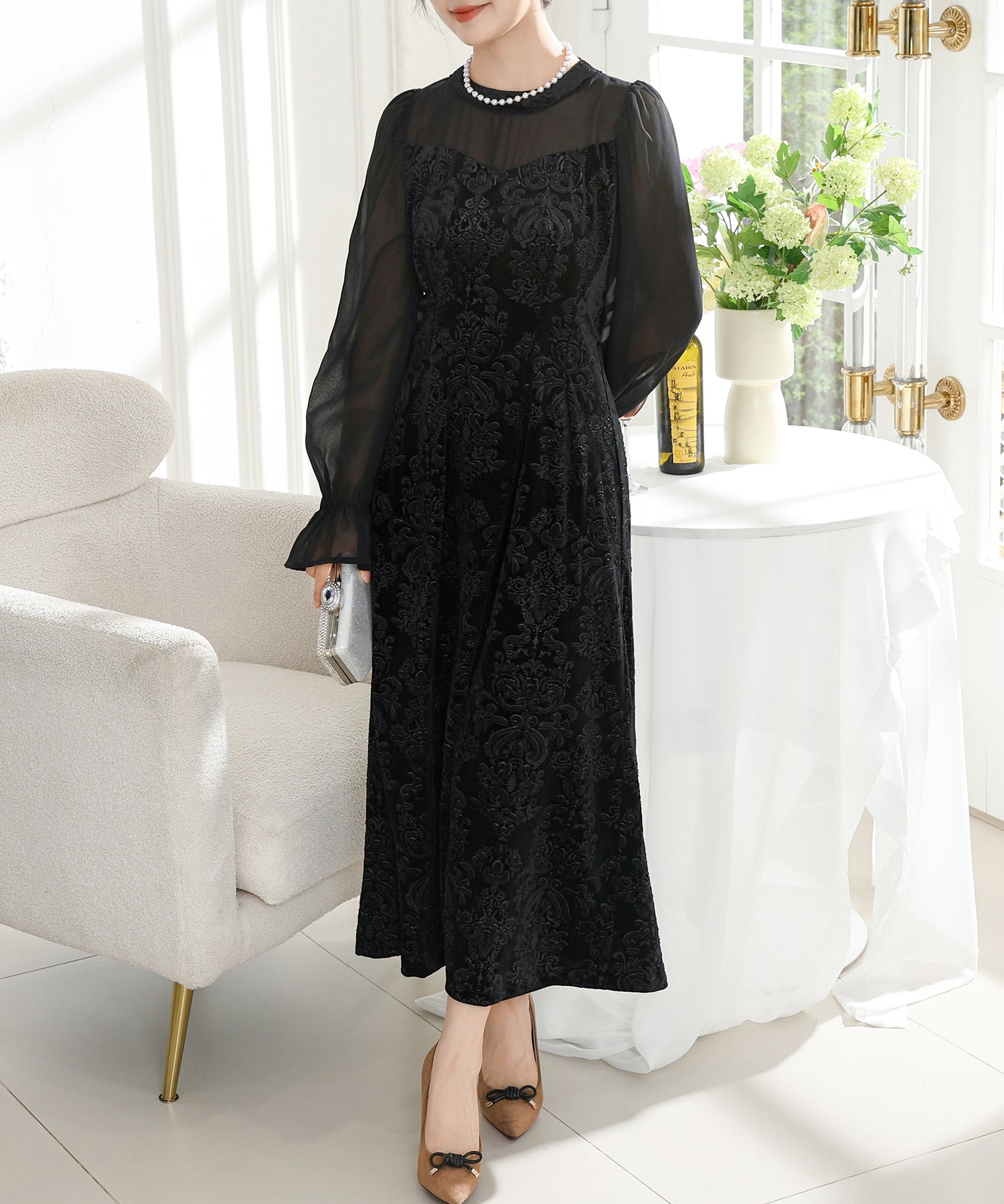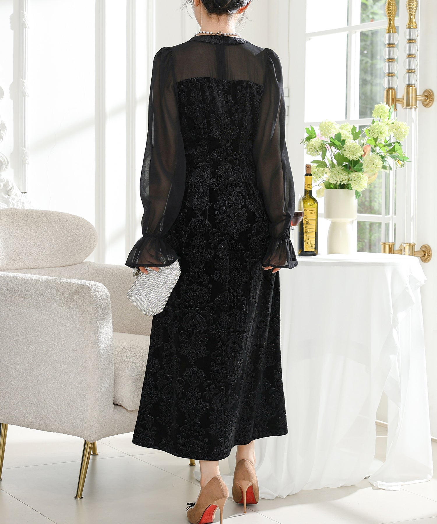 チュールフリル シアー 切り替え フレア ロング ドレス