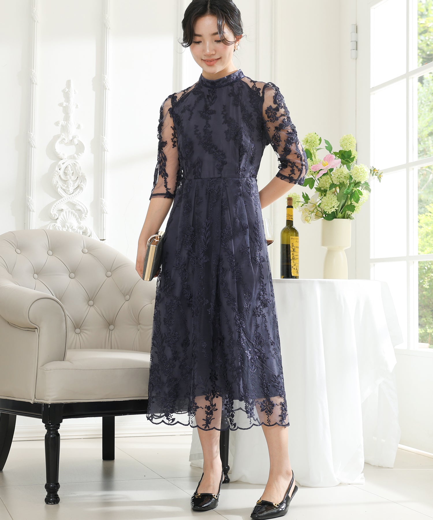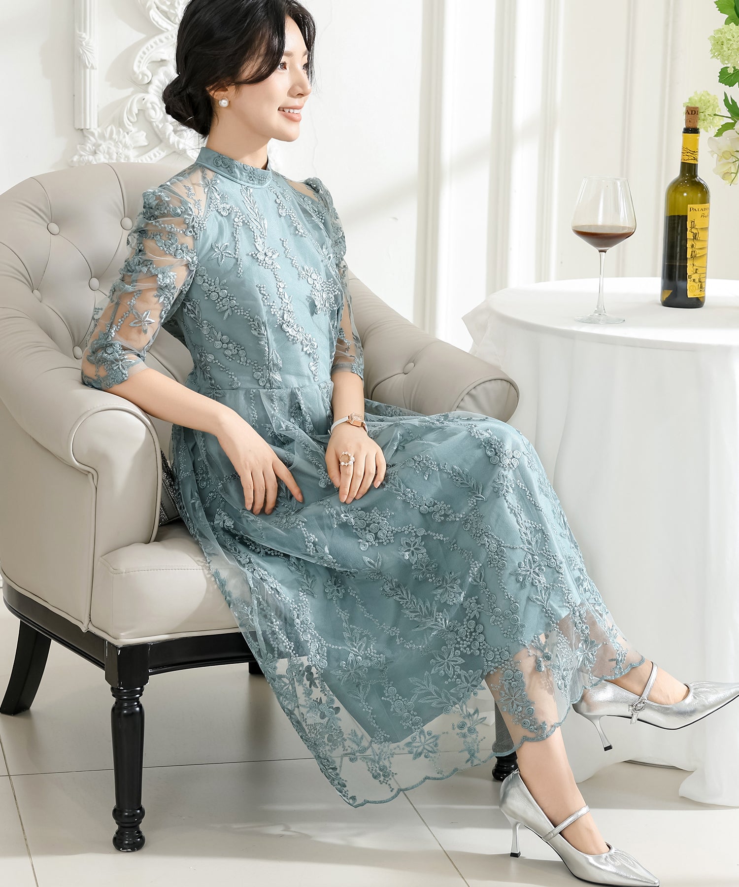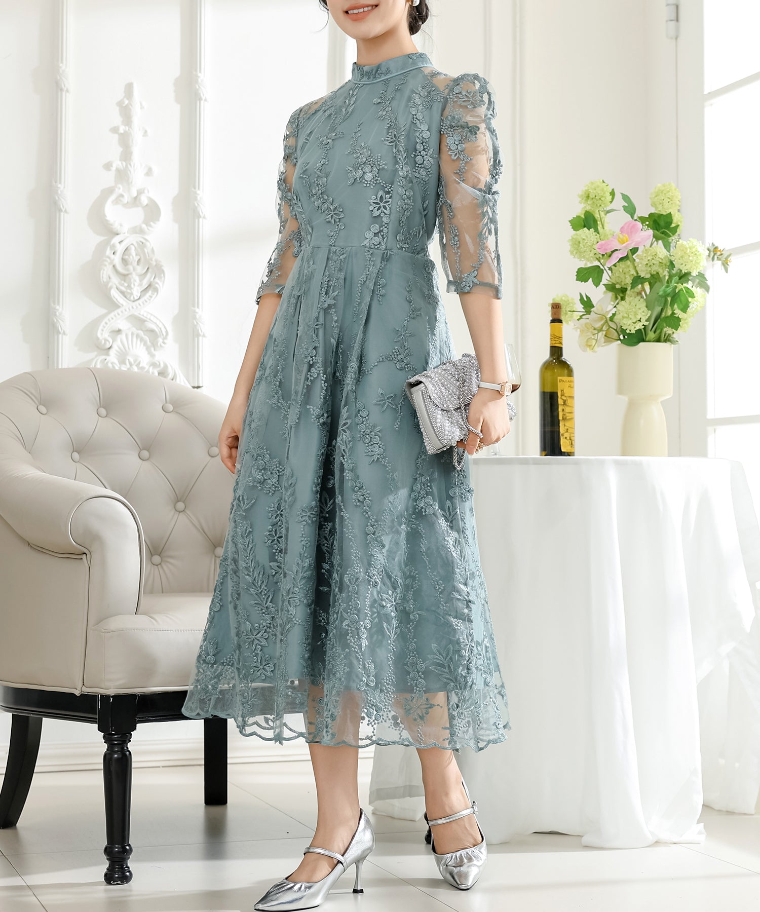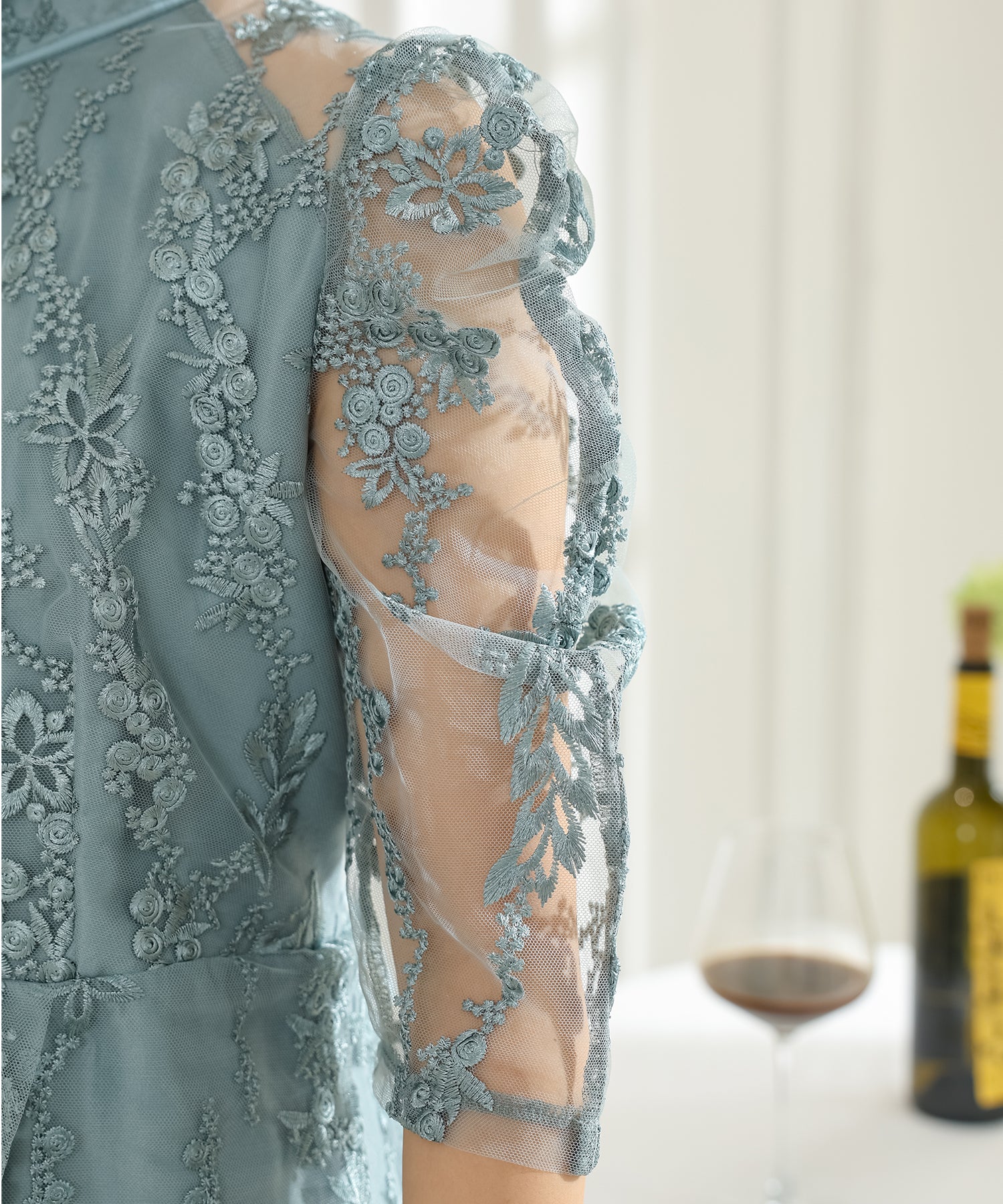 ドレス感のある長めの裾丈で、結婚式やパーティーなどのオケージョンシーンにも映える1枚です。