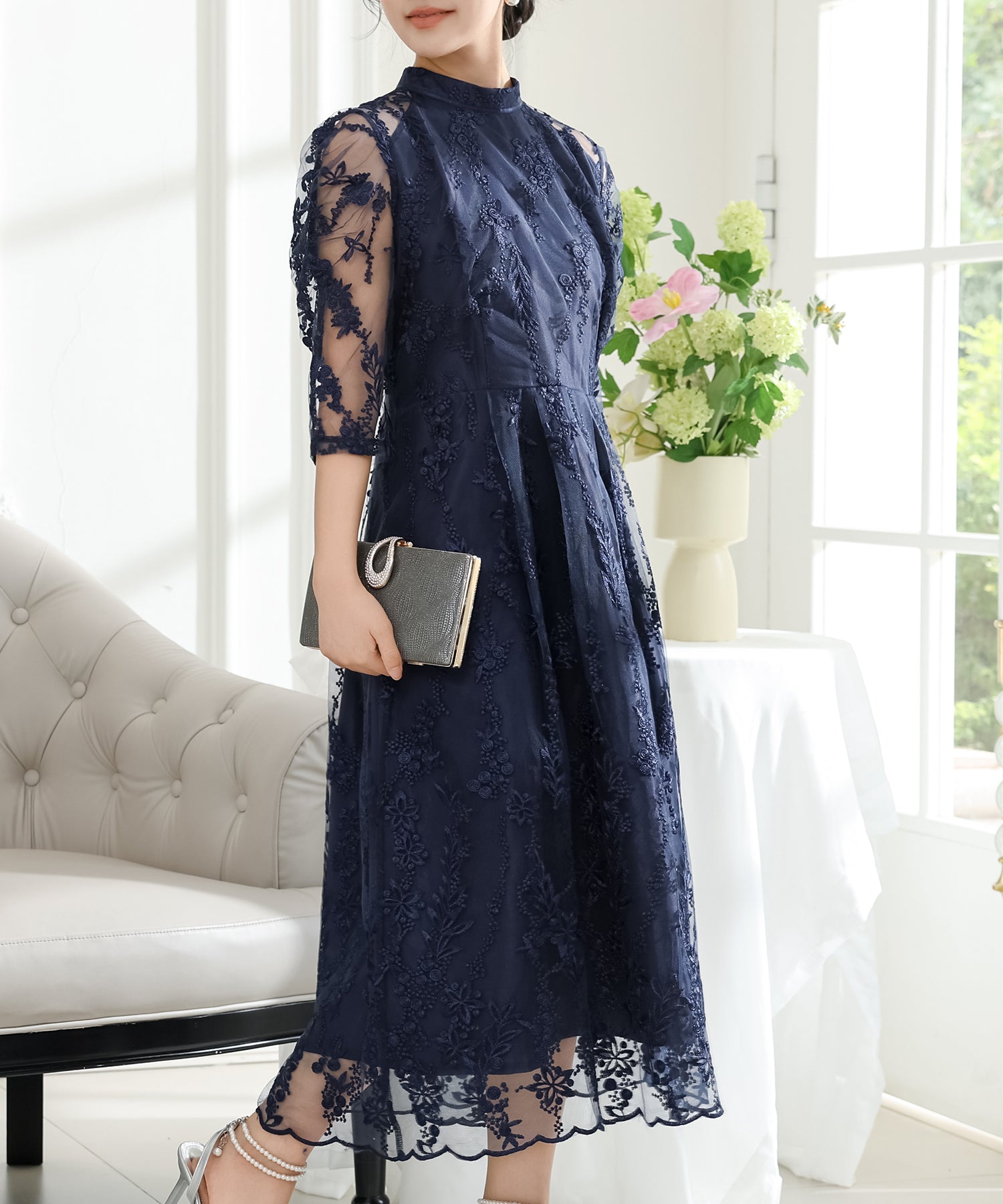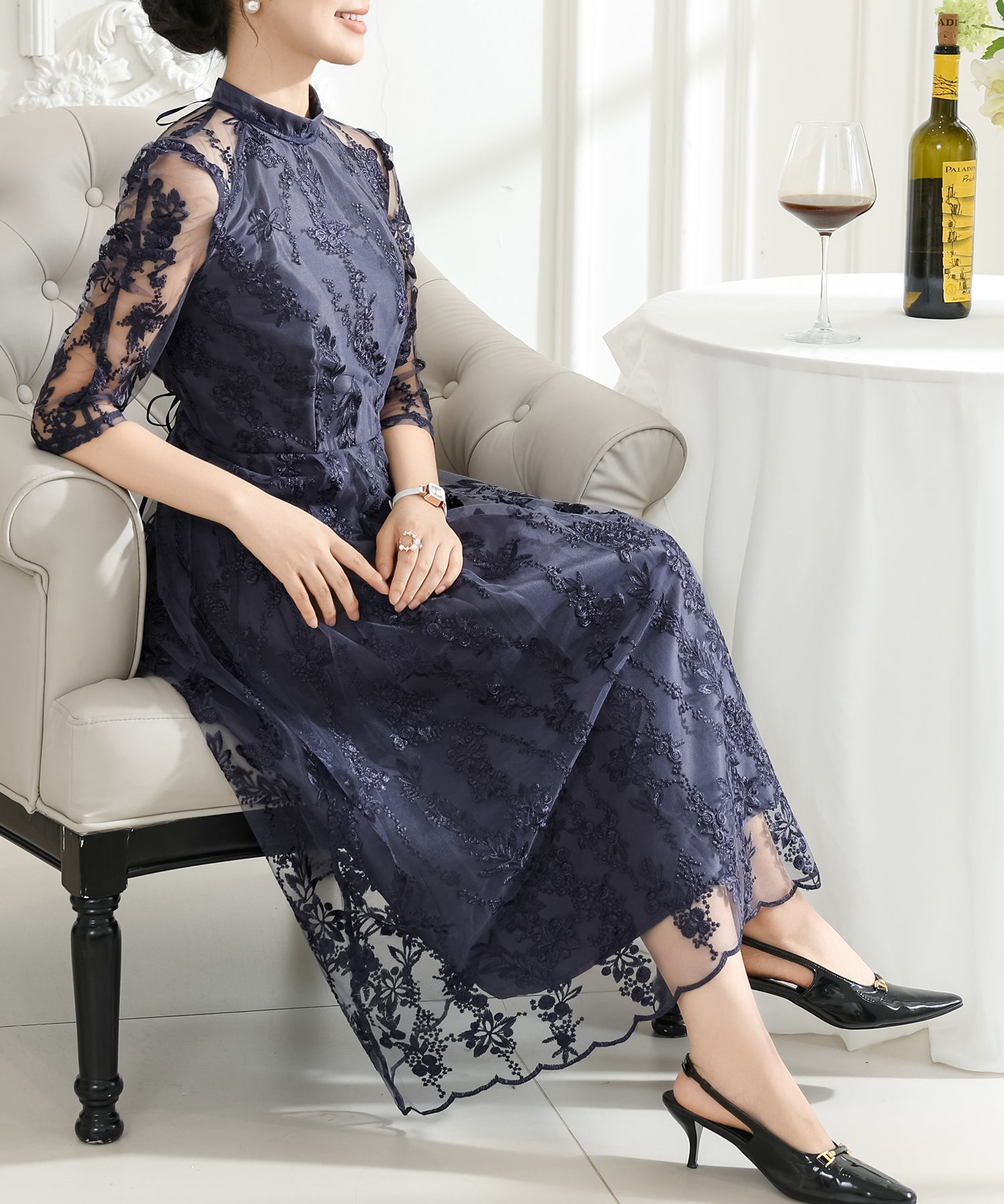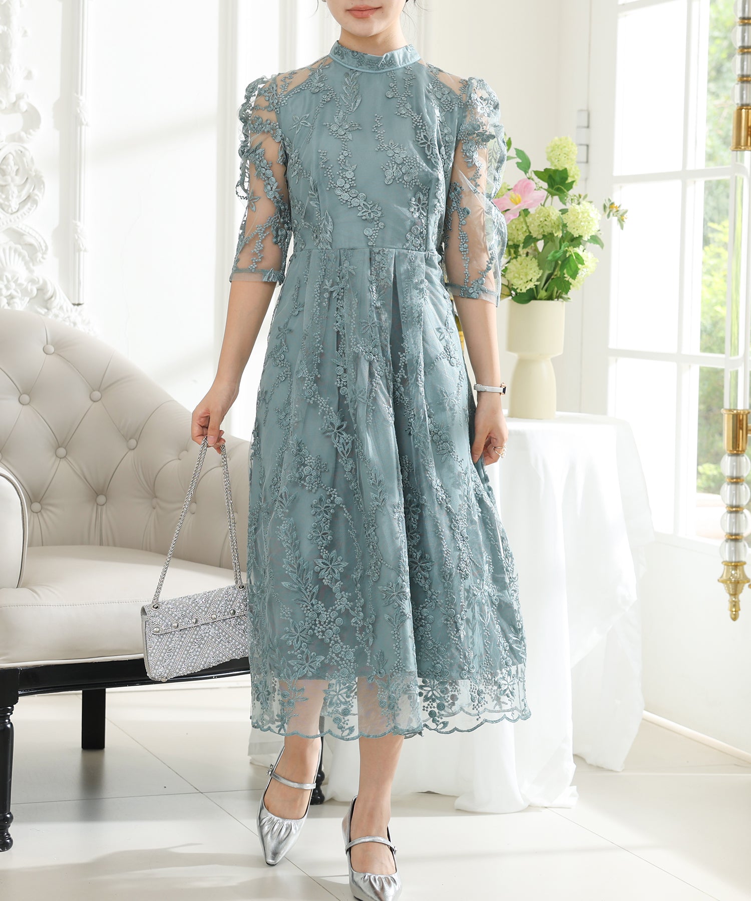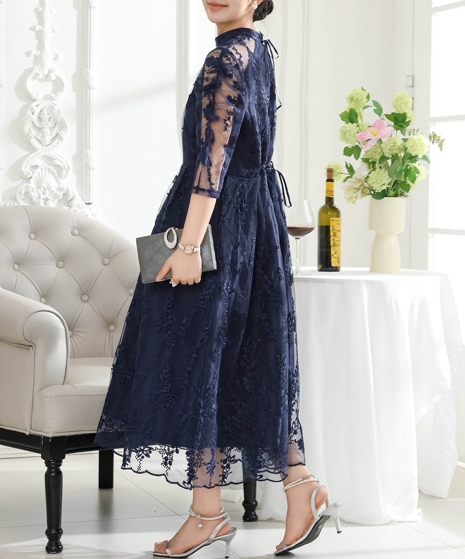 ドレス感のある長めの裾丈で、結婚式やパーティーなどのオケージョンシーンにも映える1枚です。