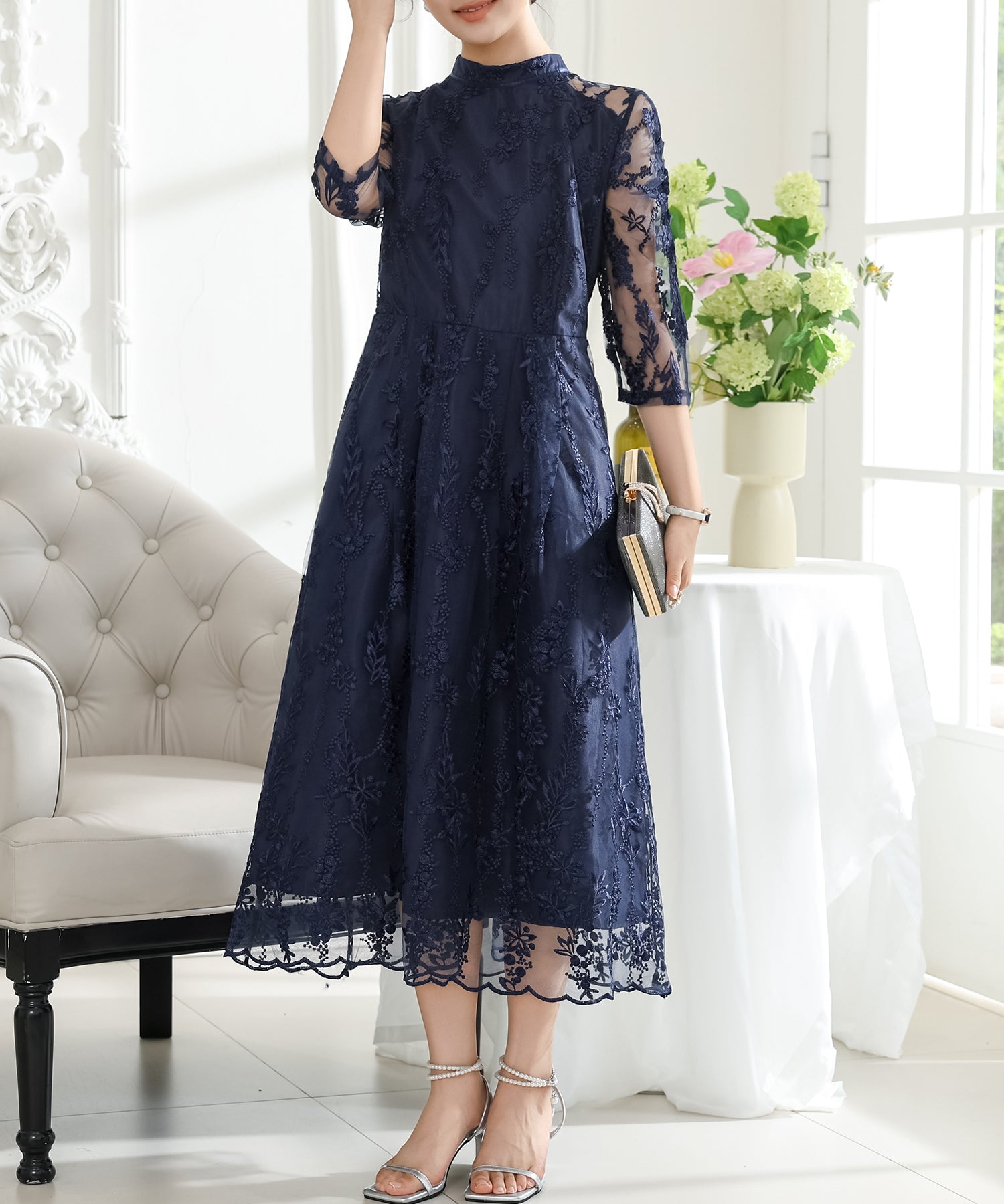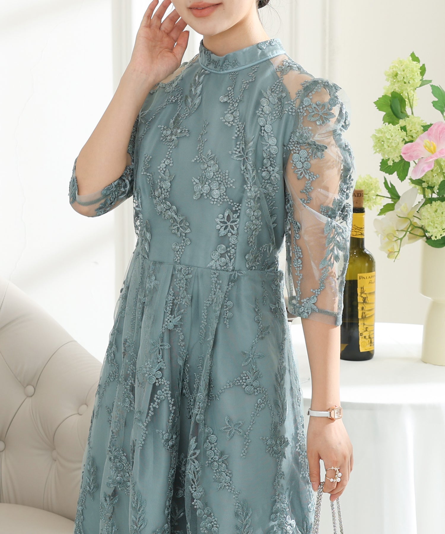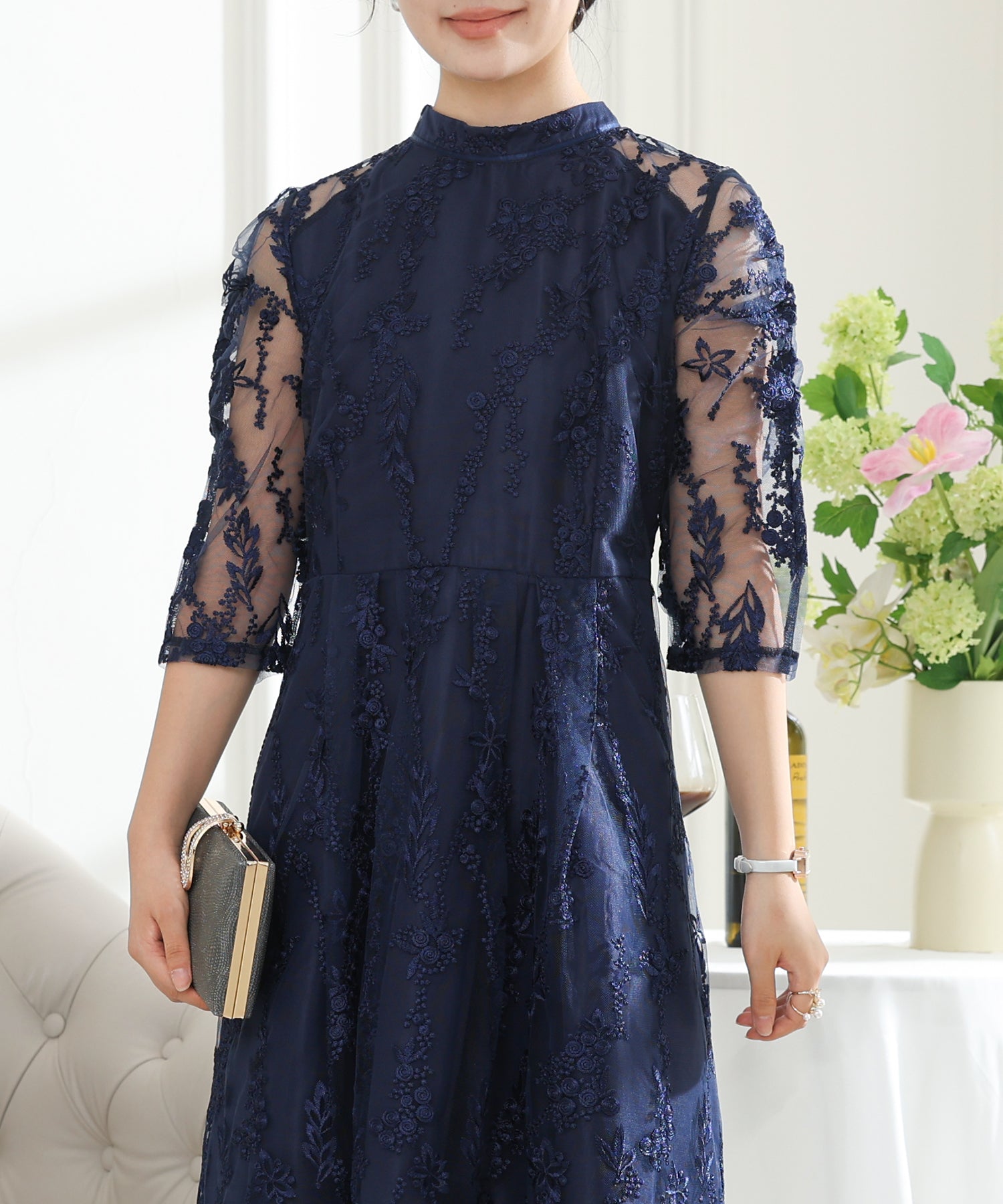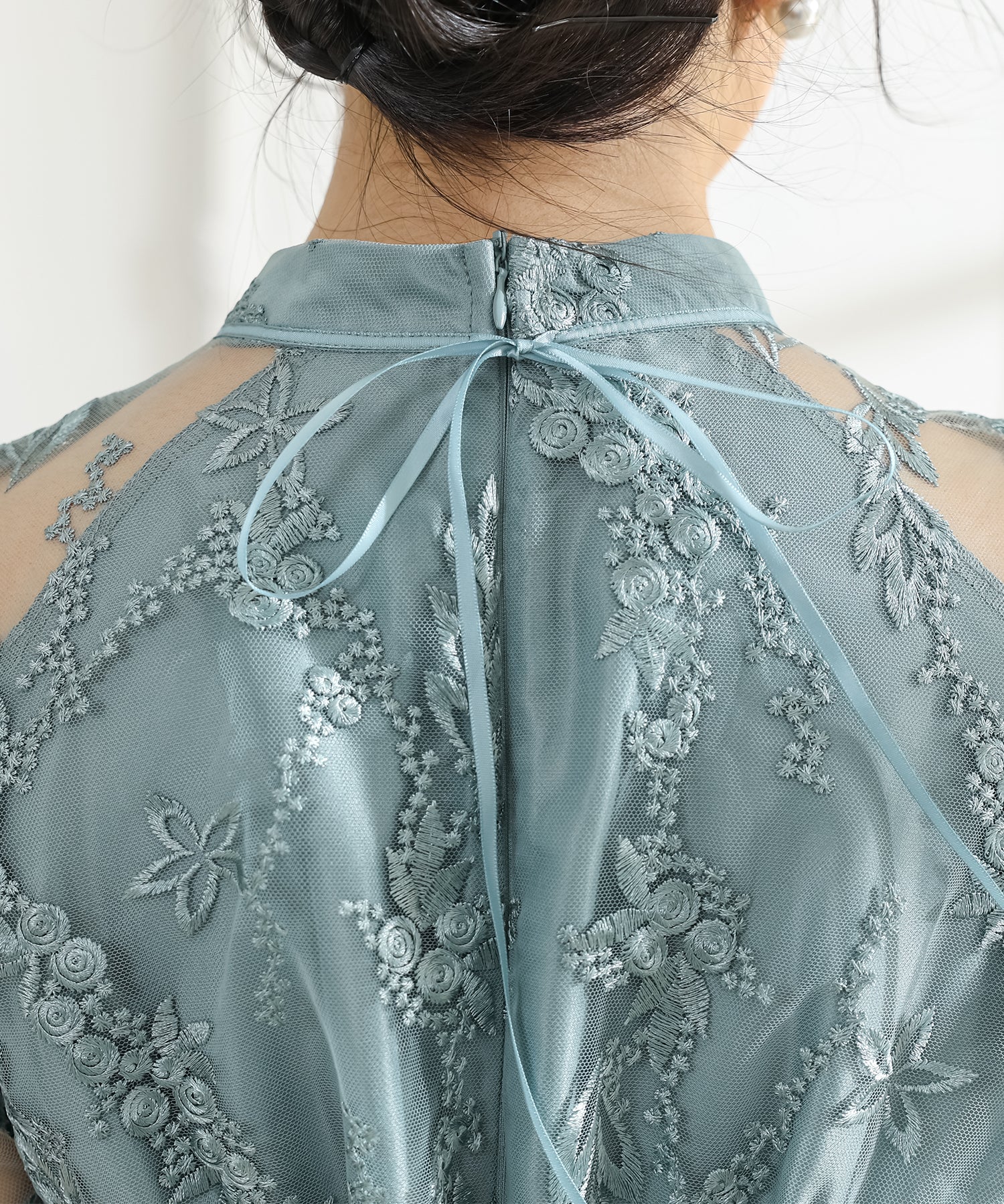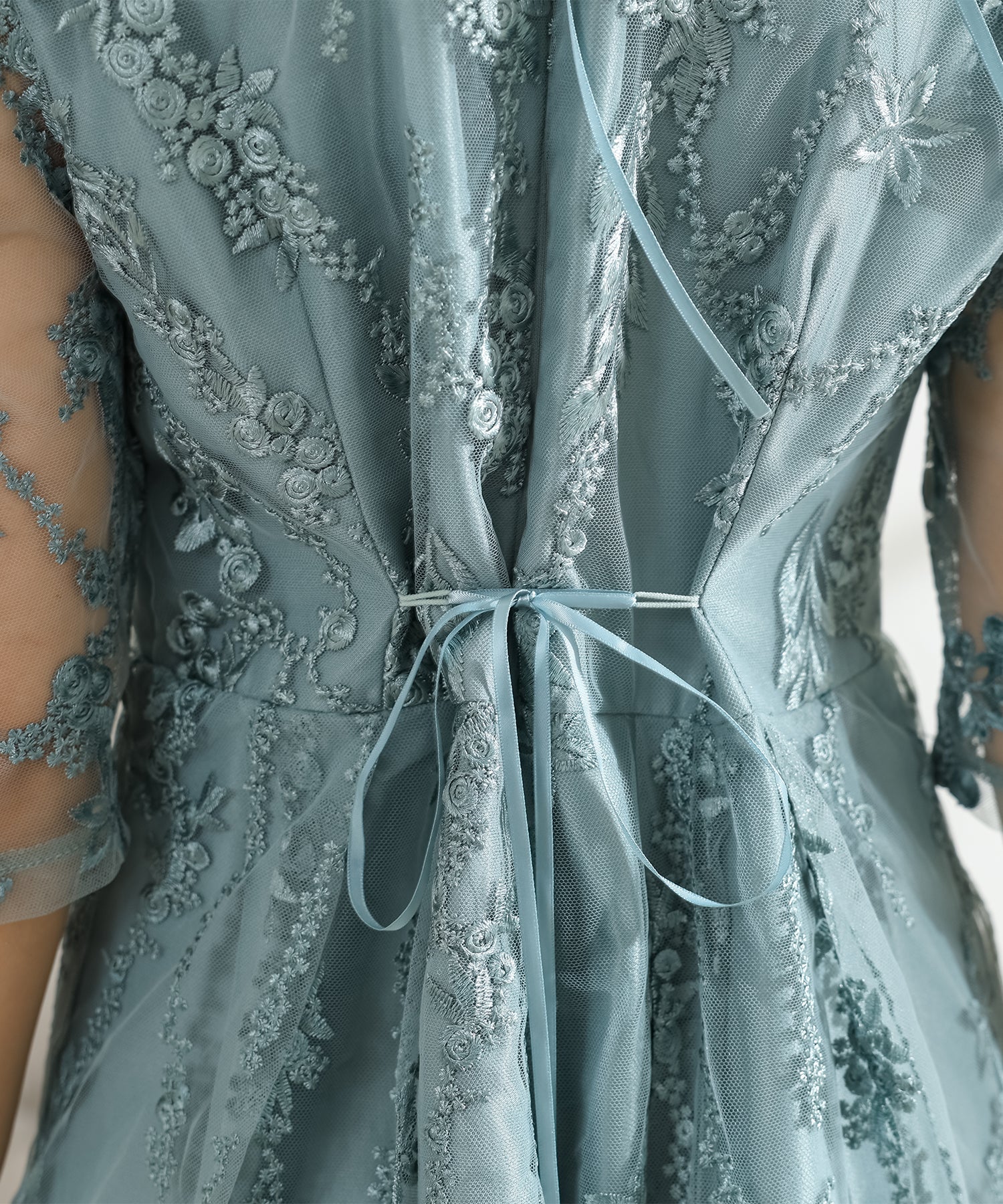 ドレス感のある長めの裾丈で、結婚式やパーティーなどのオケージョンシーンにも映える1枚です。