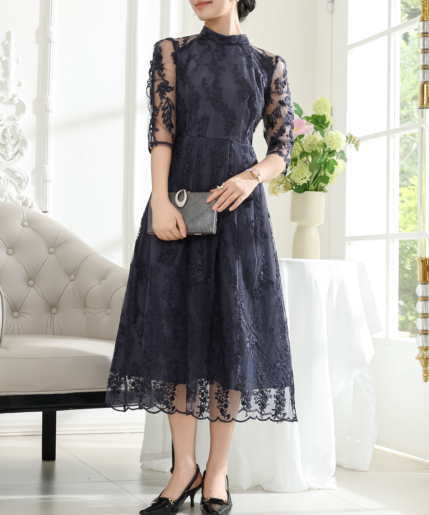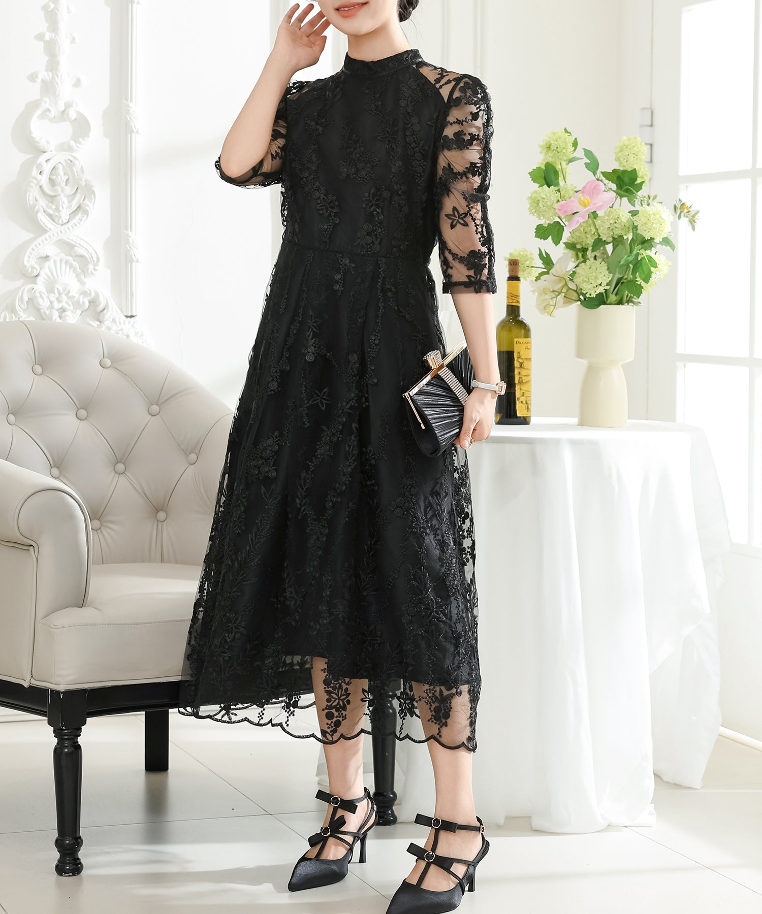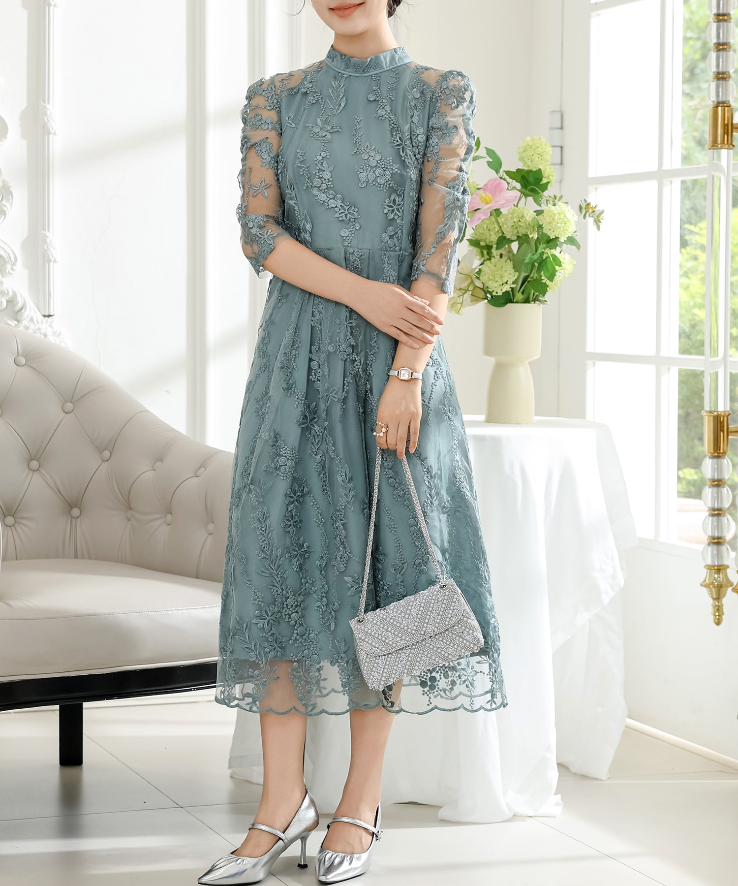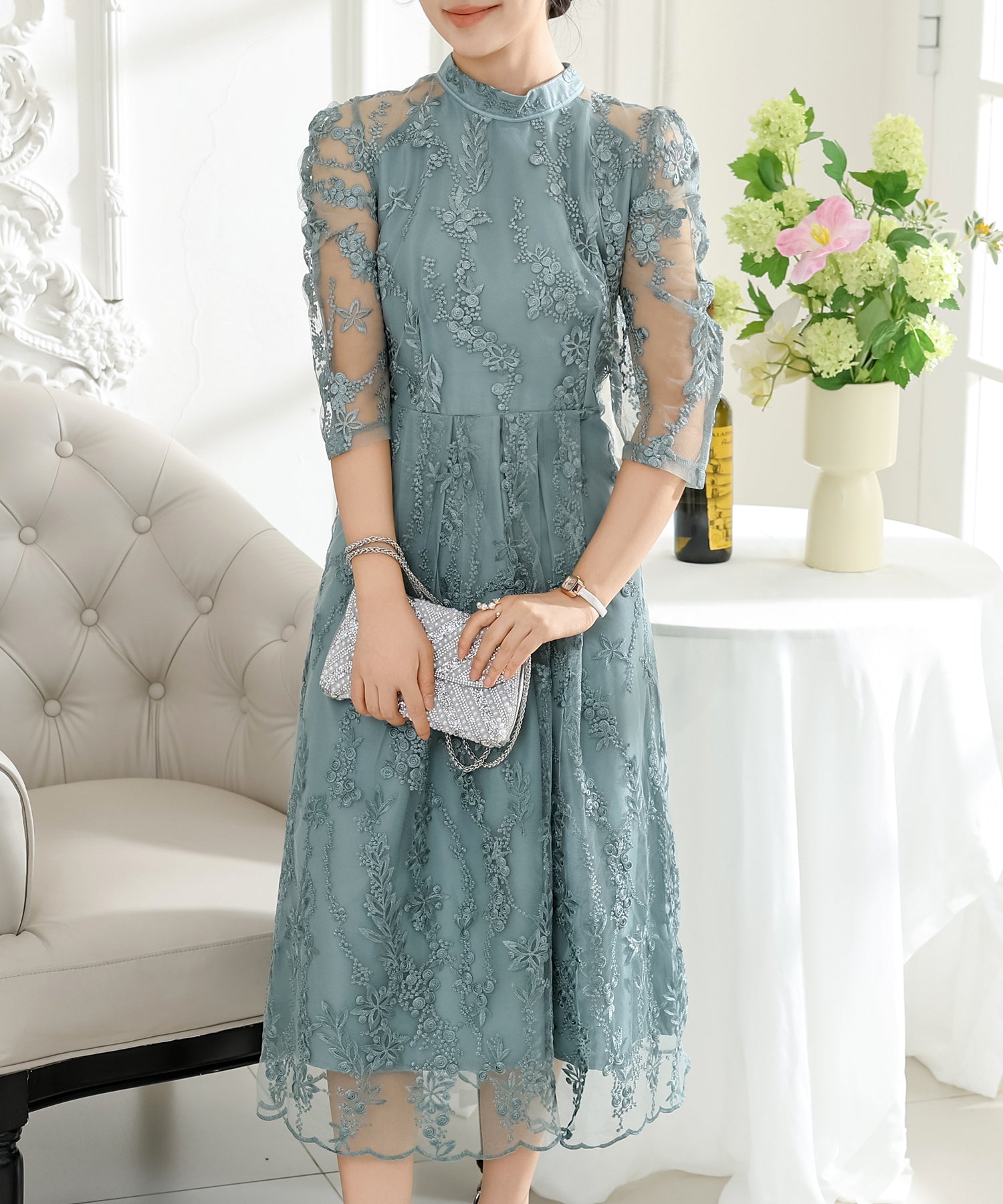 ドレス感のある長めの裾丈で、結婚式やパーティーなどのオケージョンシーンにも映える1枚です。