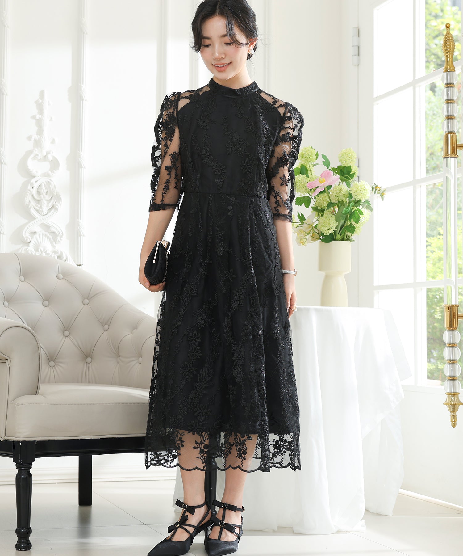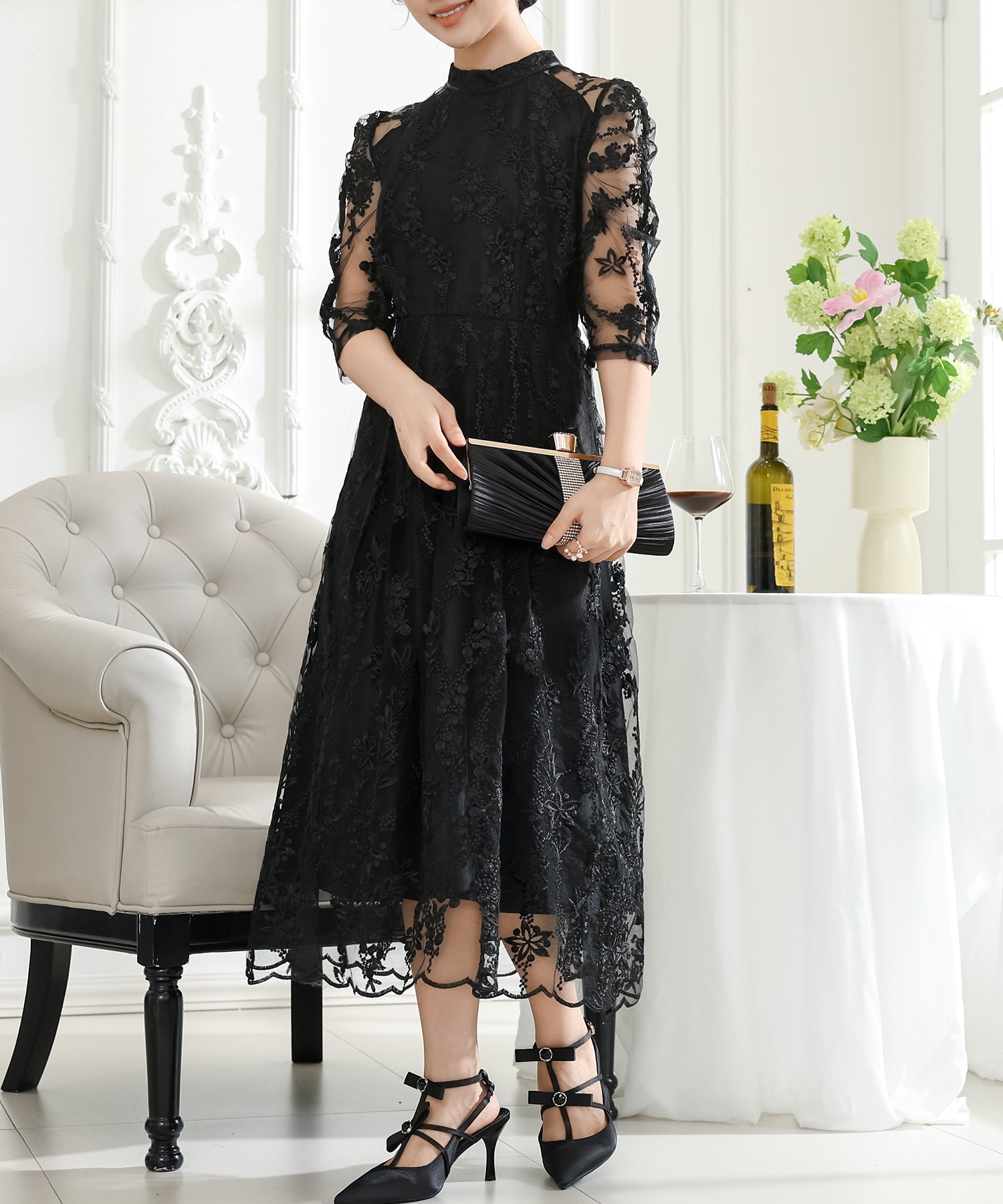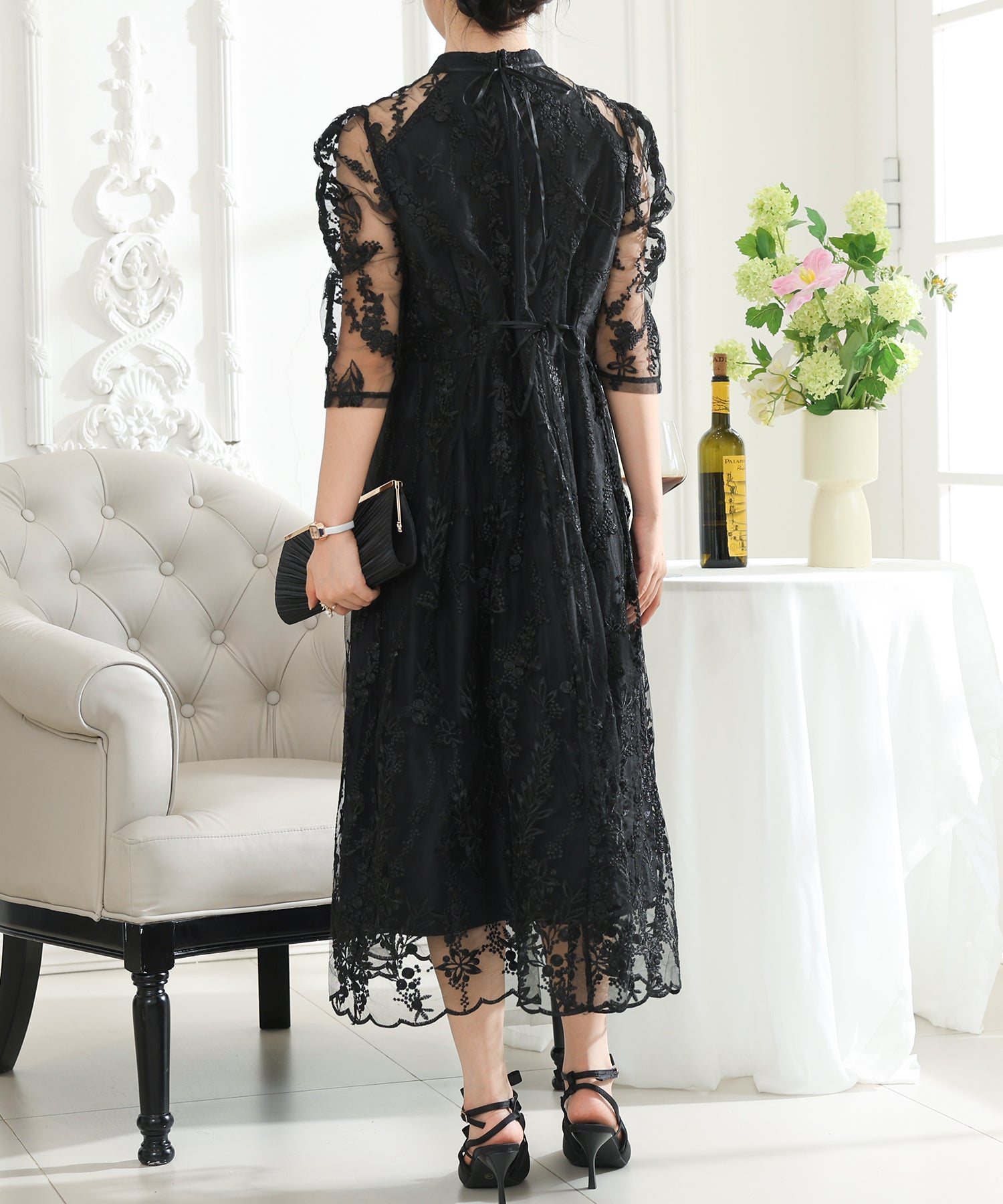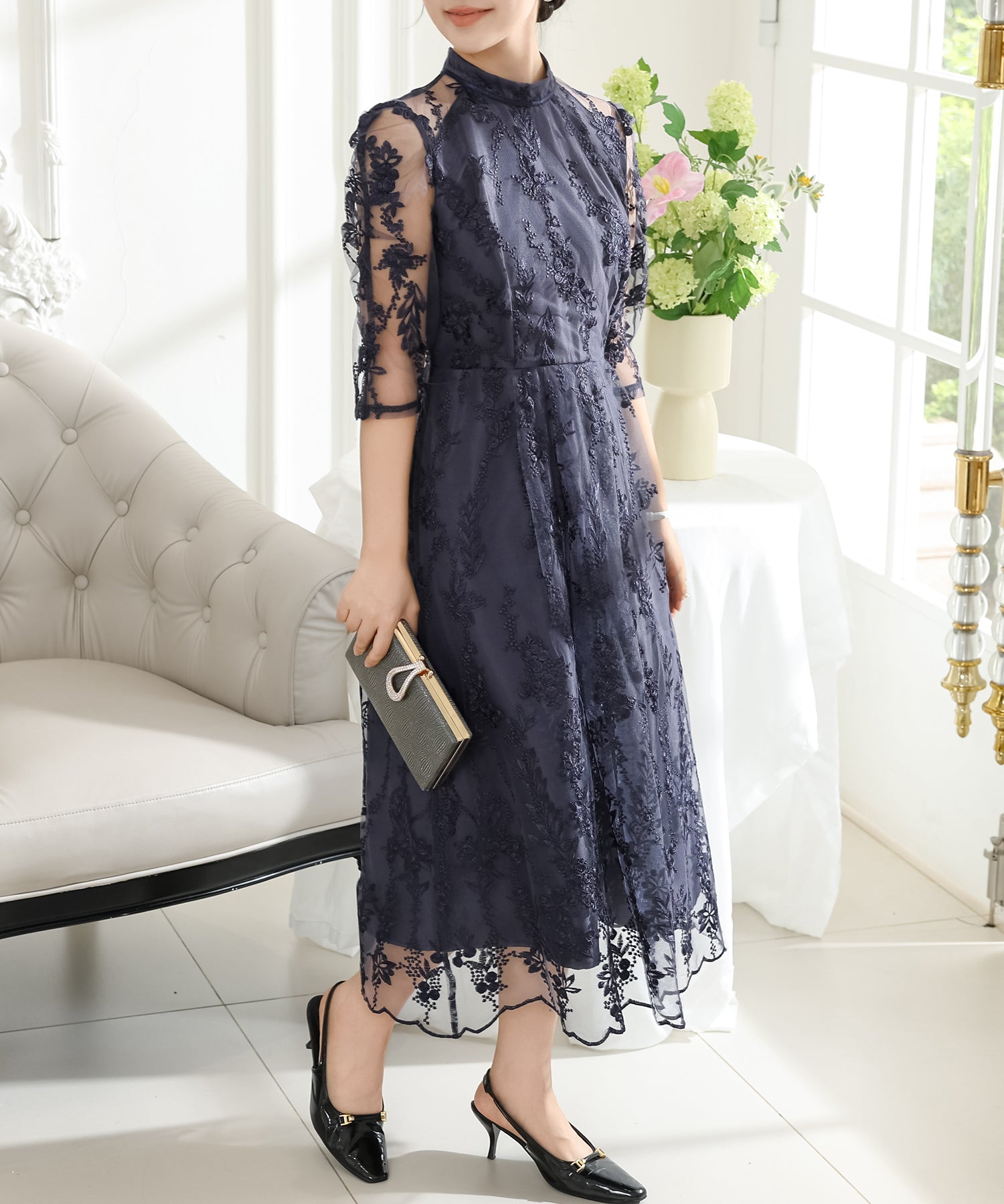 ボタニカル柄 ジャガード シアー レイヤード ロング ドレス