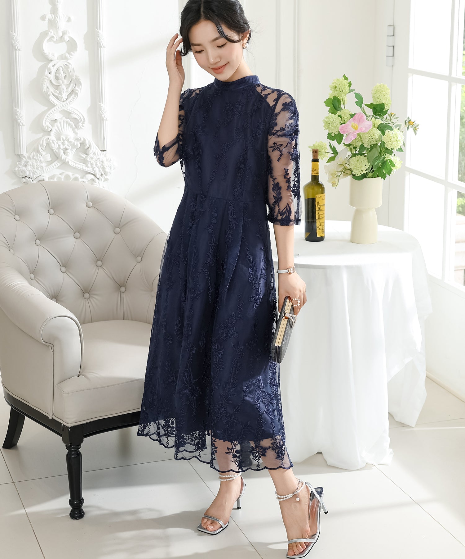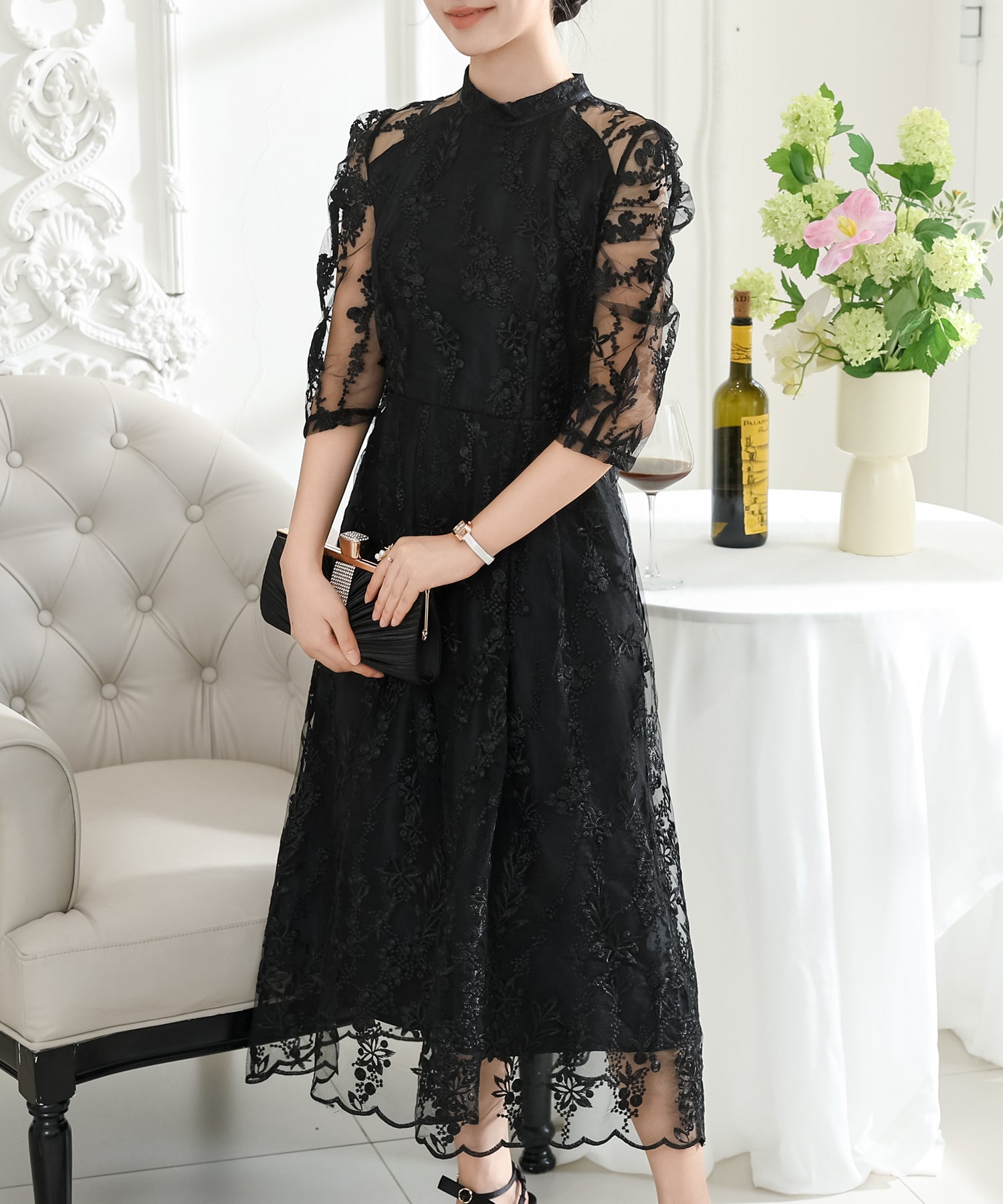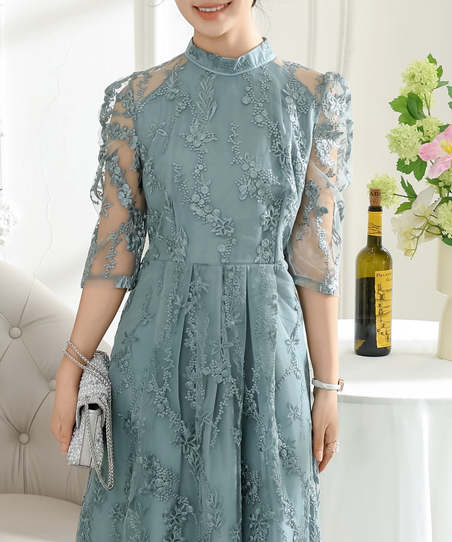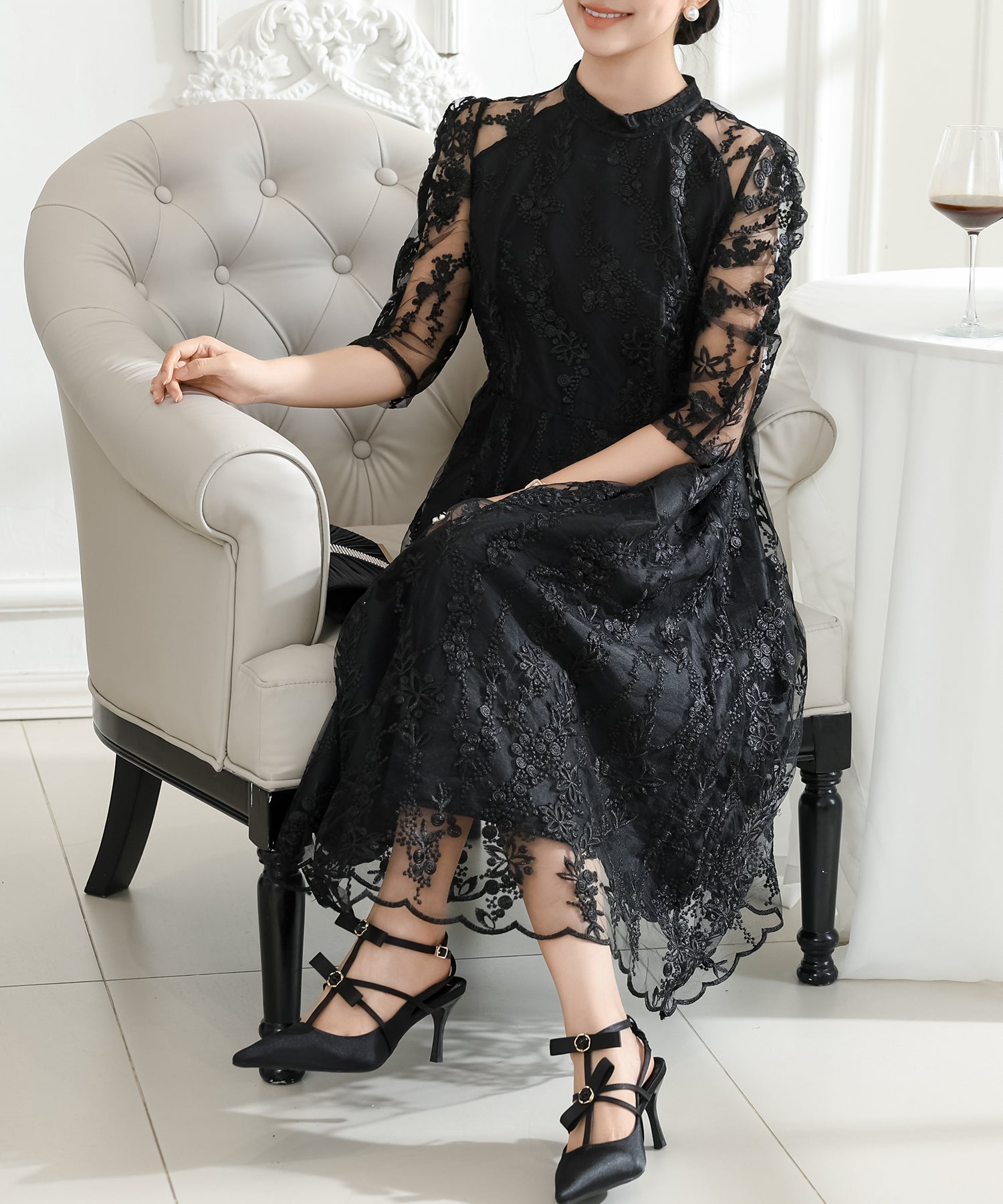 ボタニカル柄 ジャガード シアー レイヤード ロング ドレス