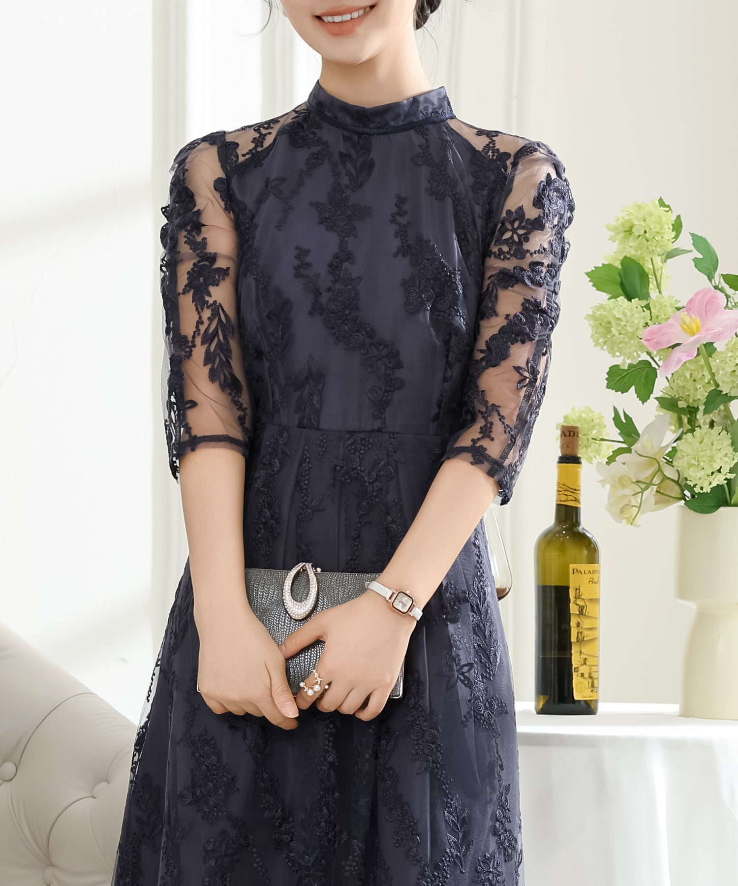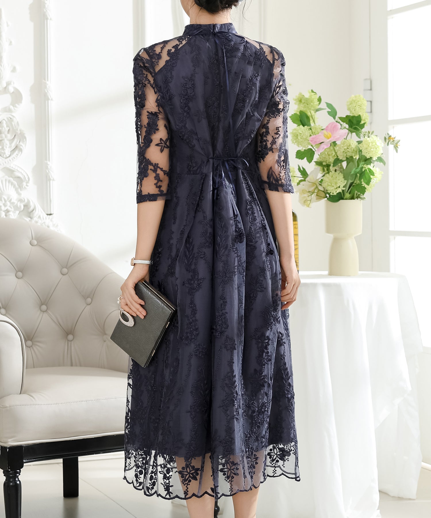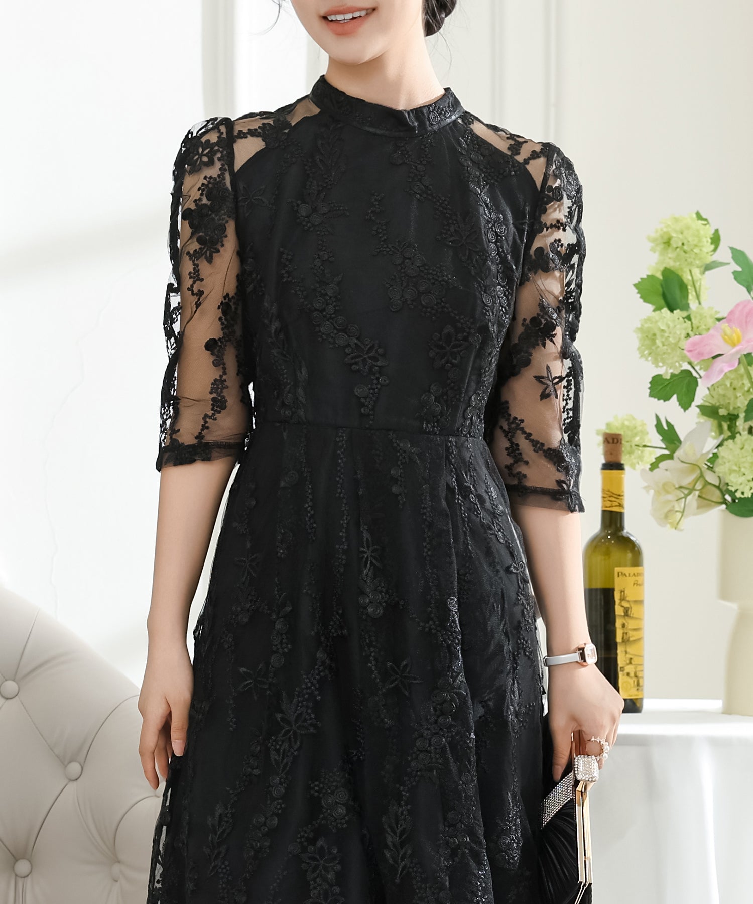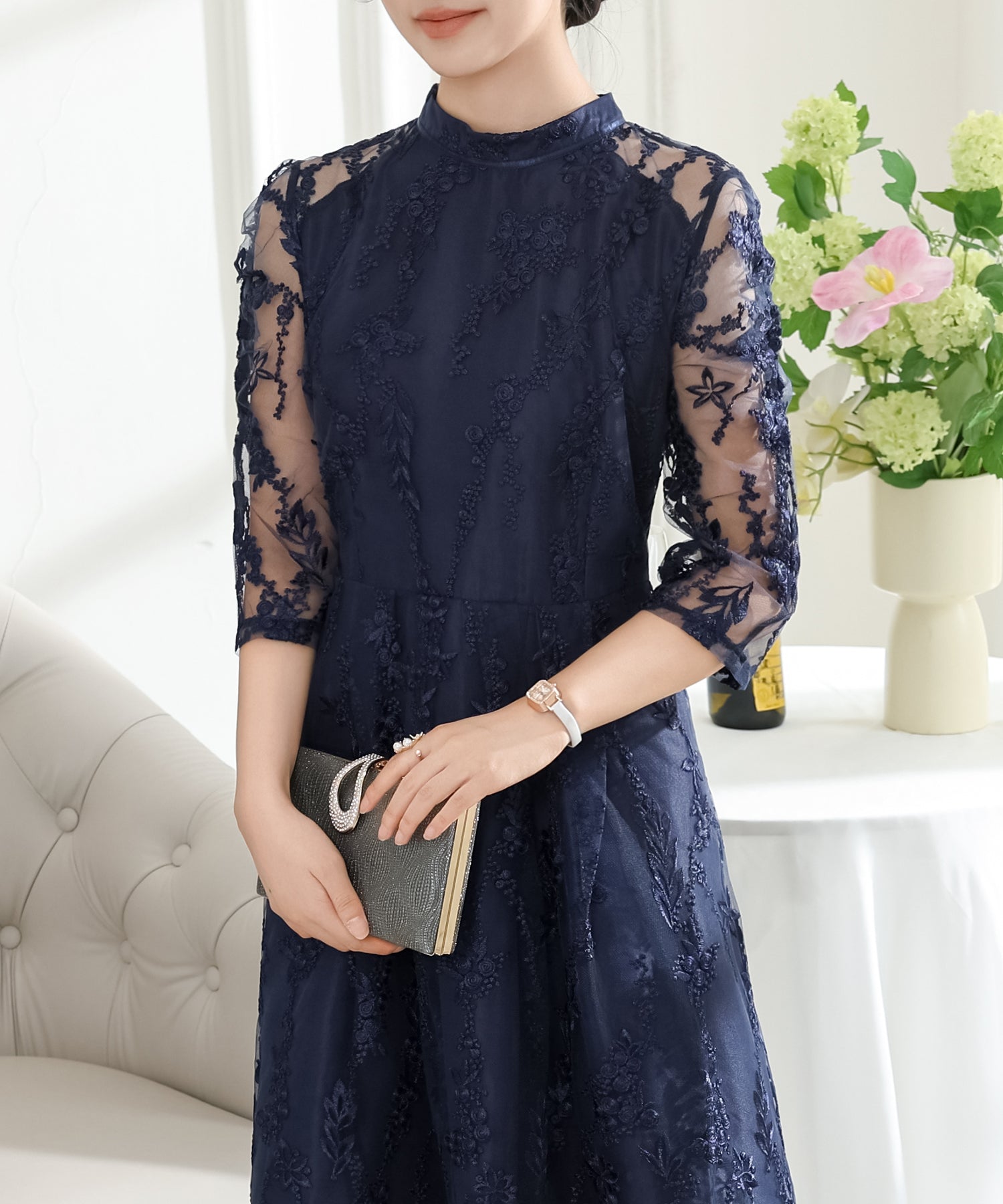 ボタニカル柄 ジャガード シアー レイヤード ロング ドレス