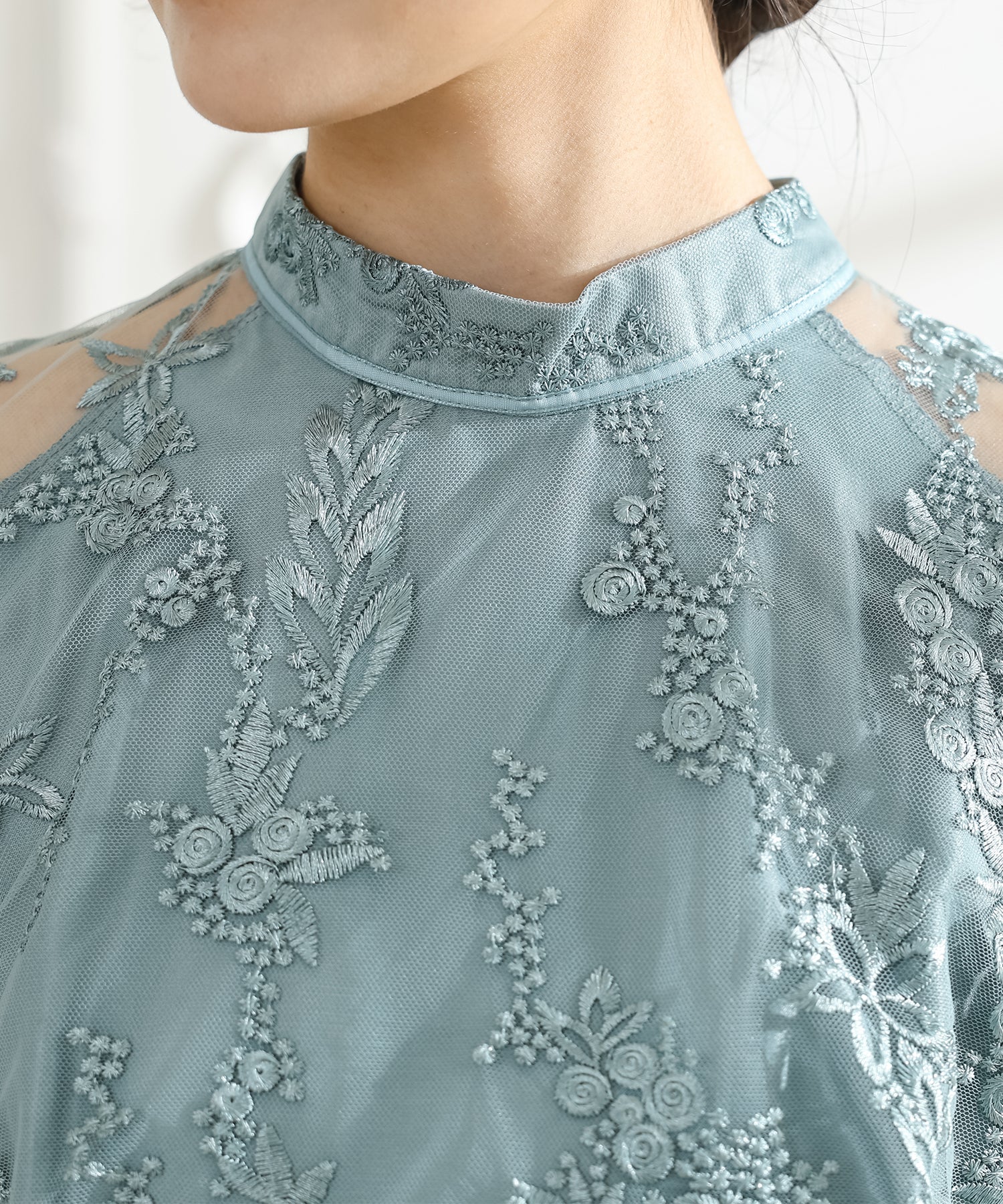 アメリカンスリーブ風のインナーに重ねたレース生地は、繊細さを感じるボタニカル柄をチョイス。