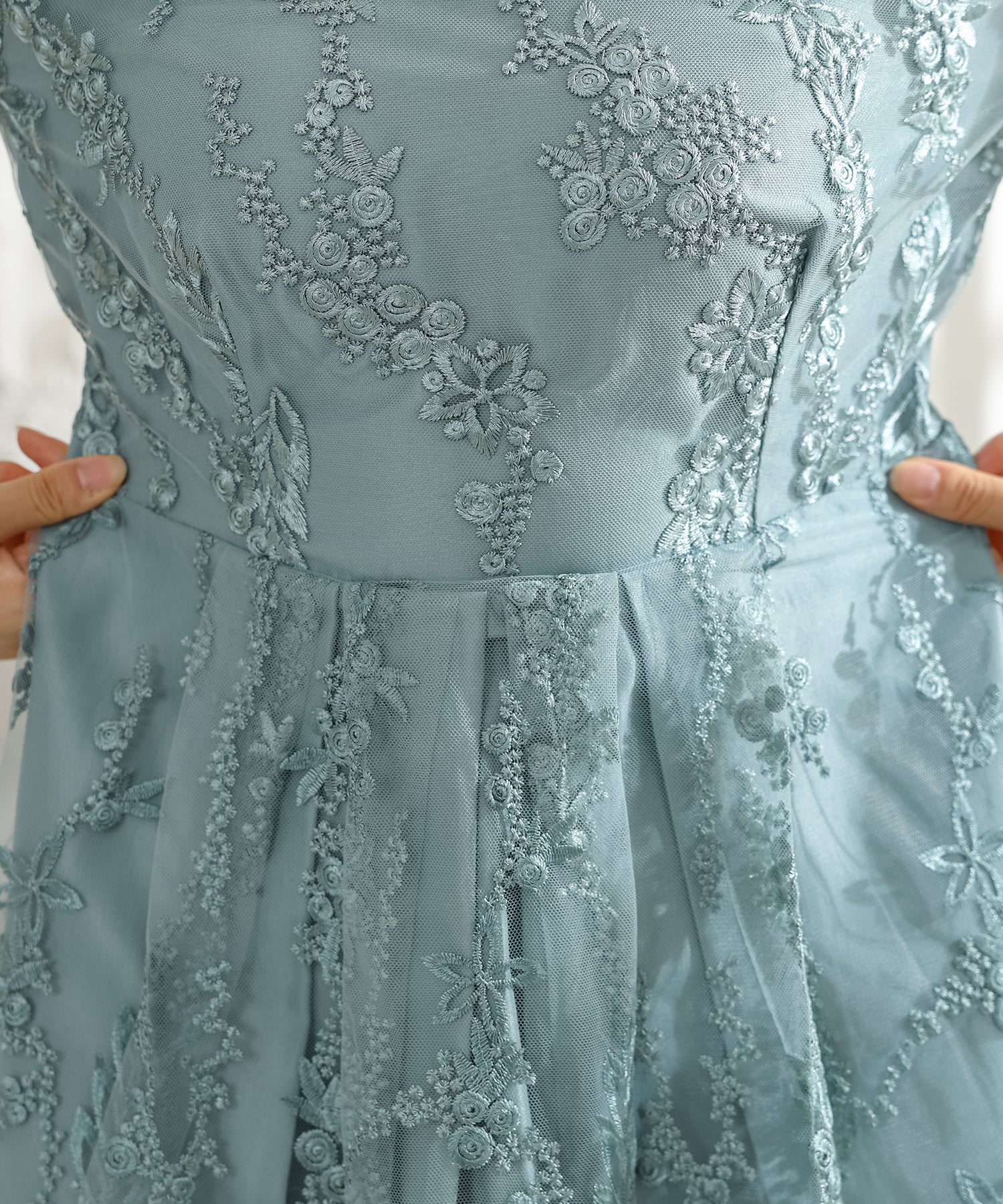 チュールフリル シアー 切り替え フレア ロング ドレス