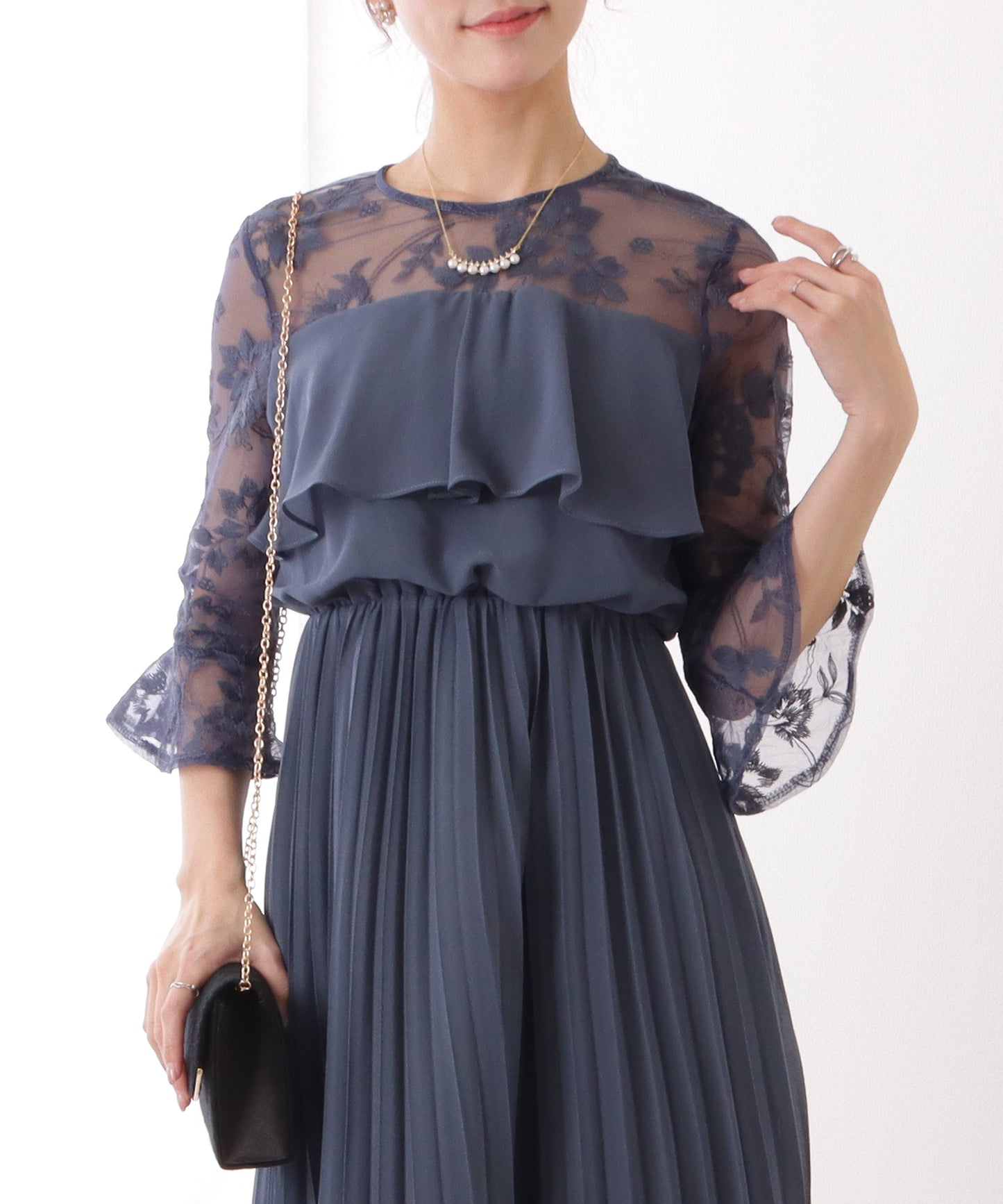 チュールフリル シアー 切り替え フレア ロング ドレス