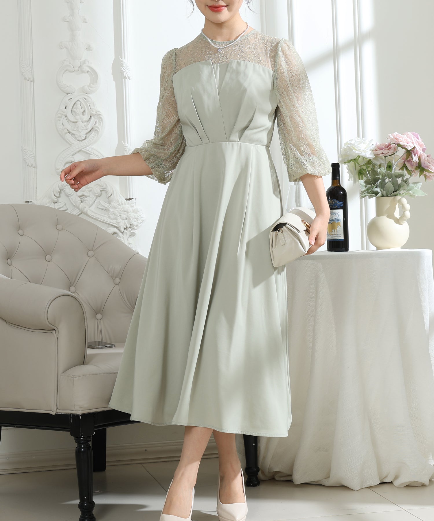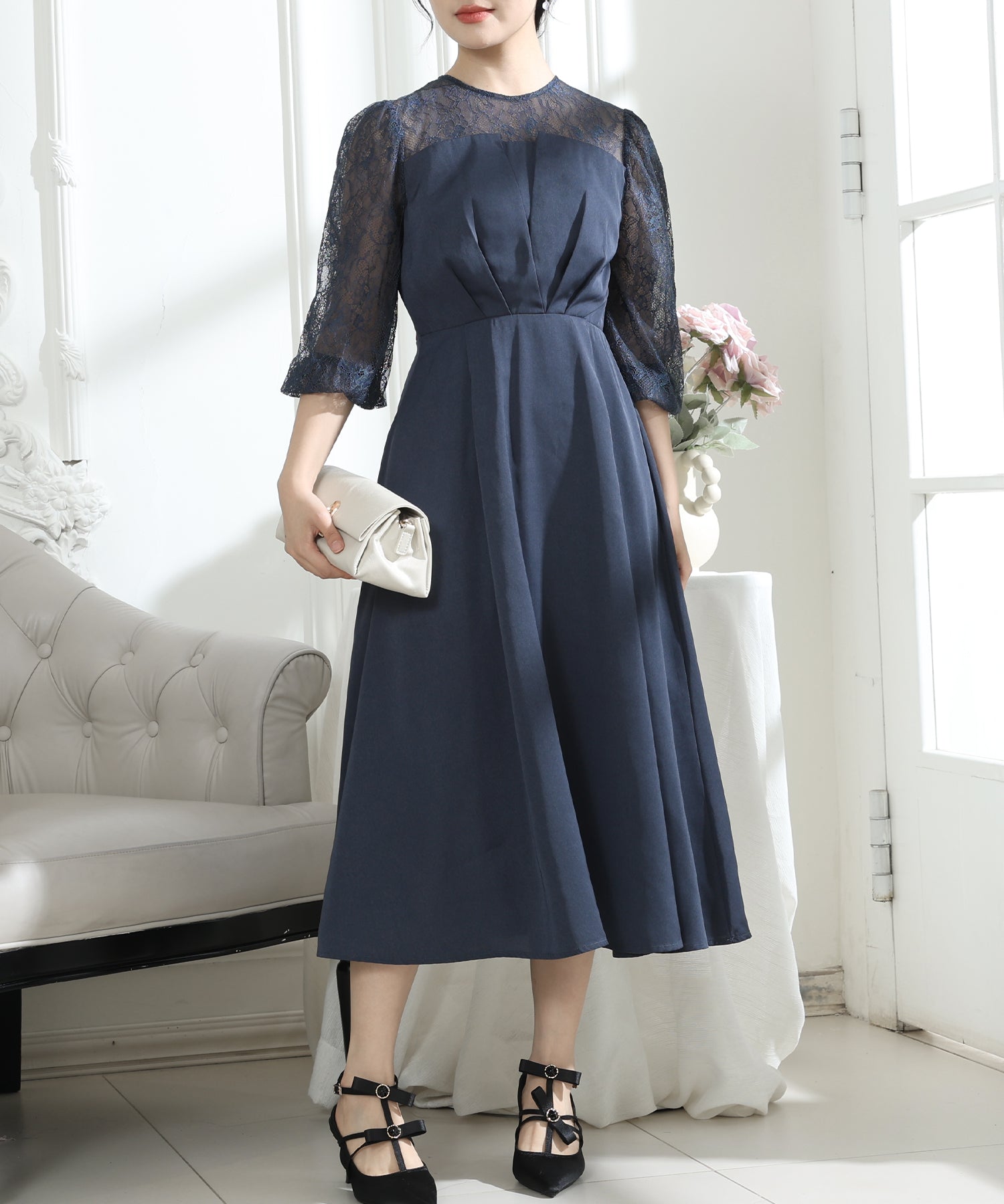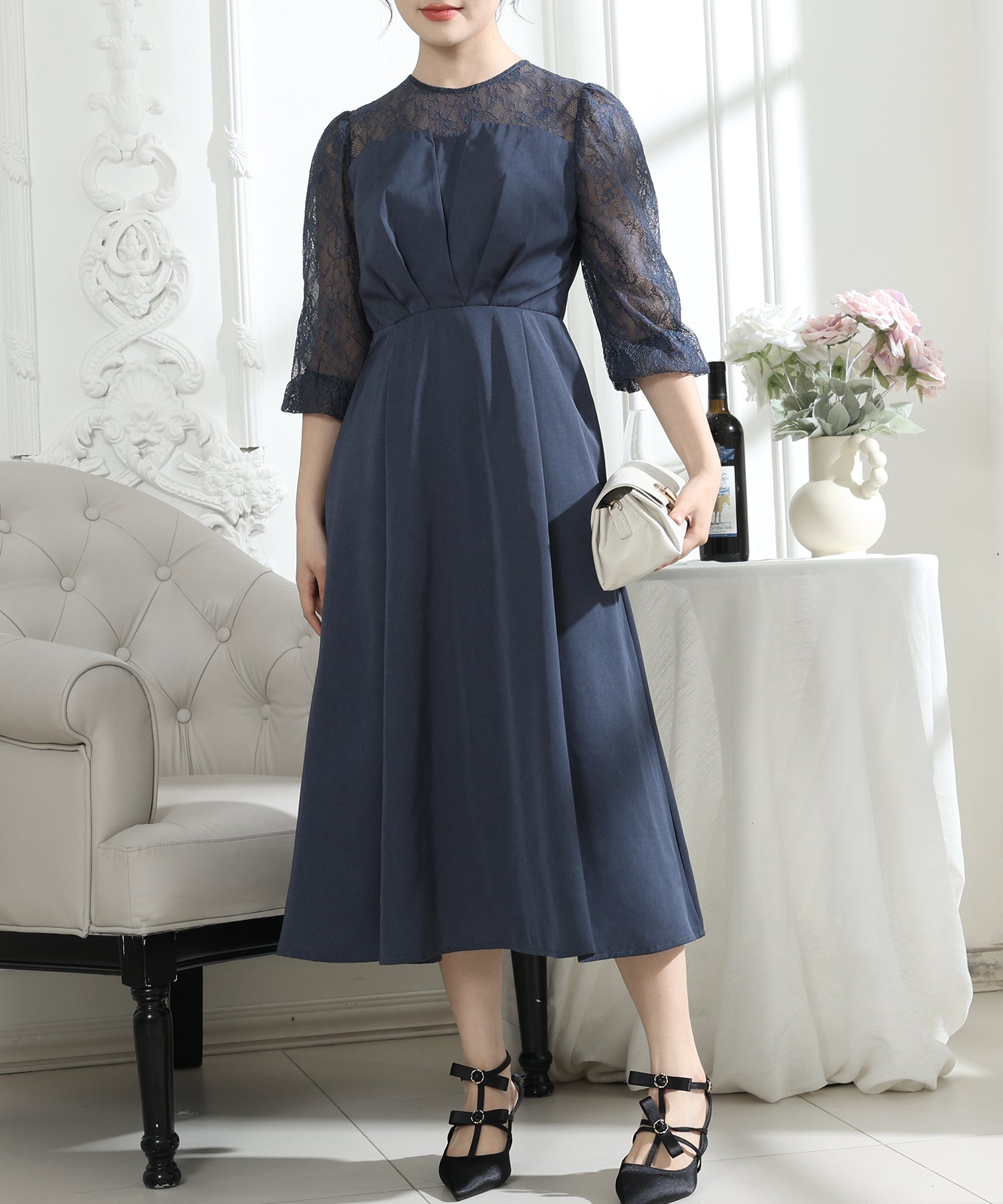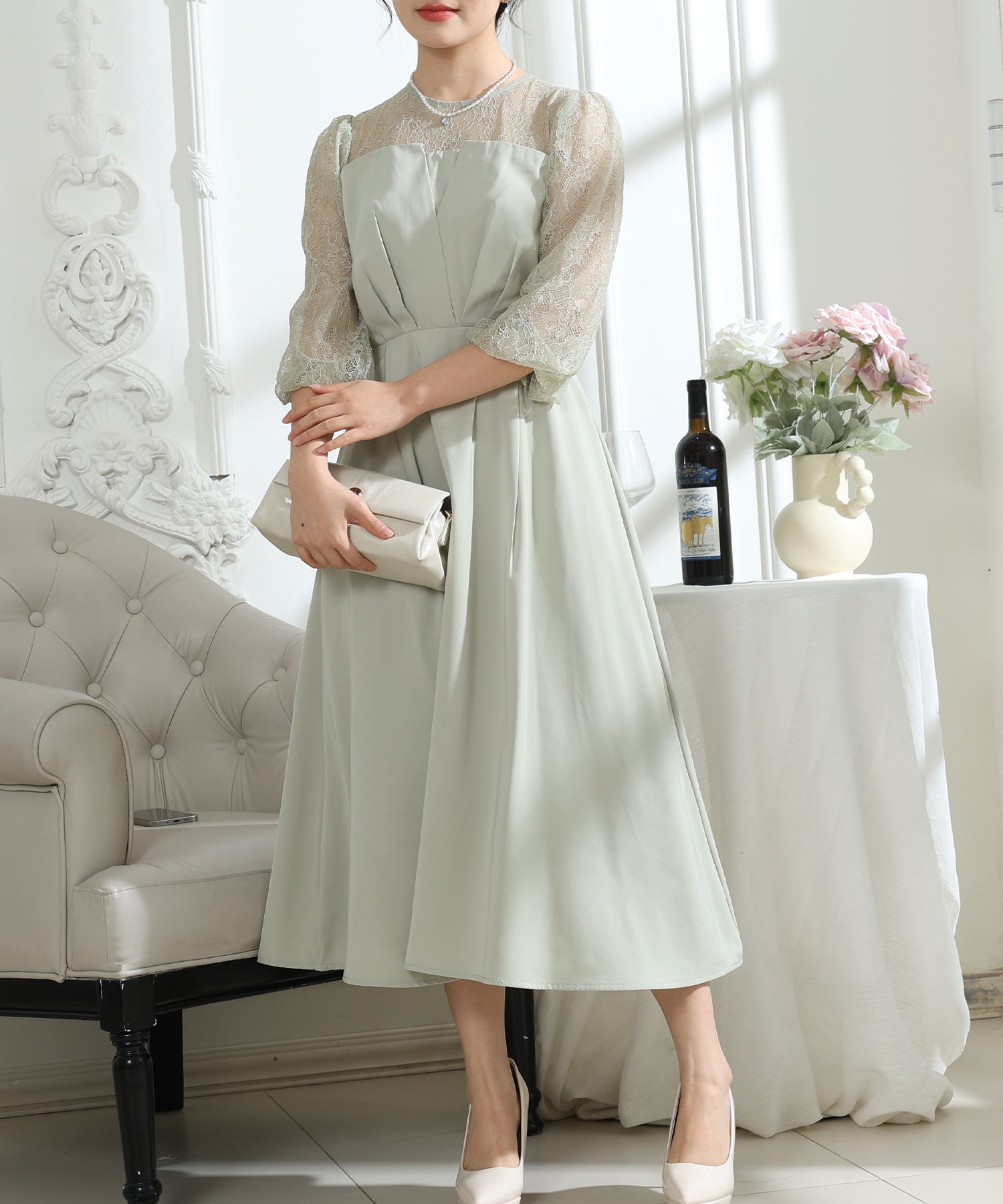 レースと掛け合わせてエレガントに仕上げたミモレ丈のワンピース。