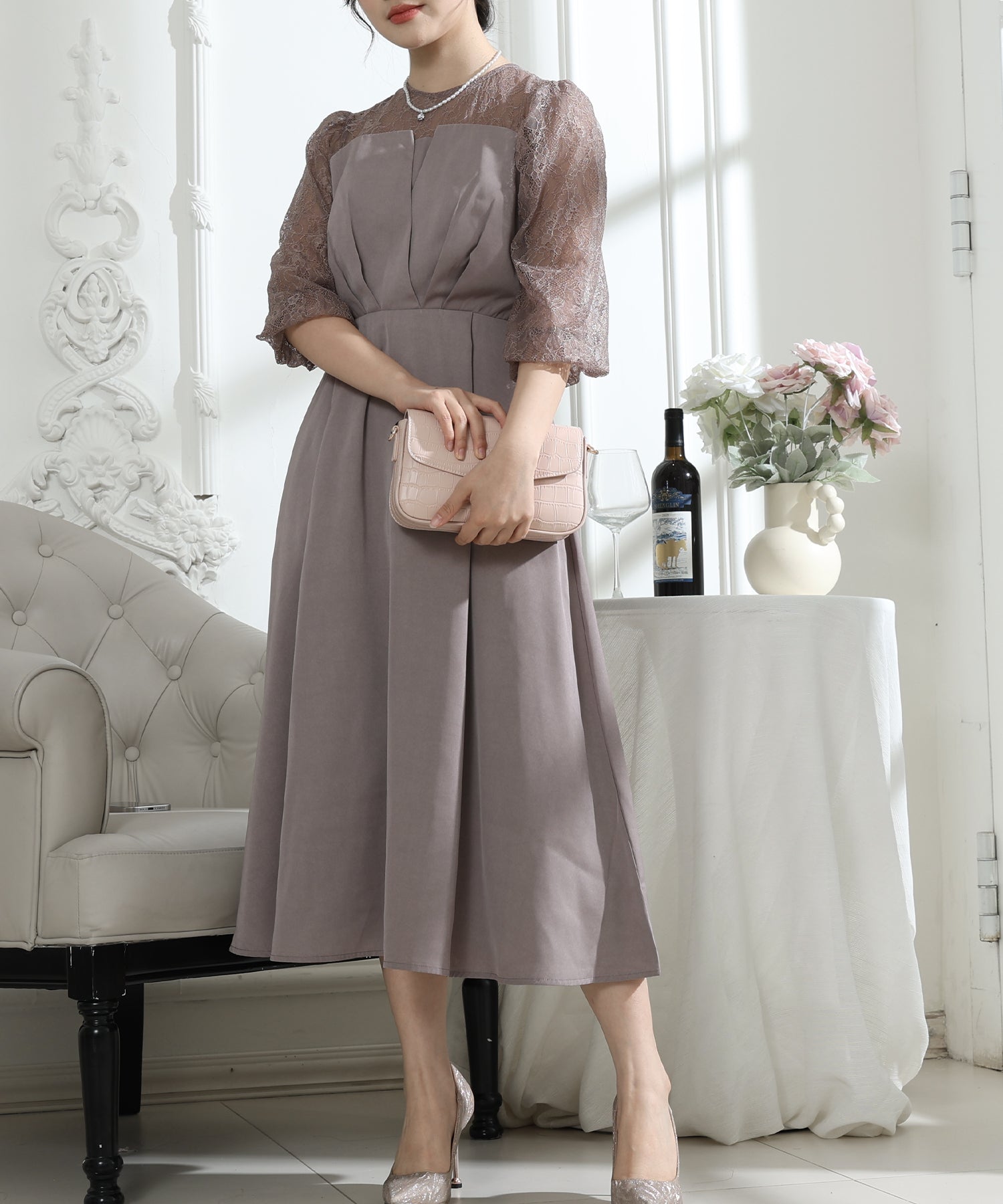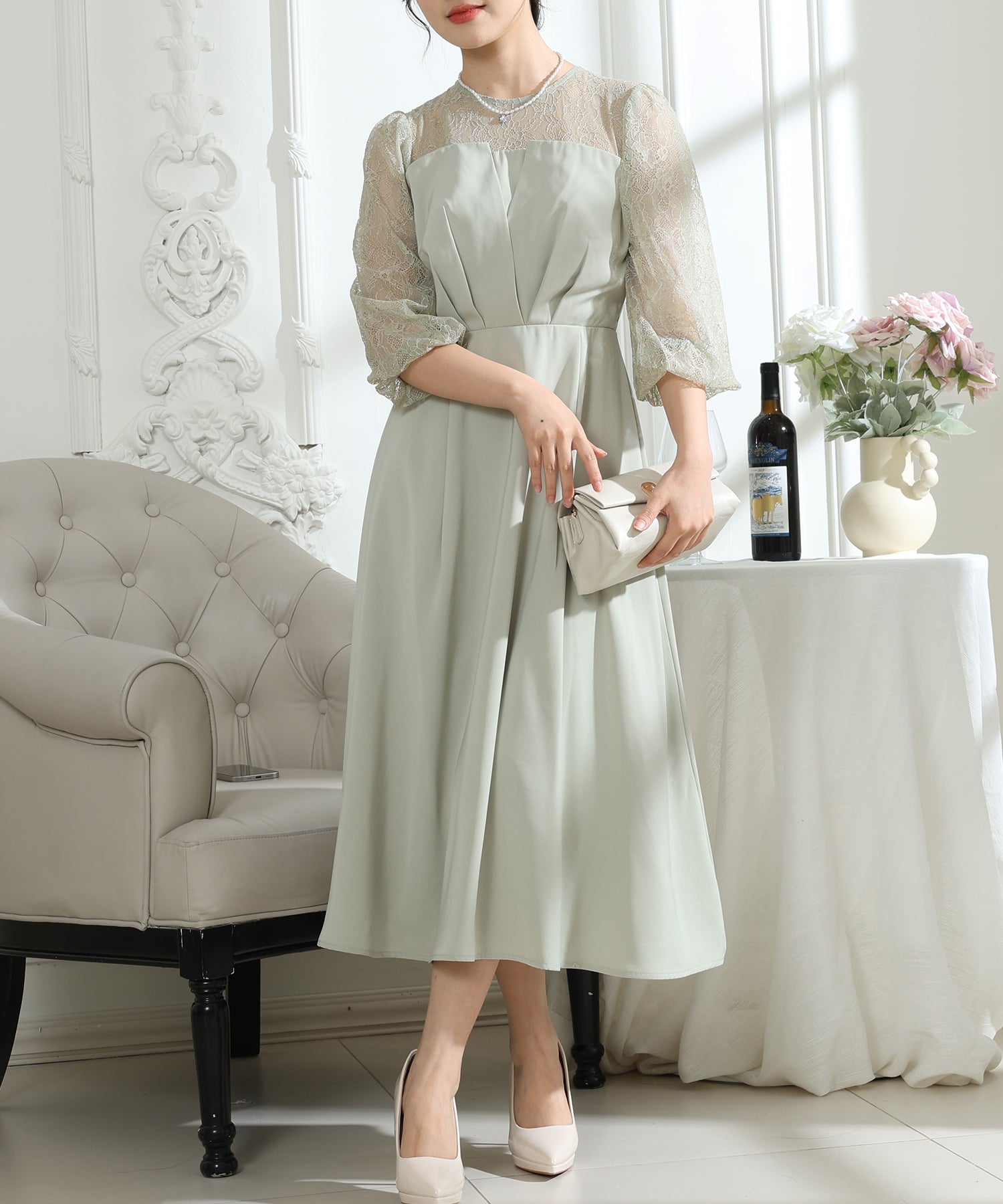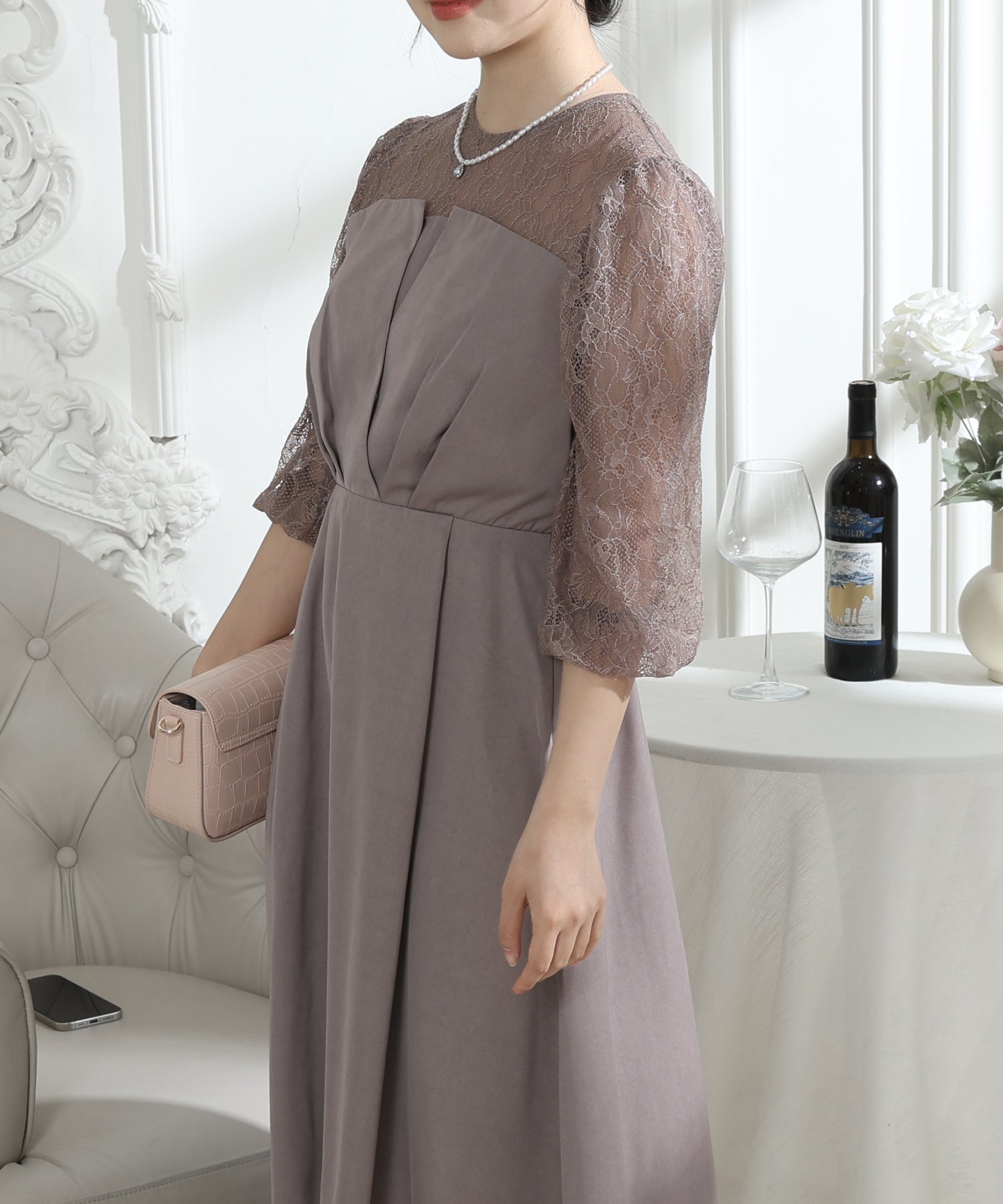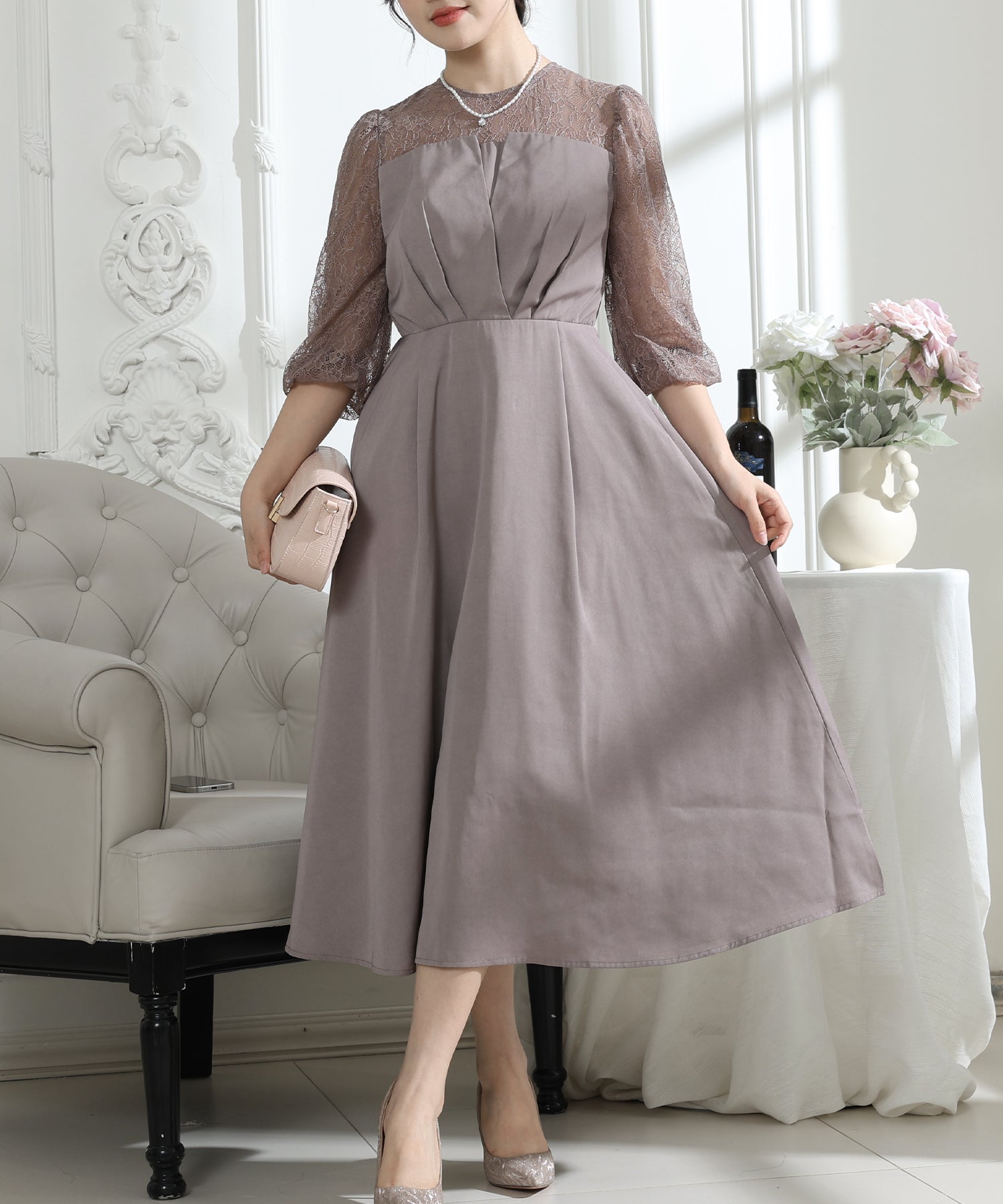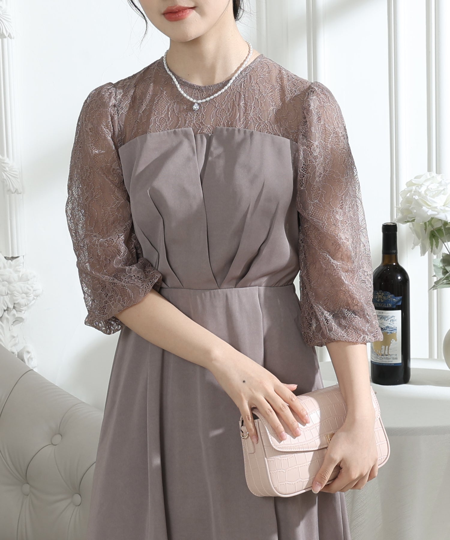 レースと掛け合わせてエレガントに仕上げたミモレ丈のワンピース。