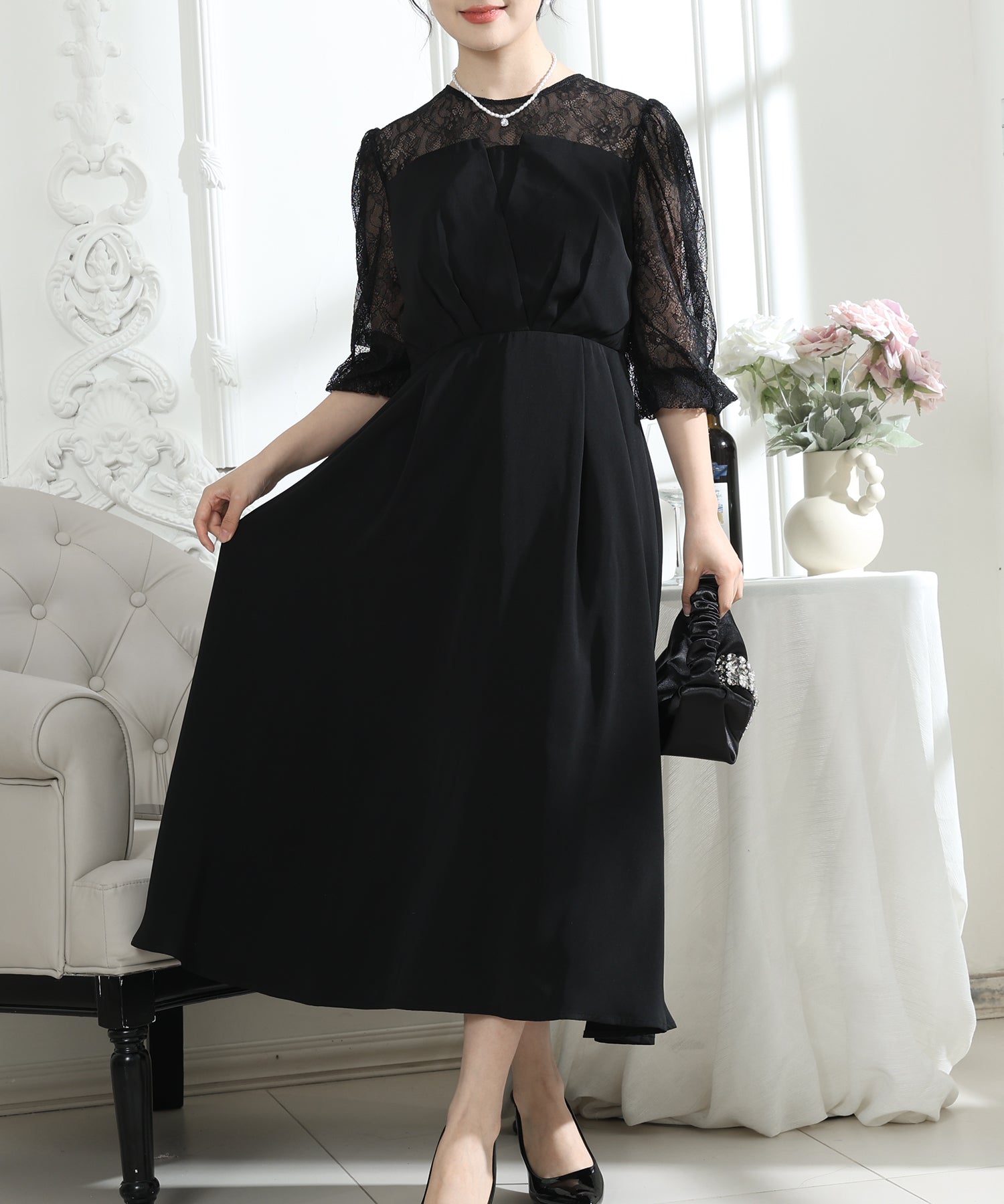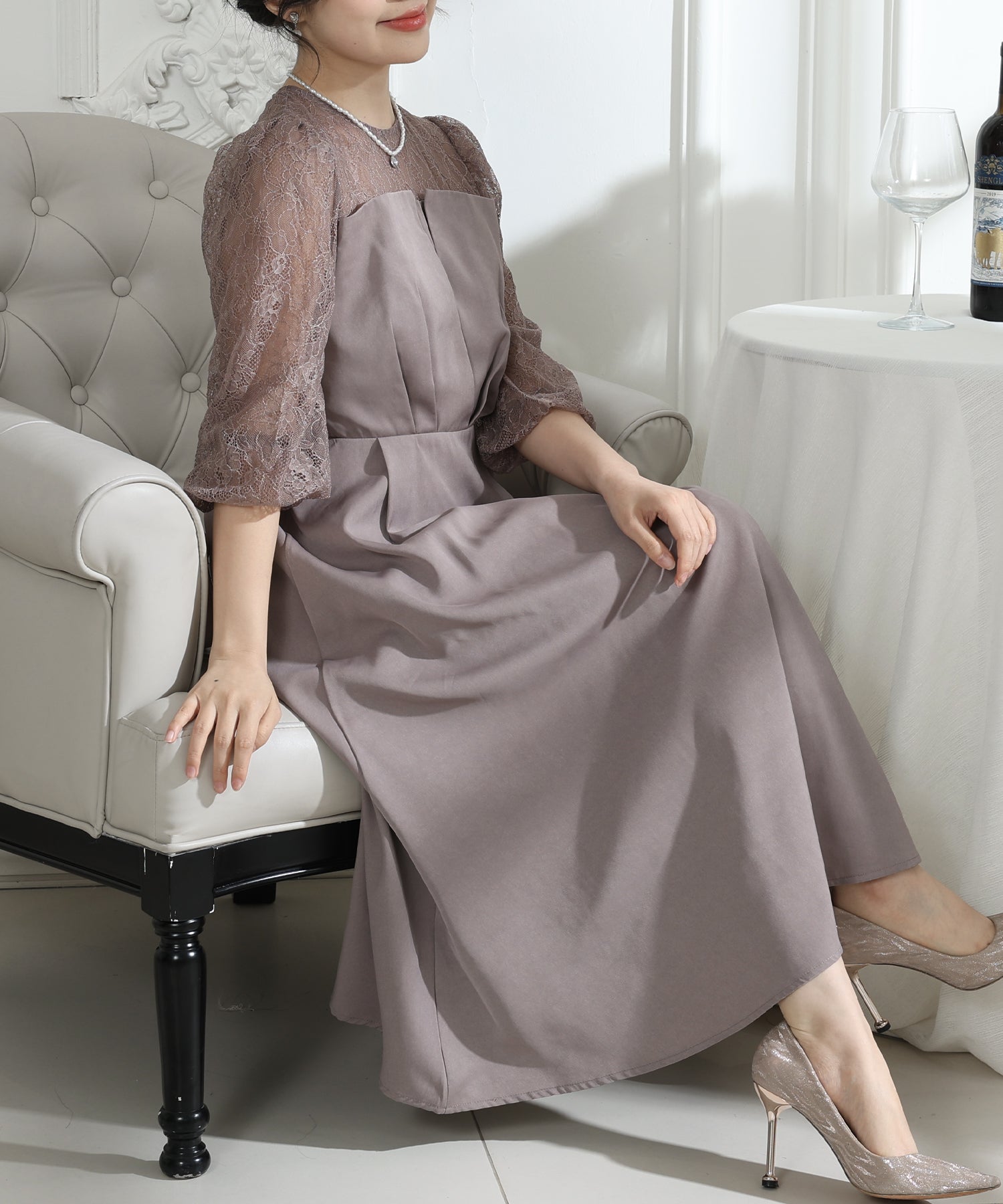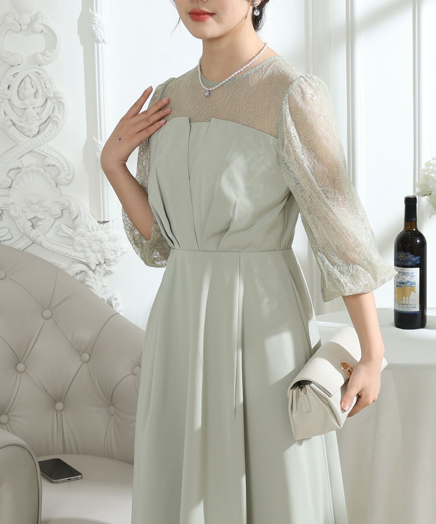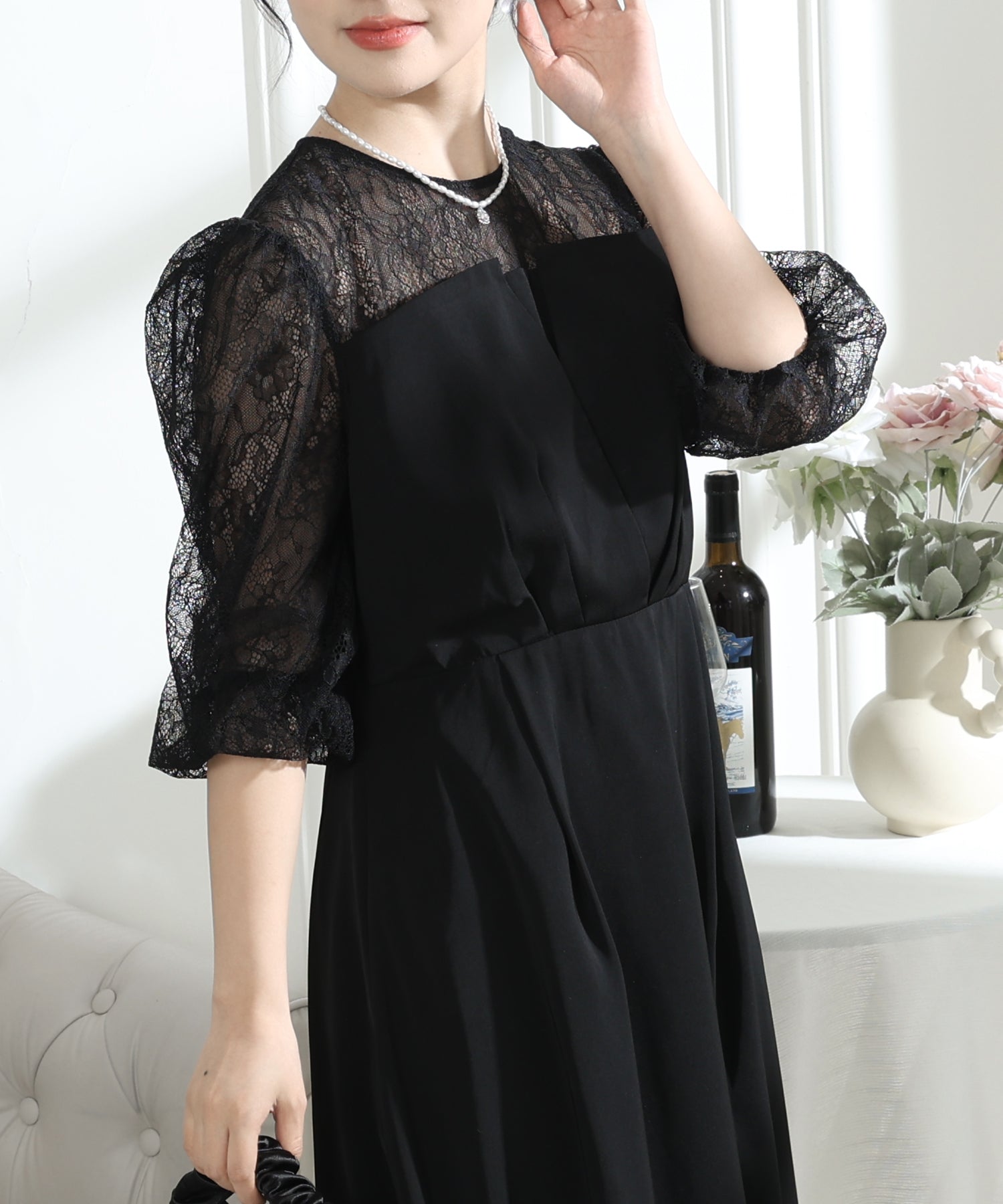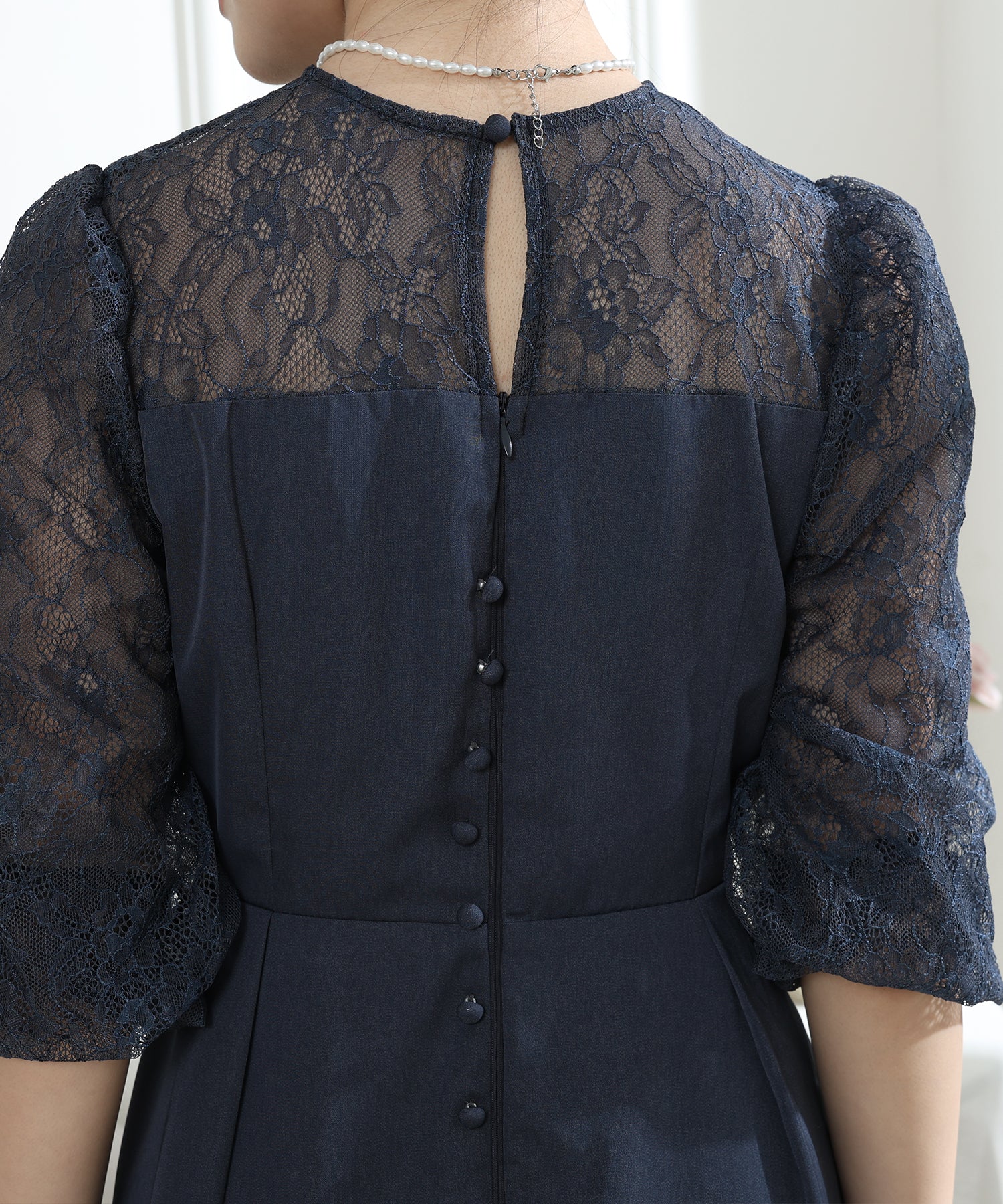 レースと掛け合わせてエレガントに仕上げたミモレ丈のワンピース。