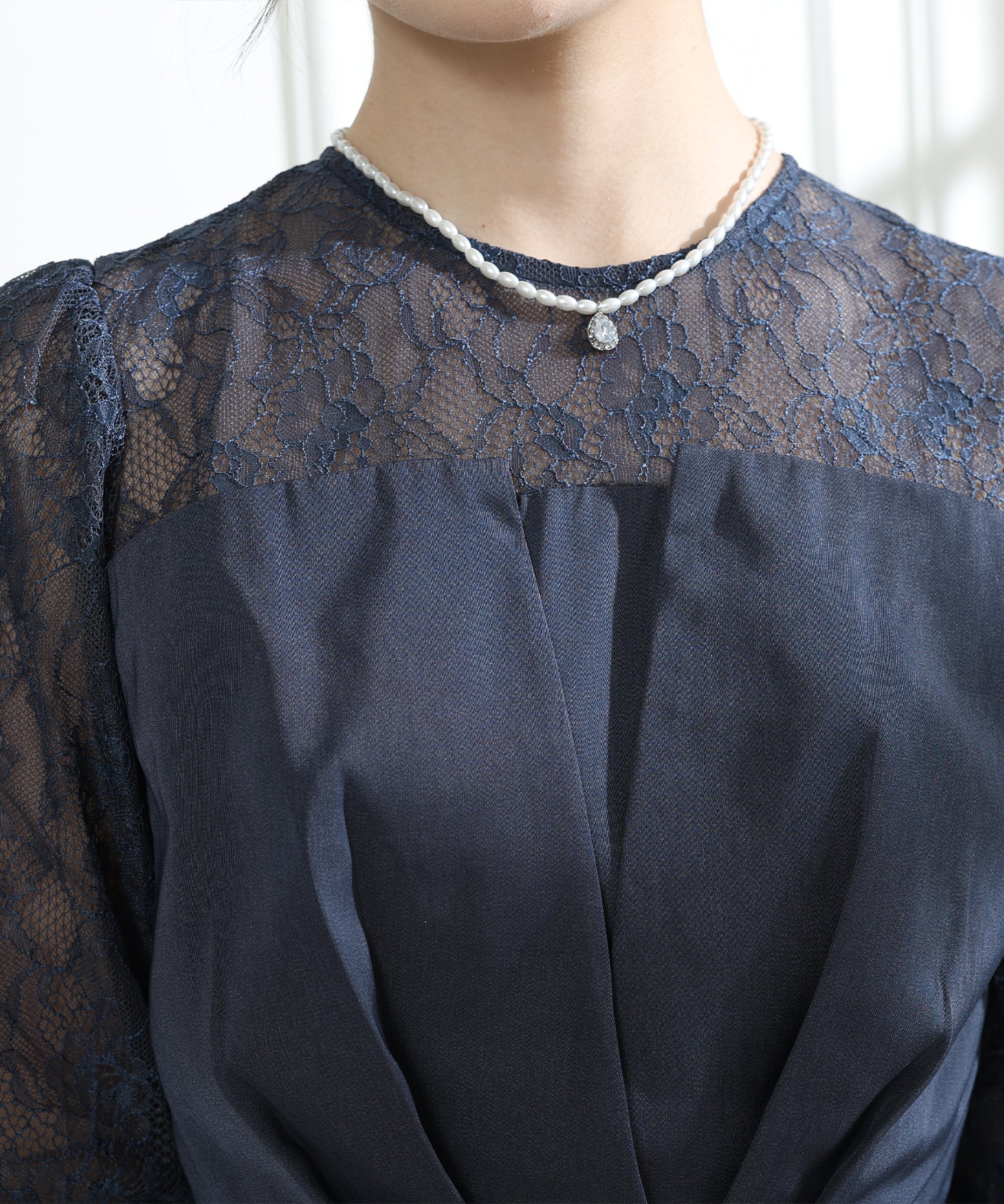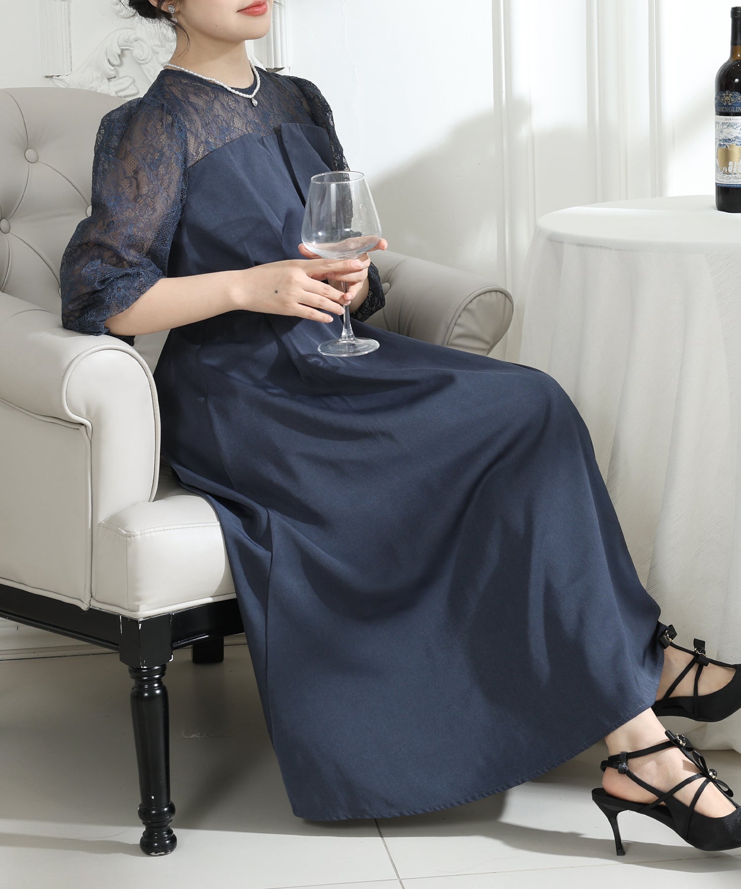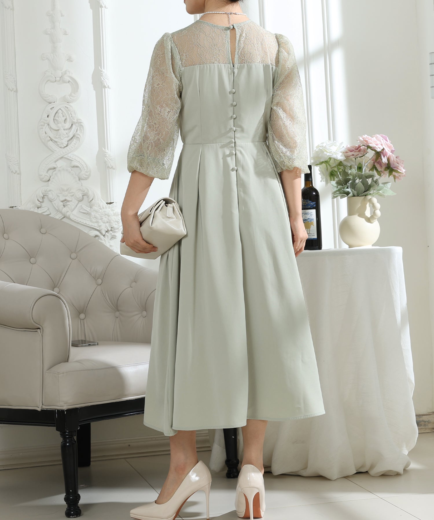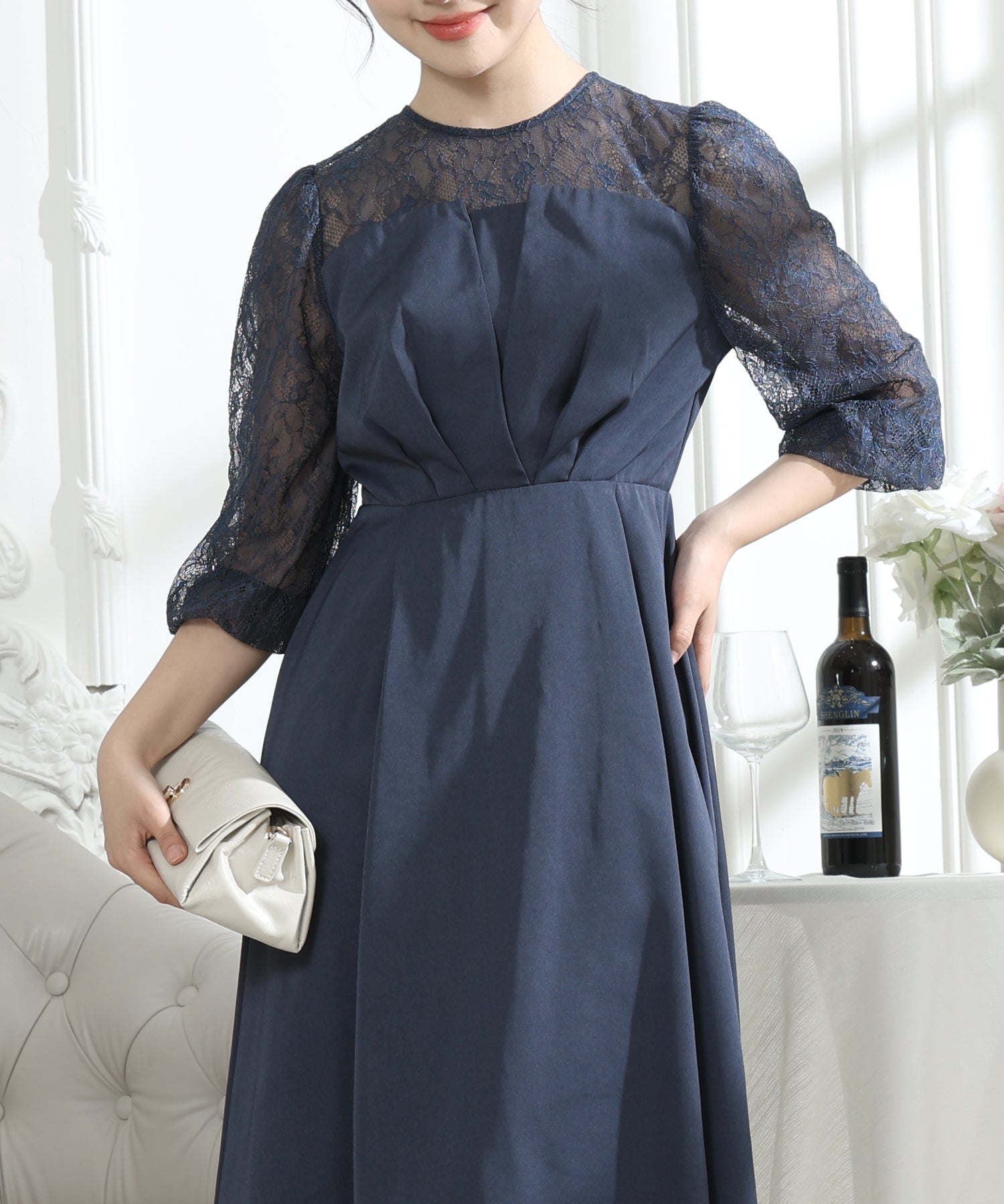 レースと掛け合わせてエレガントに仕上げたミモレ丈のワンピース。