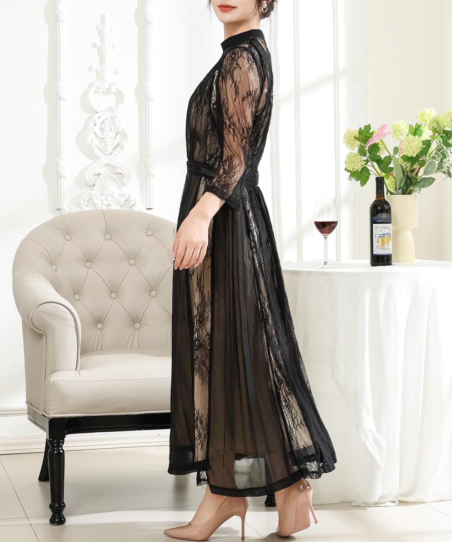チュールフリル シアー 切り替え フレア ロング ドレス
