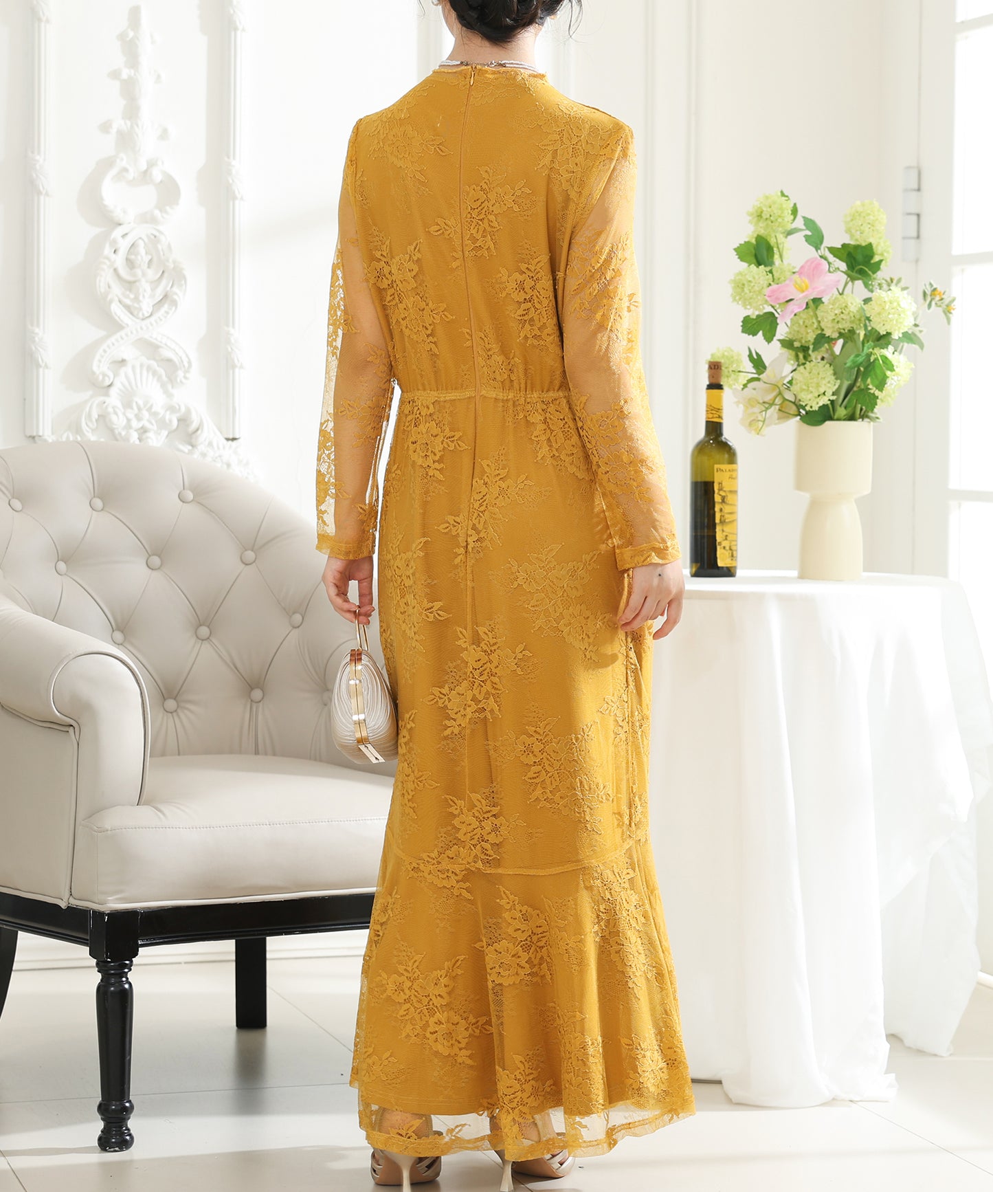 チュールフリル シアー 切り替え フレア ロング ドレス