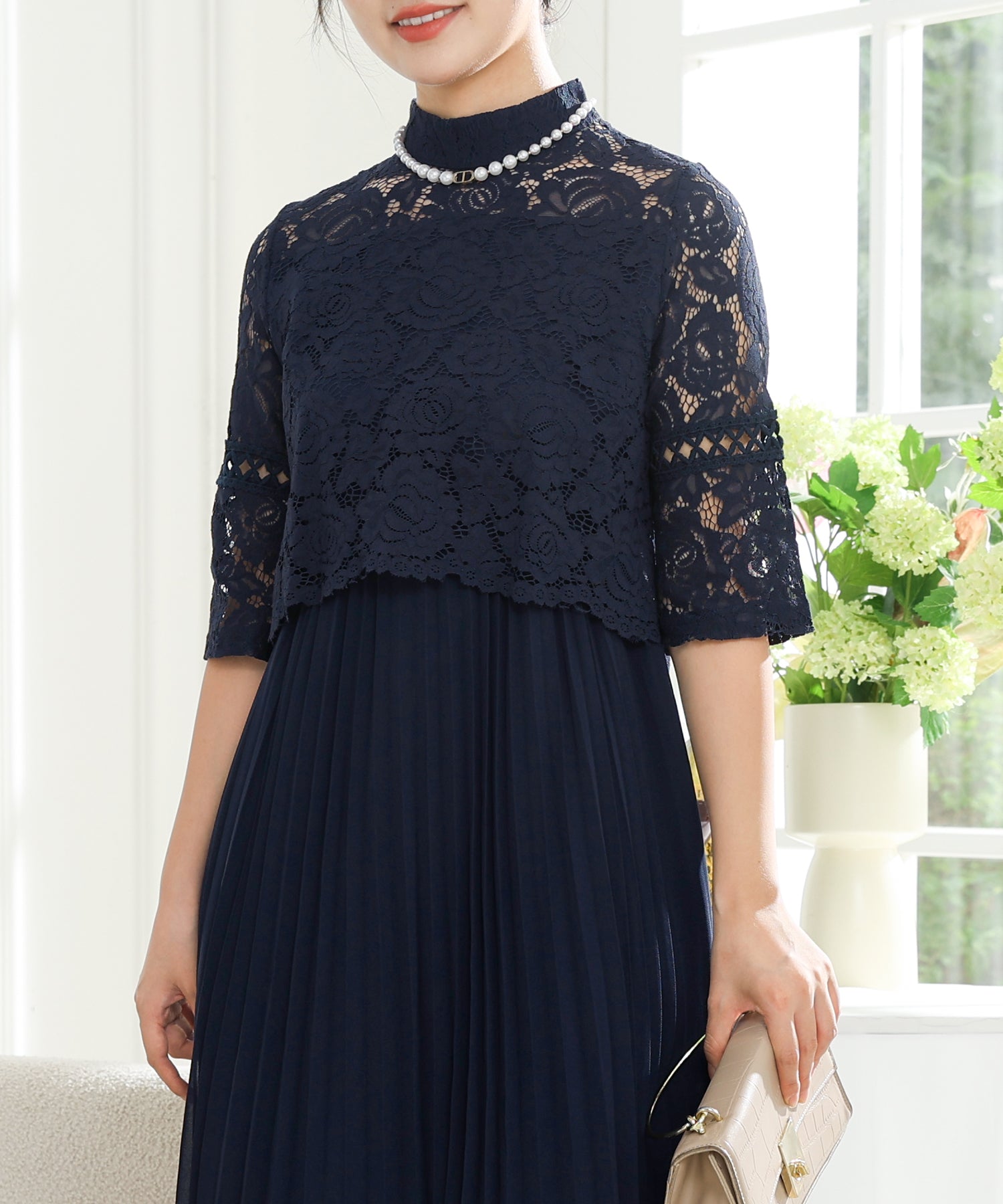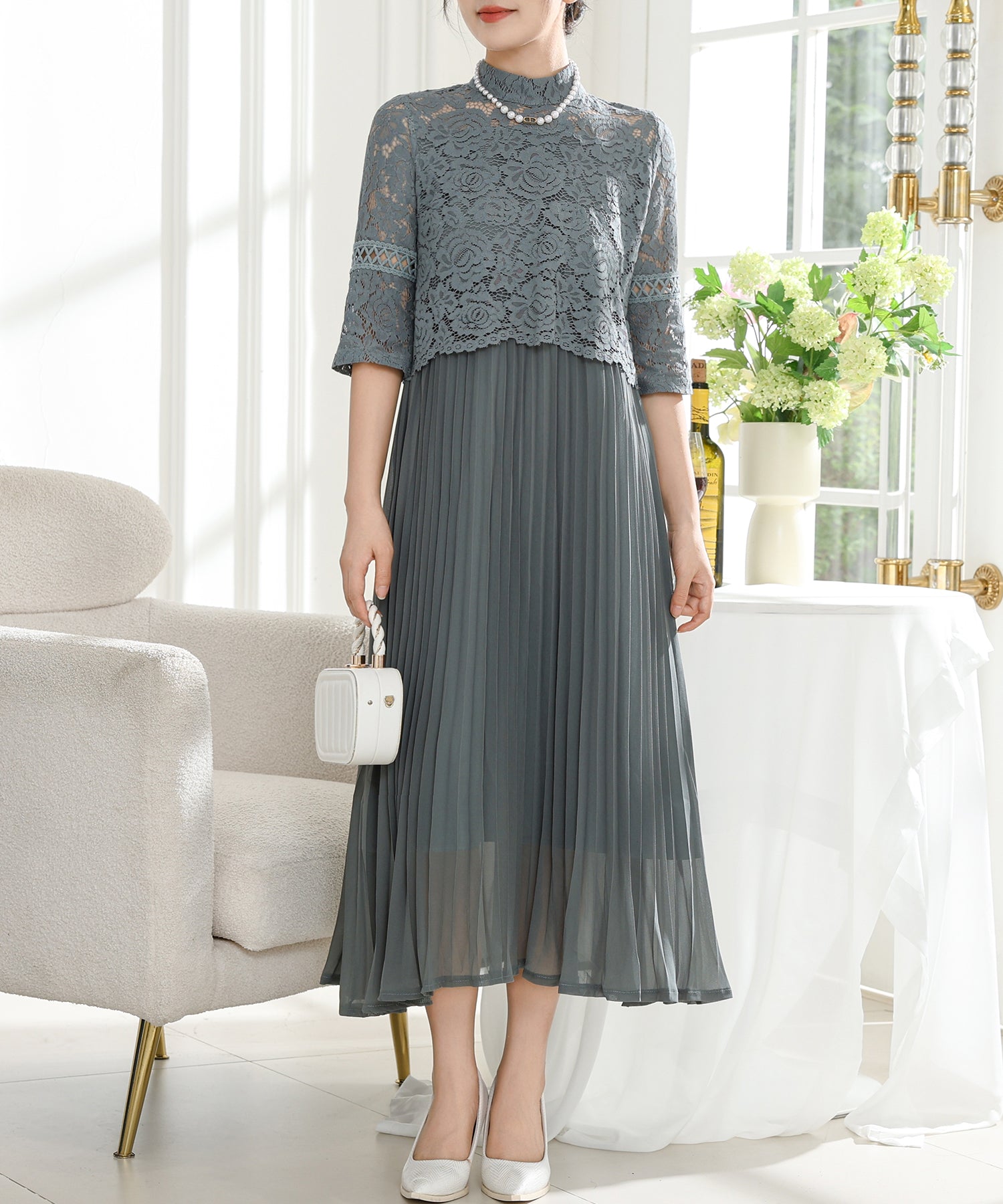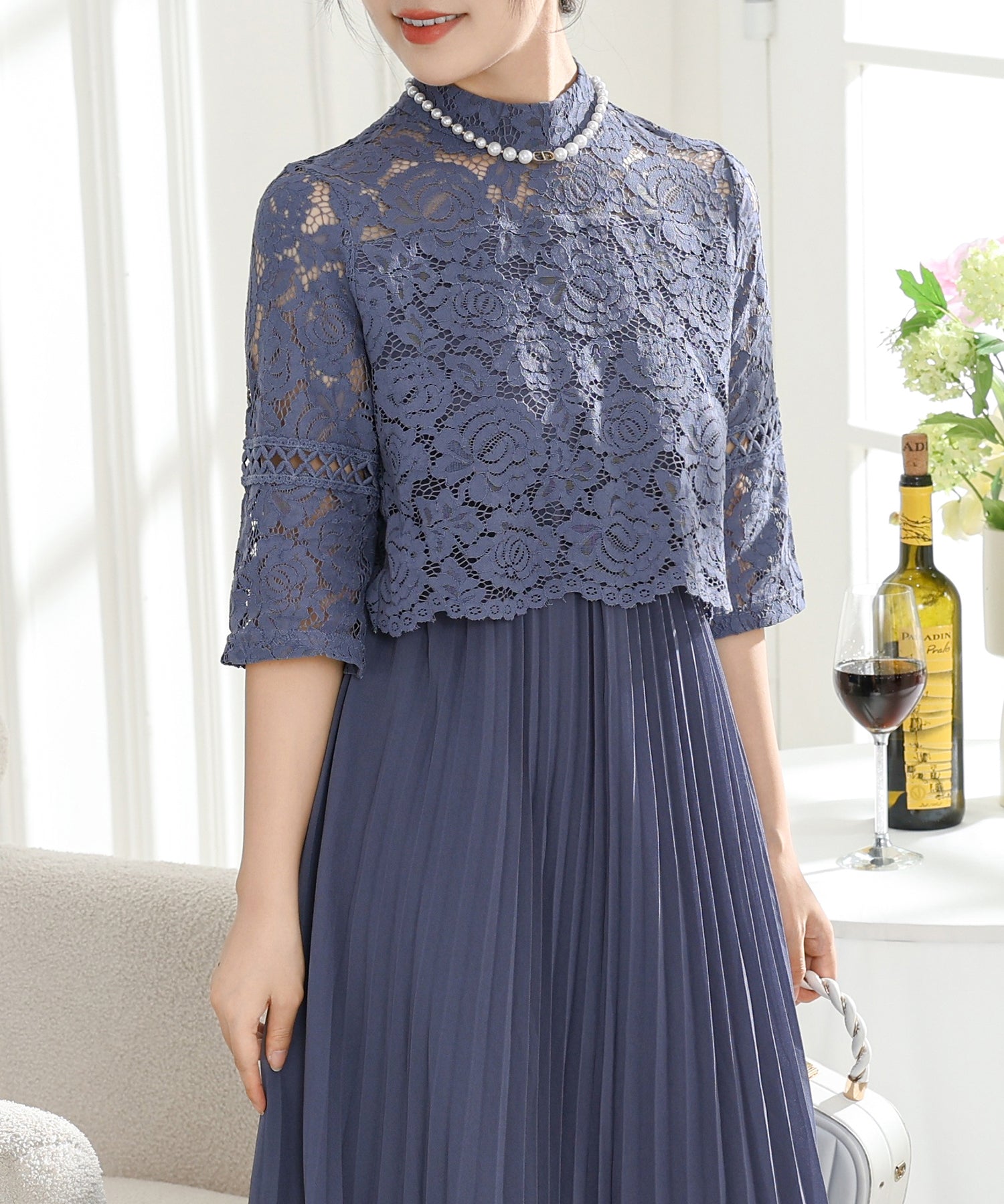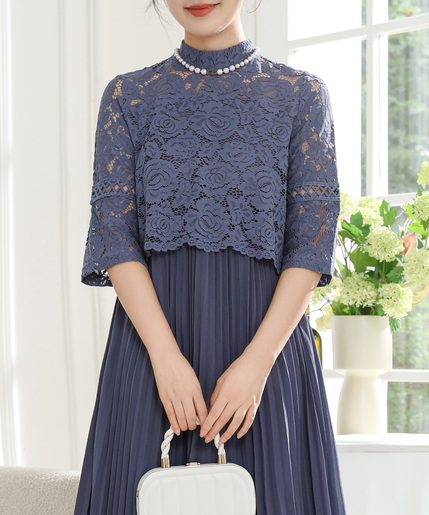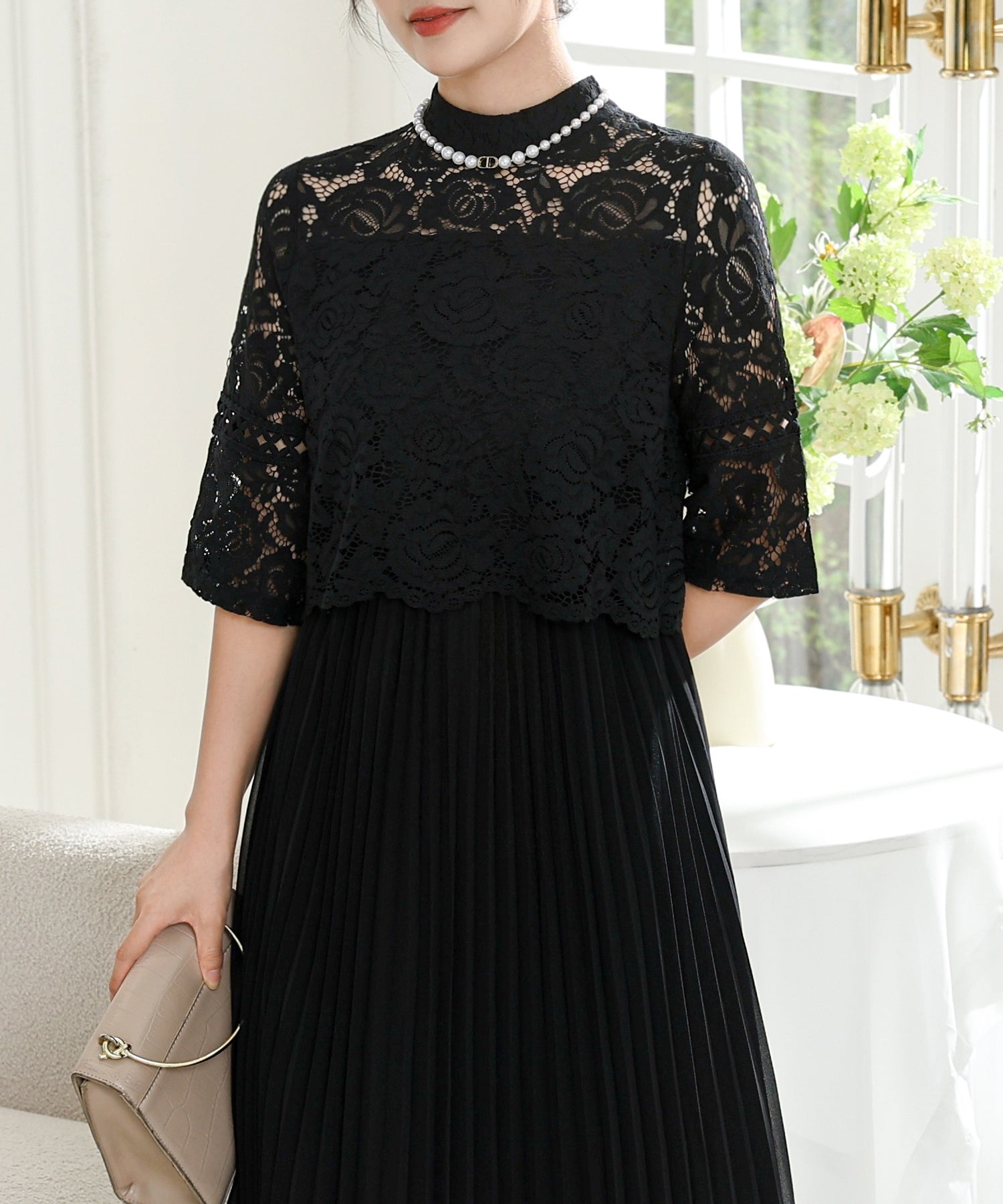 ビスチェ風 レース 切り替え 6分袖 ワンピース