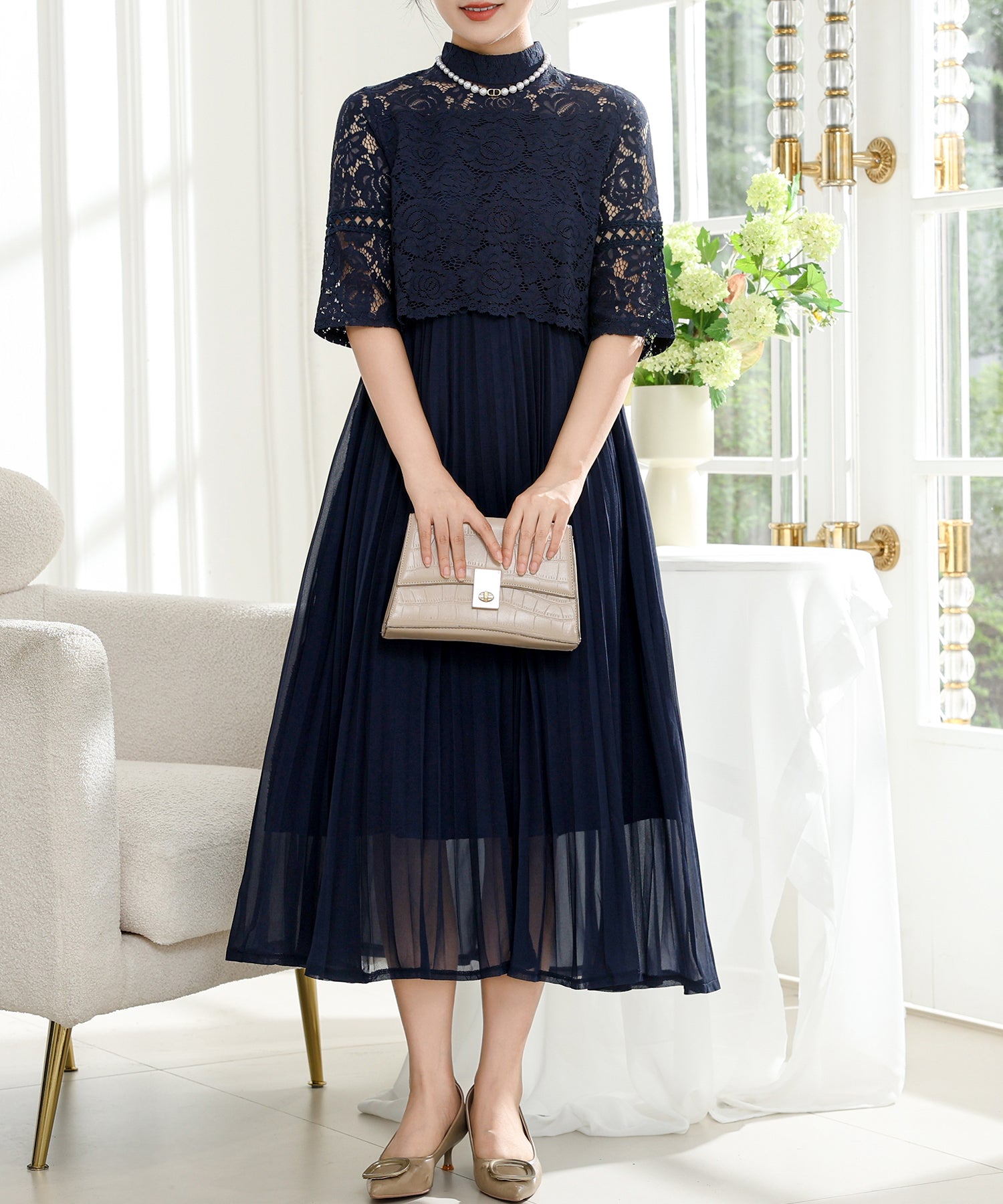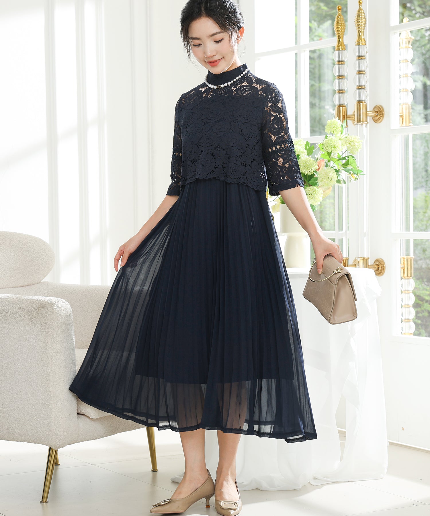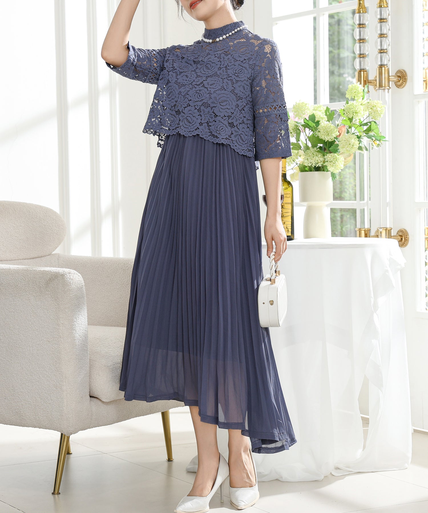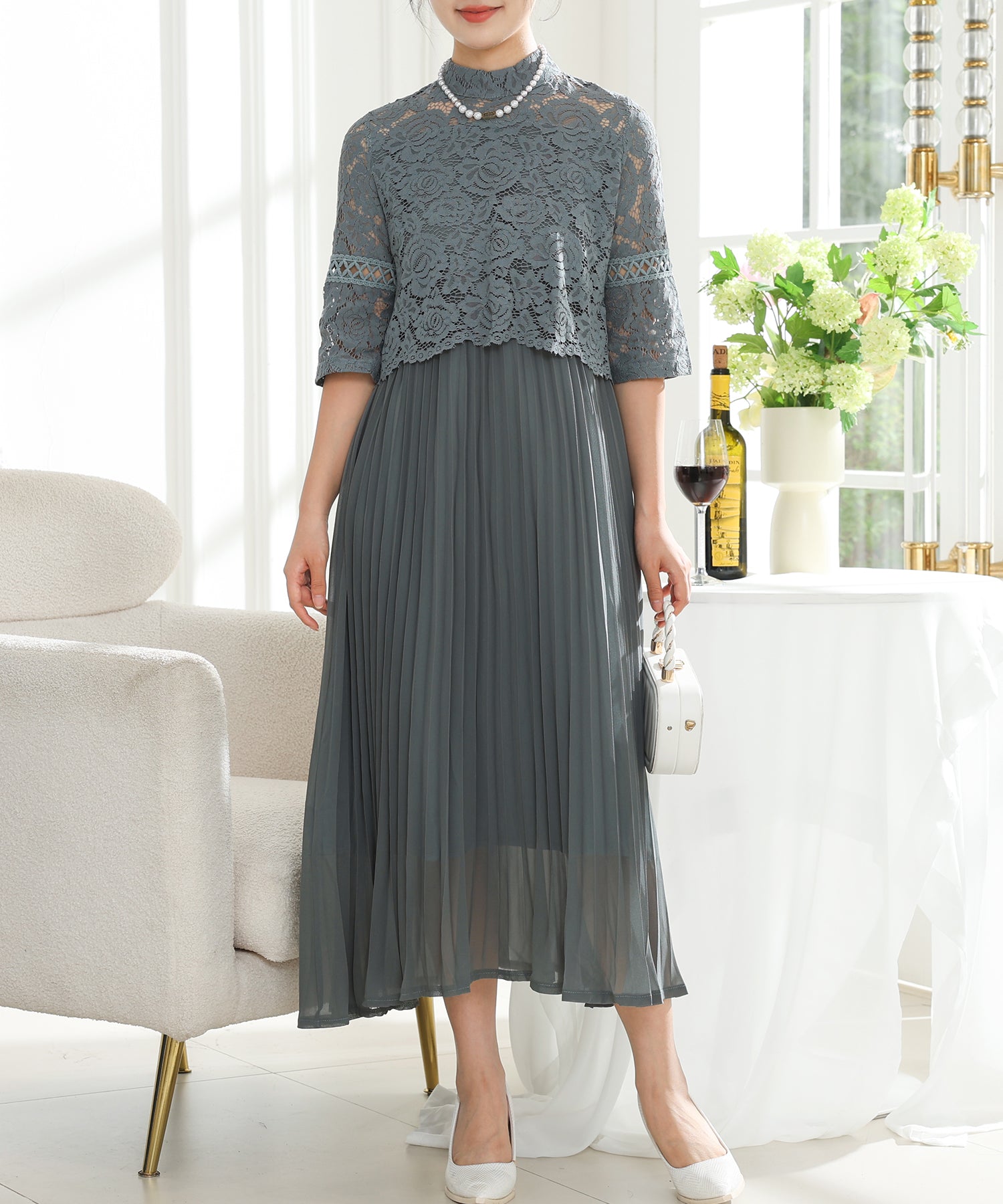 ビスチェ風 レース 切り替え 6分袖 ワンピース