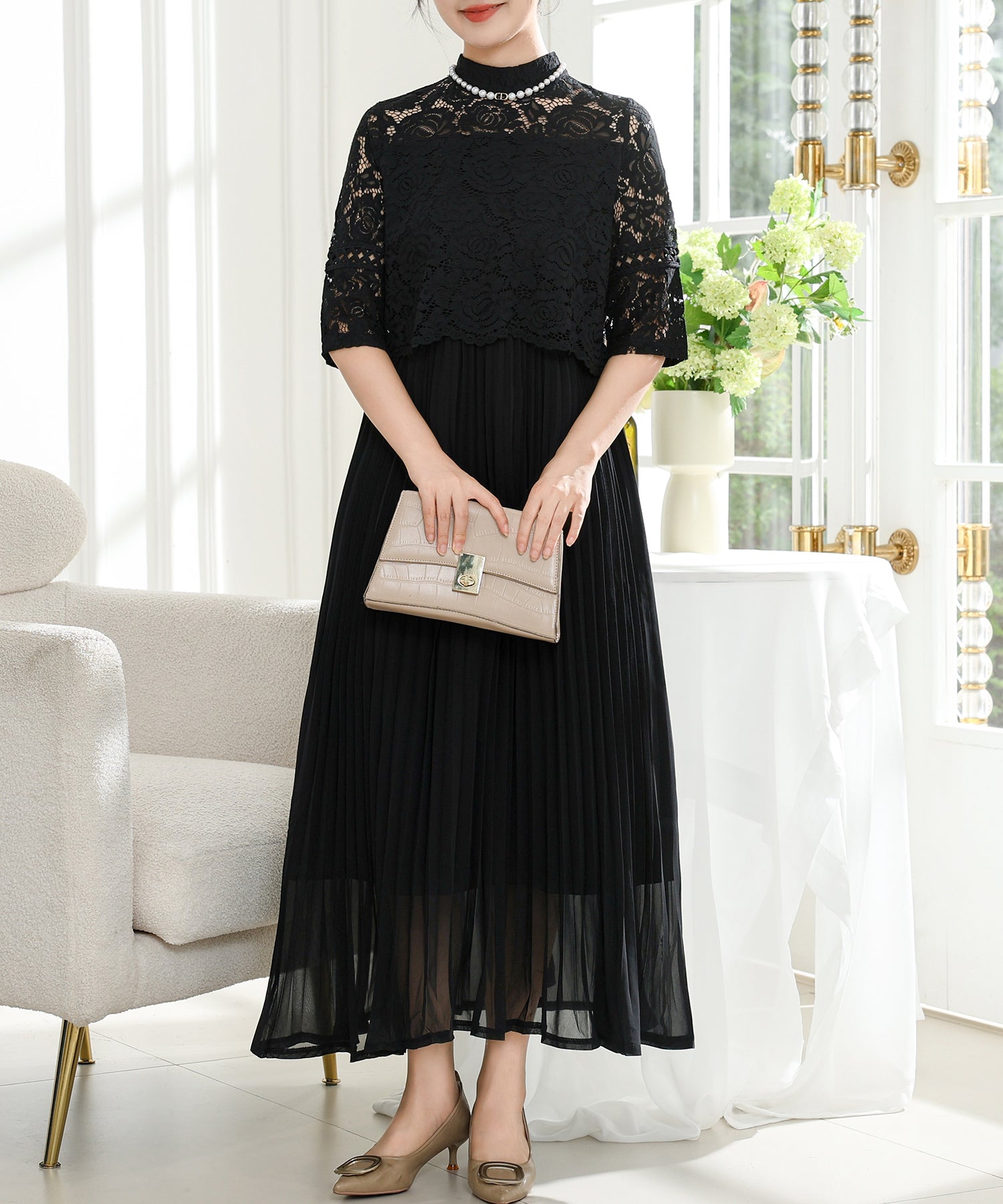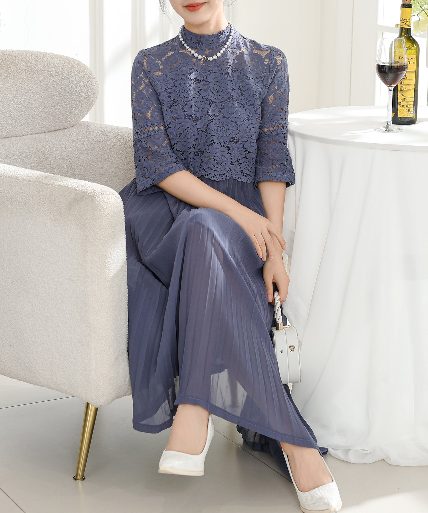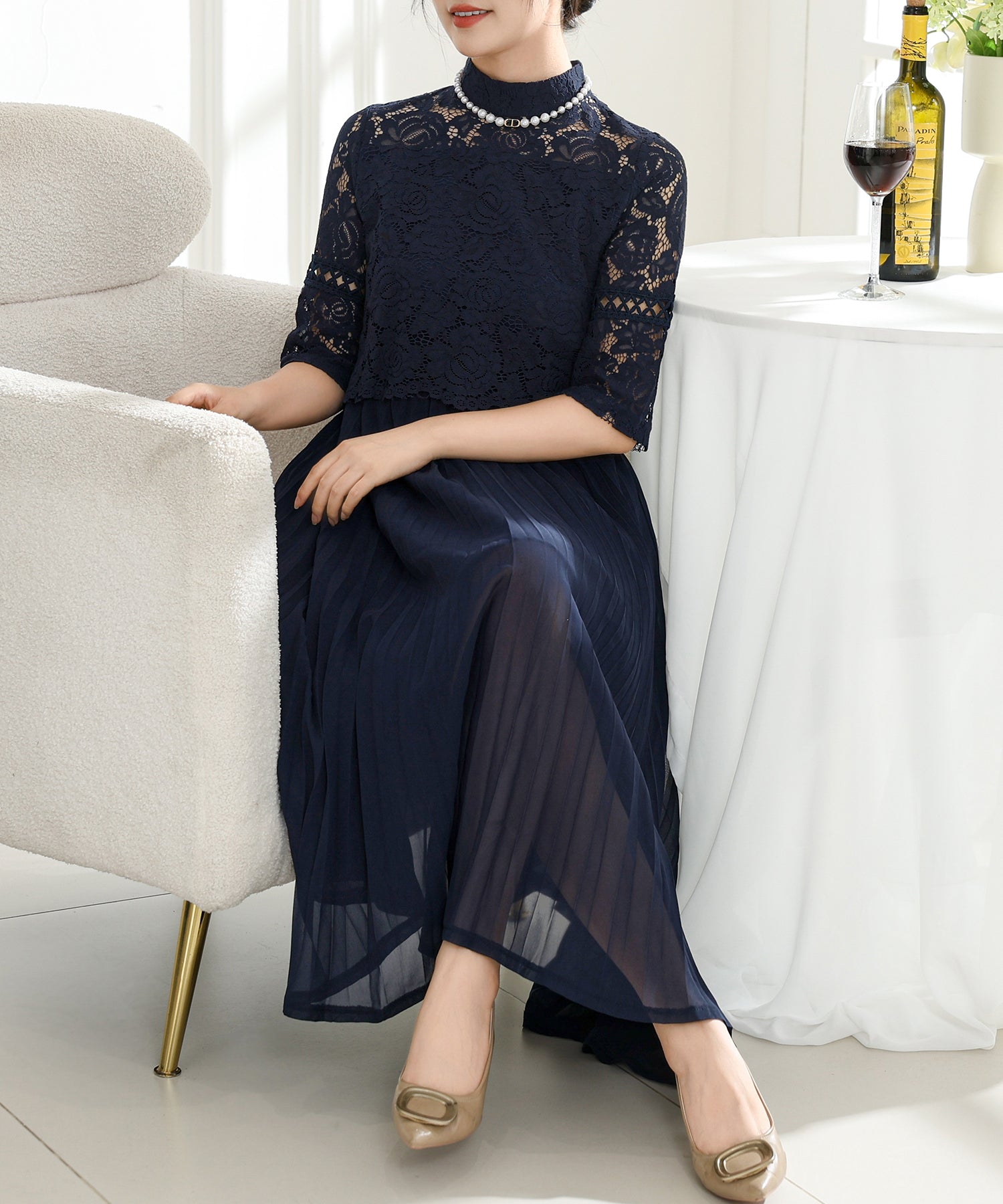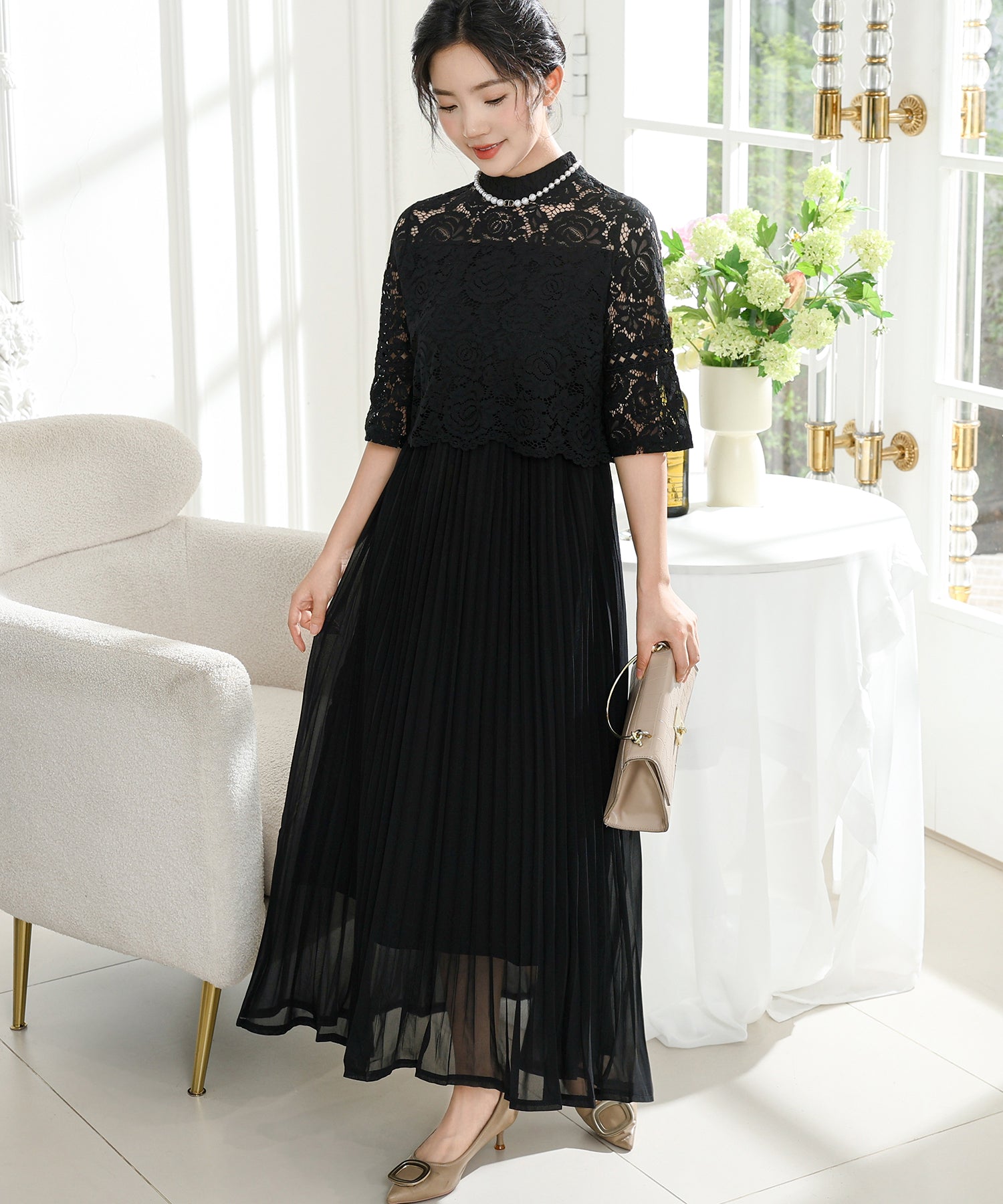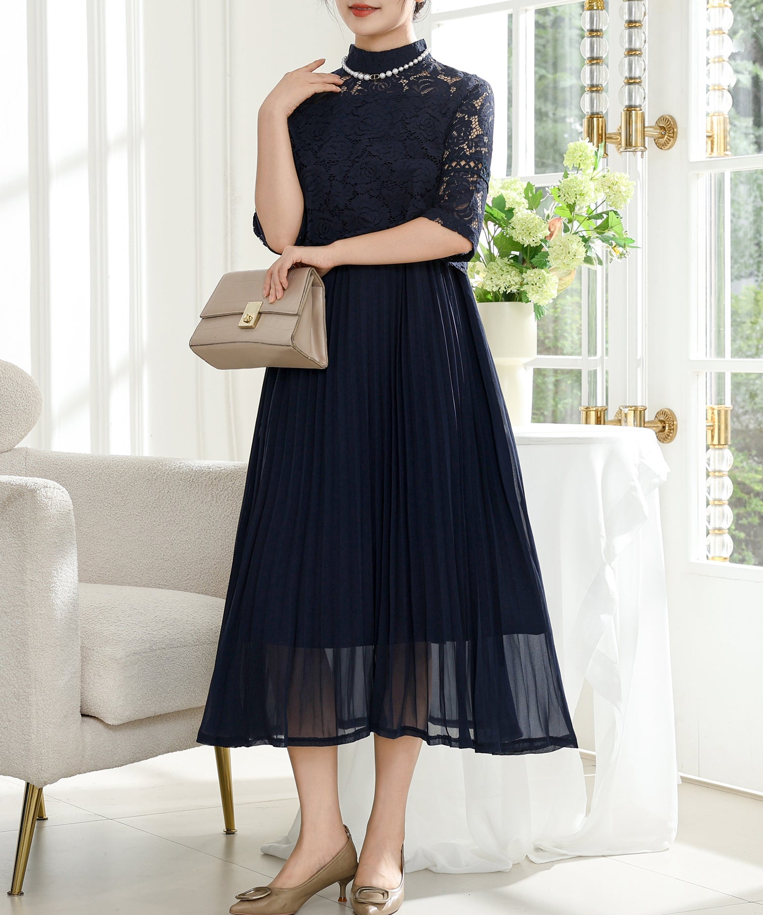 ビスチェ風 レース 切り替え 6分袖 ワンピース