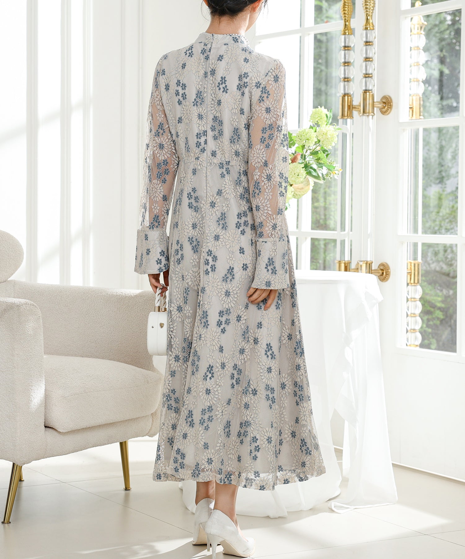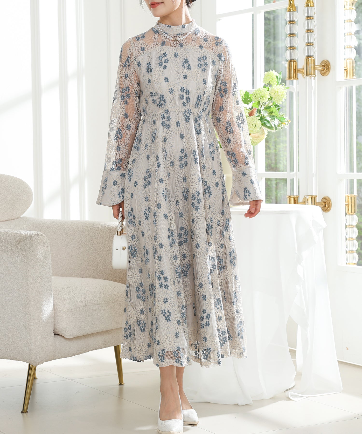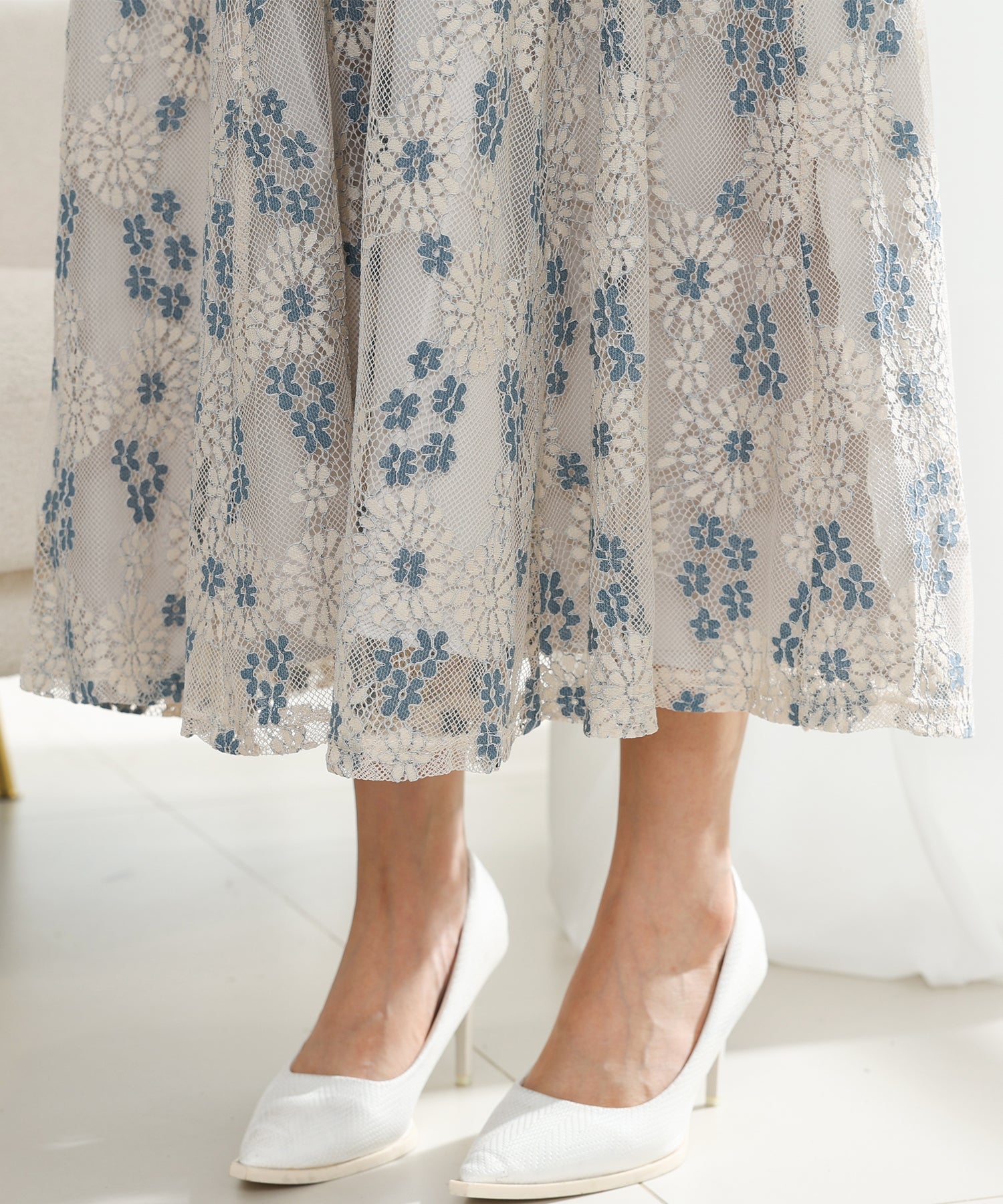 チュールフリル シアー 切り替え フレア ロング ドレス