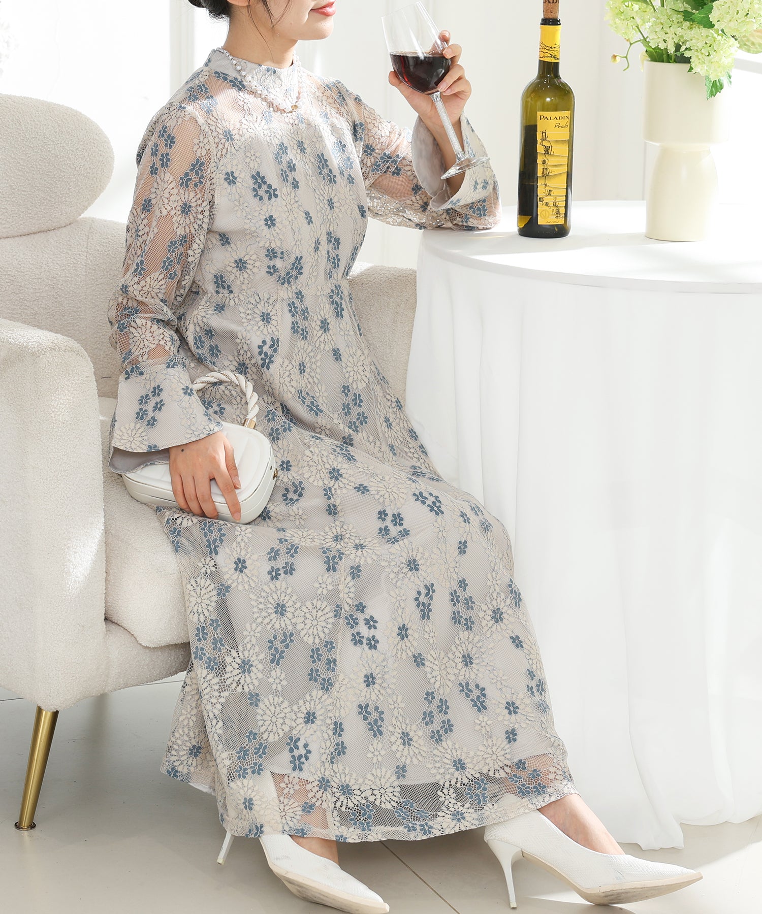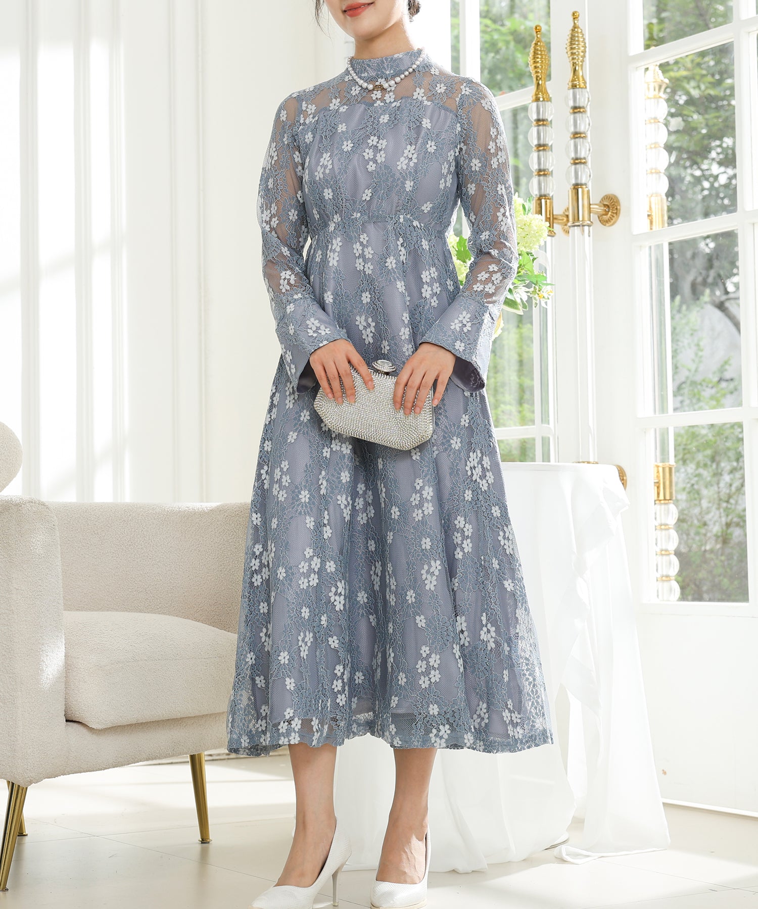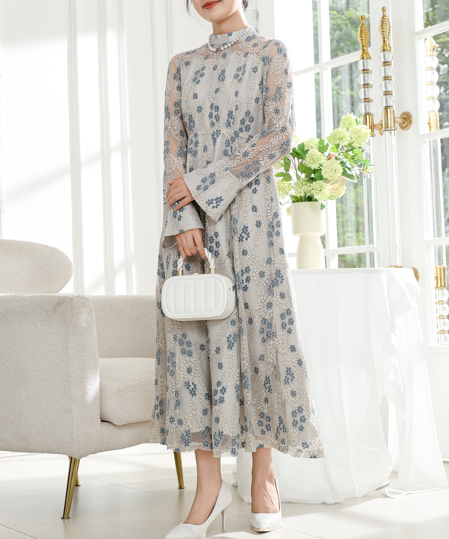 チュールフリル シアー 切り替え フレア ロング ドレス