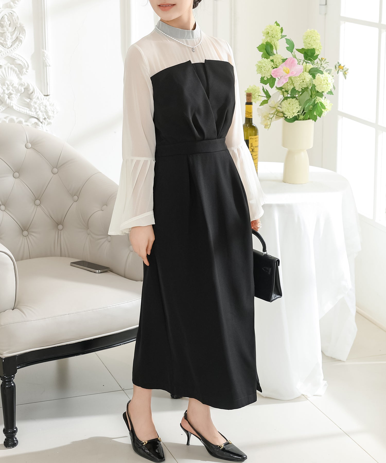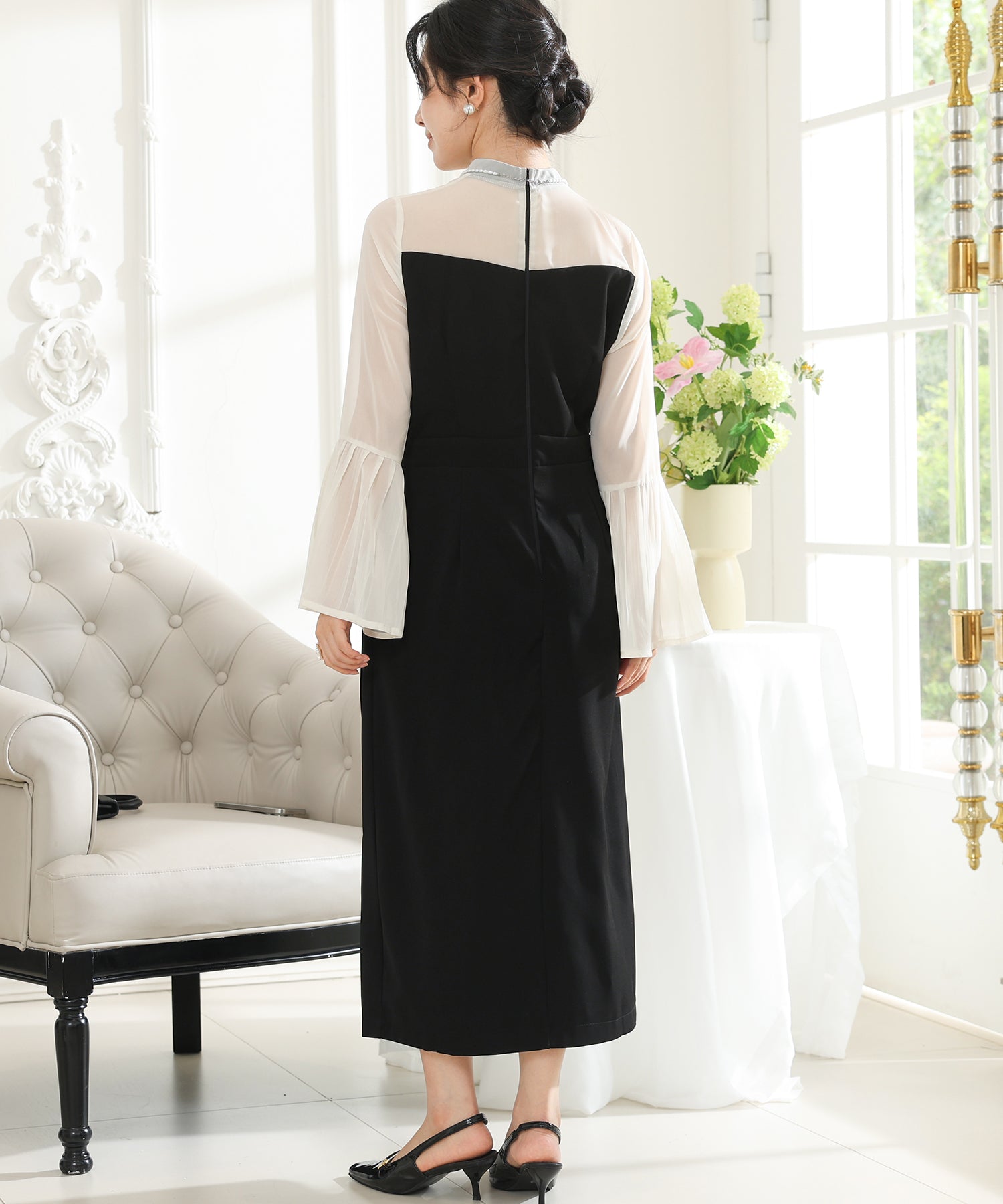 チュールフリル シアー 切り替え フレア ロング ドレス