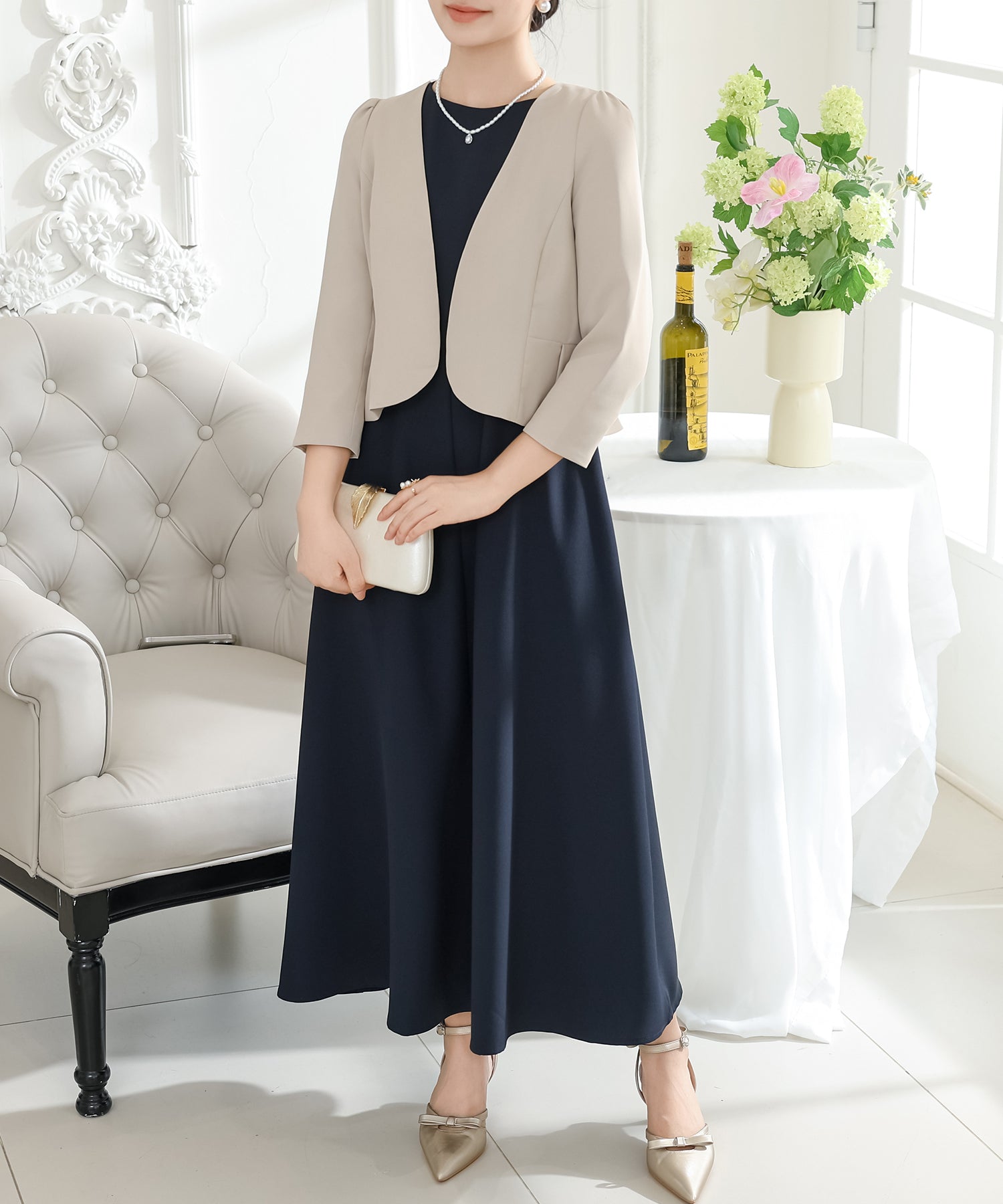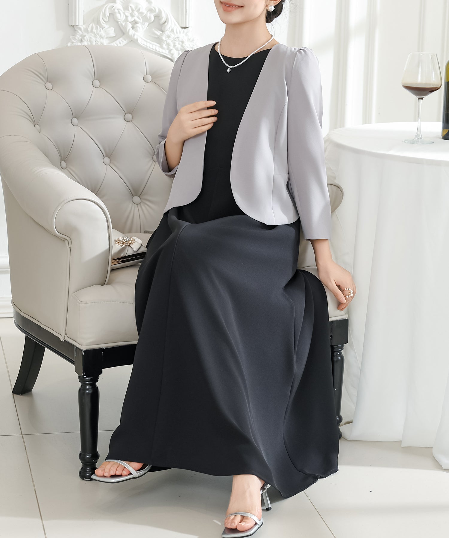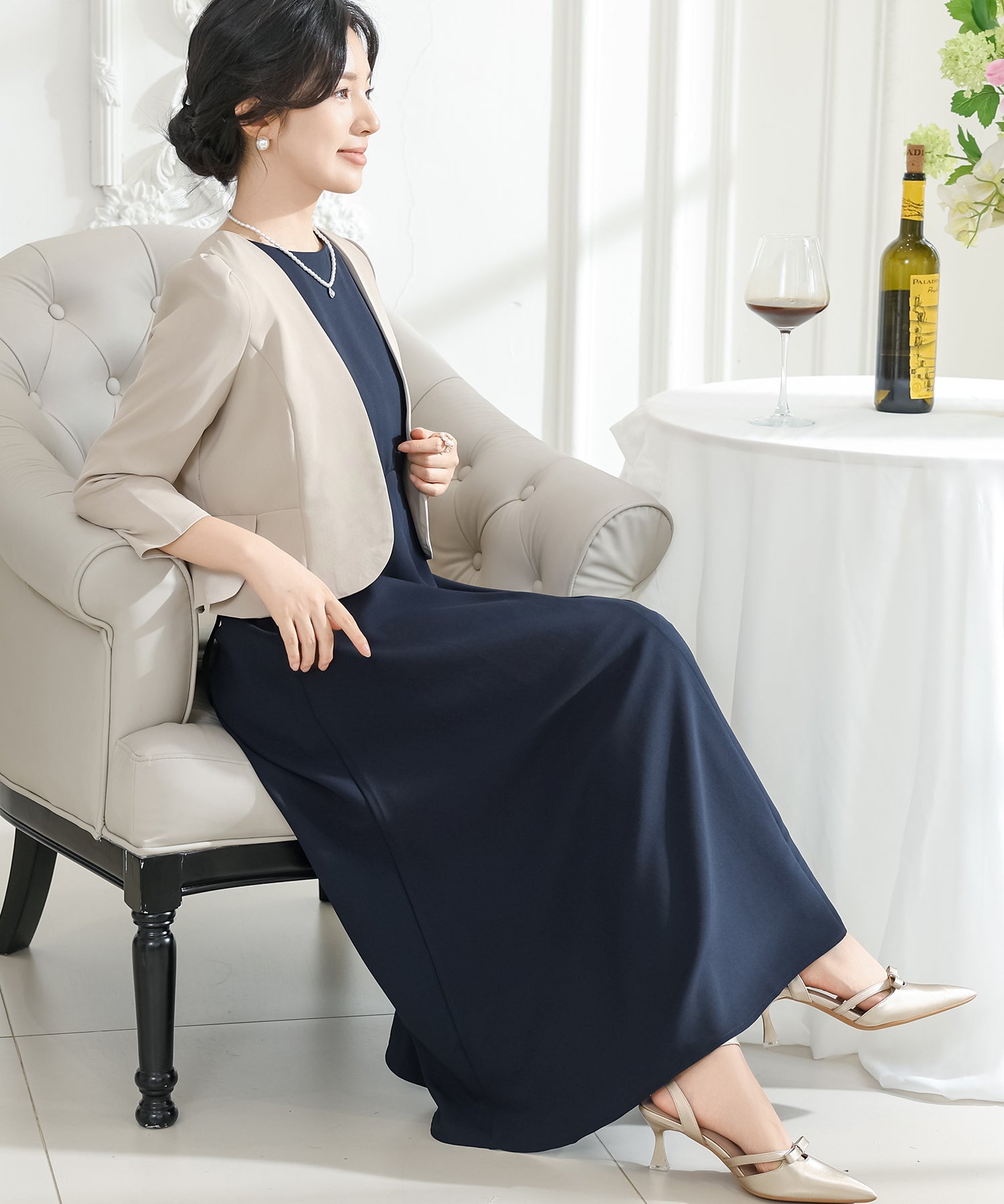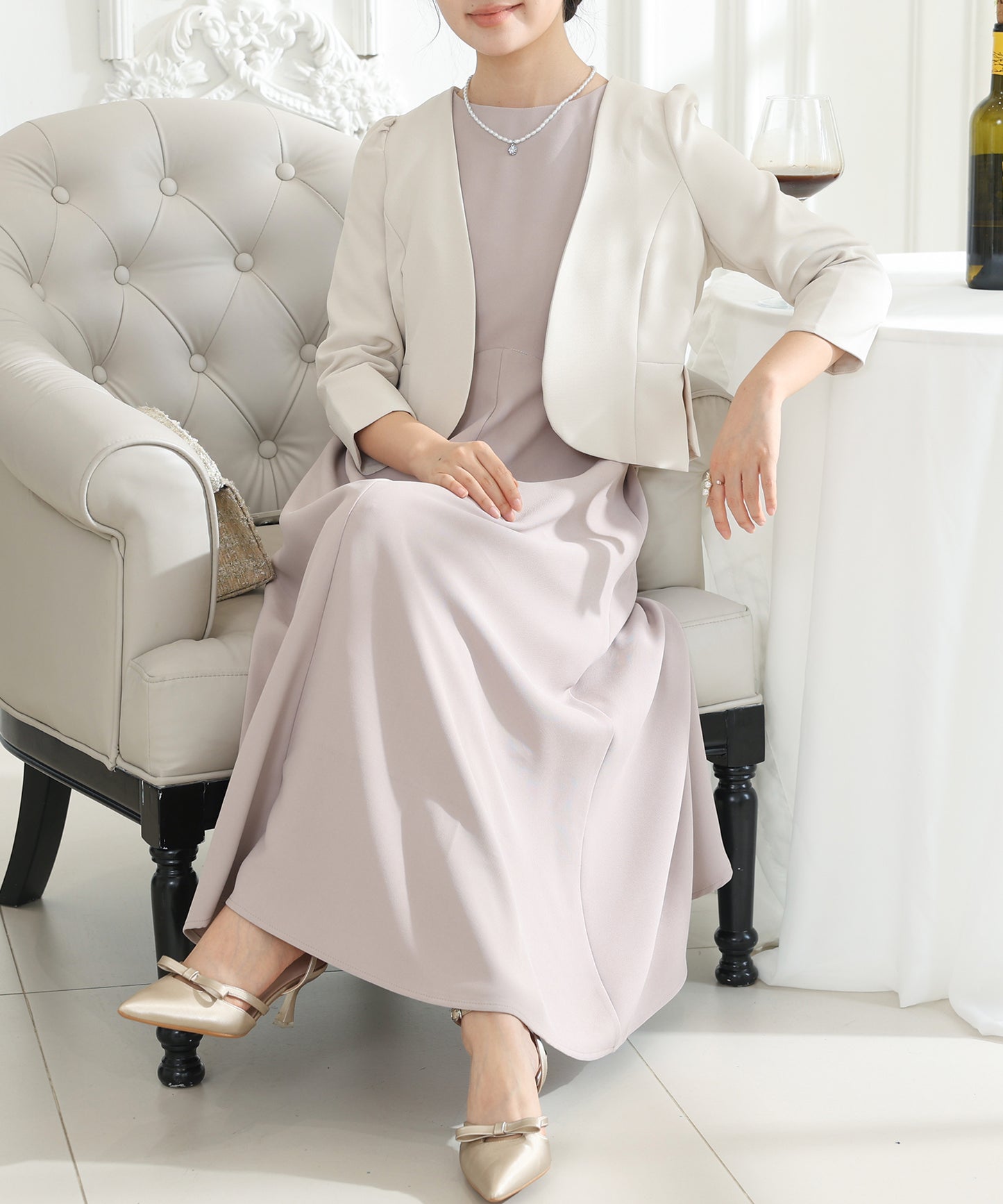 ジャケットはロング丈のドレスに合わせてジャストな丈感をチョイス。