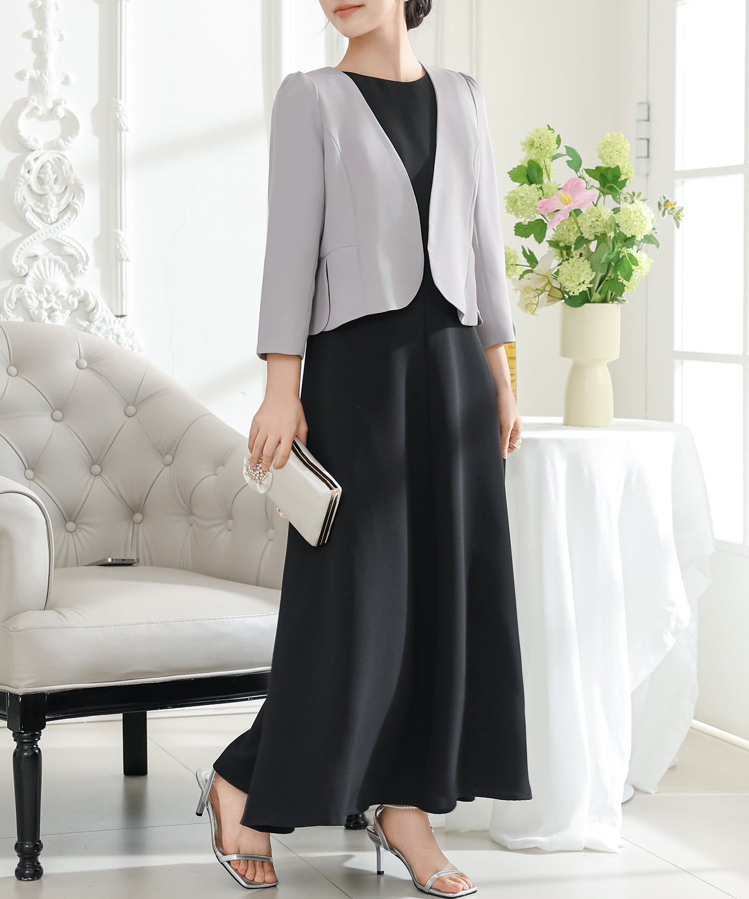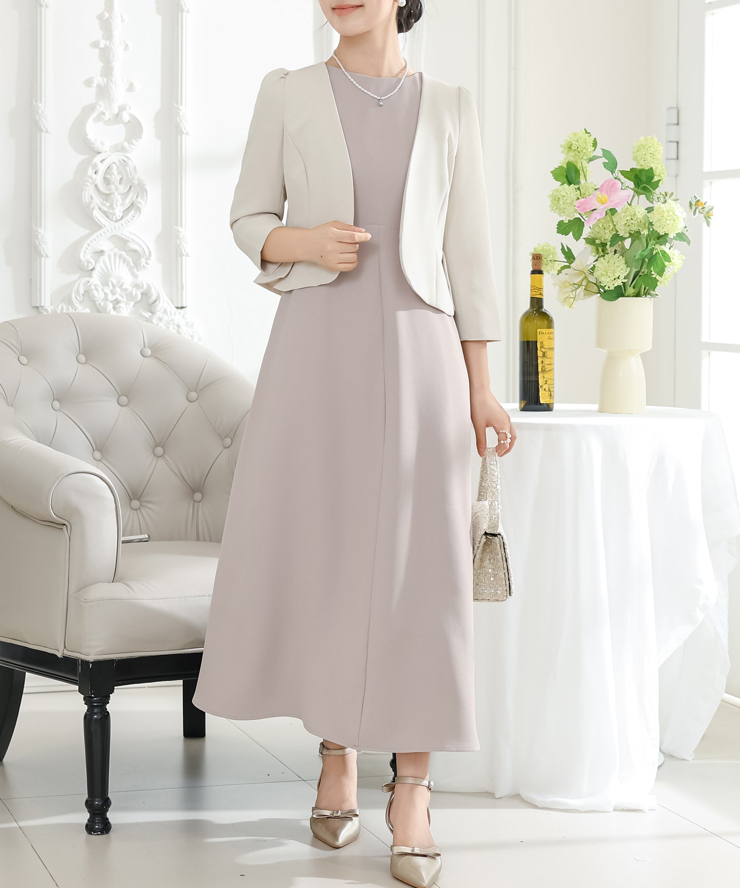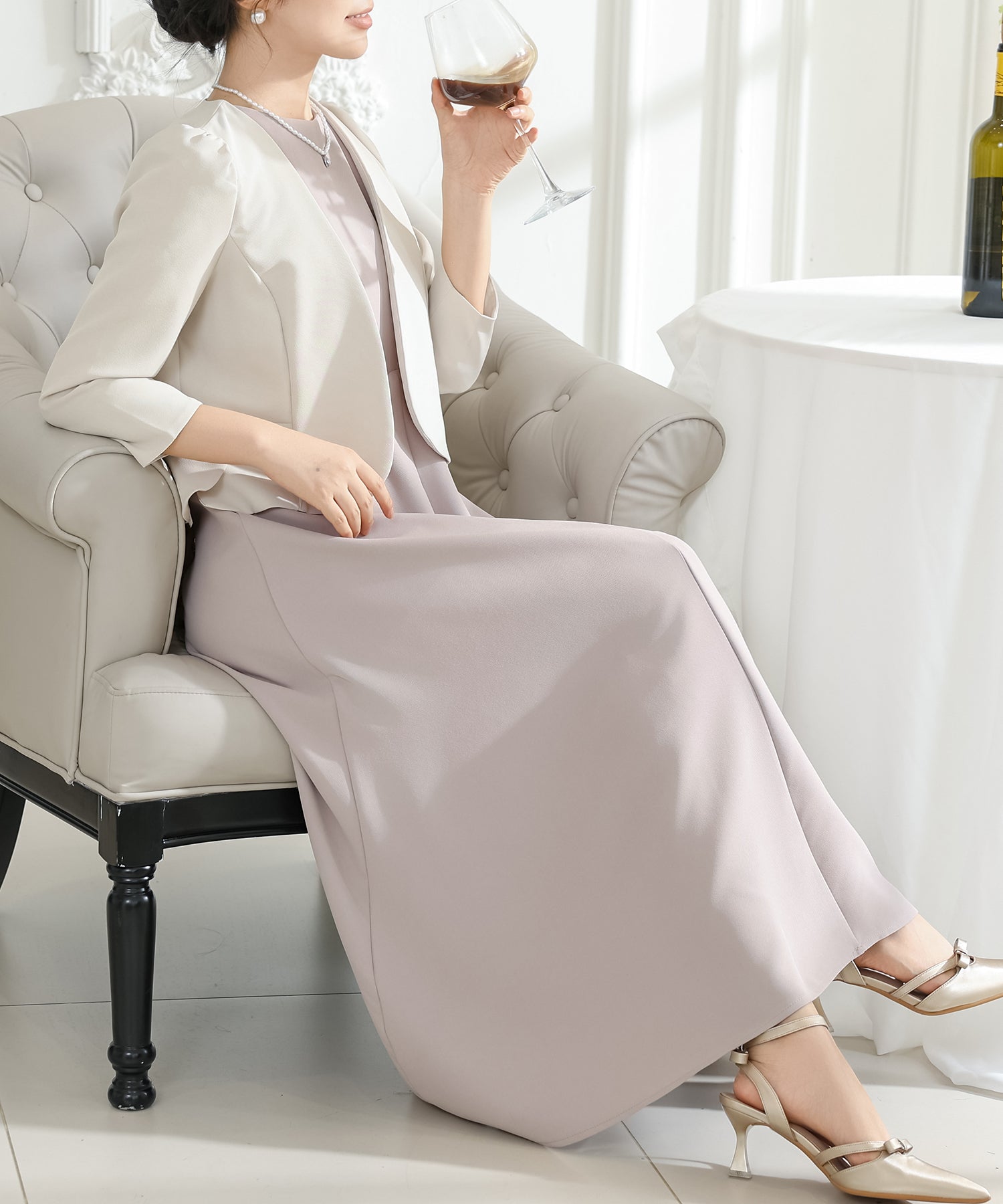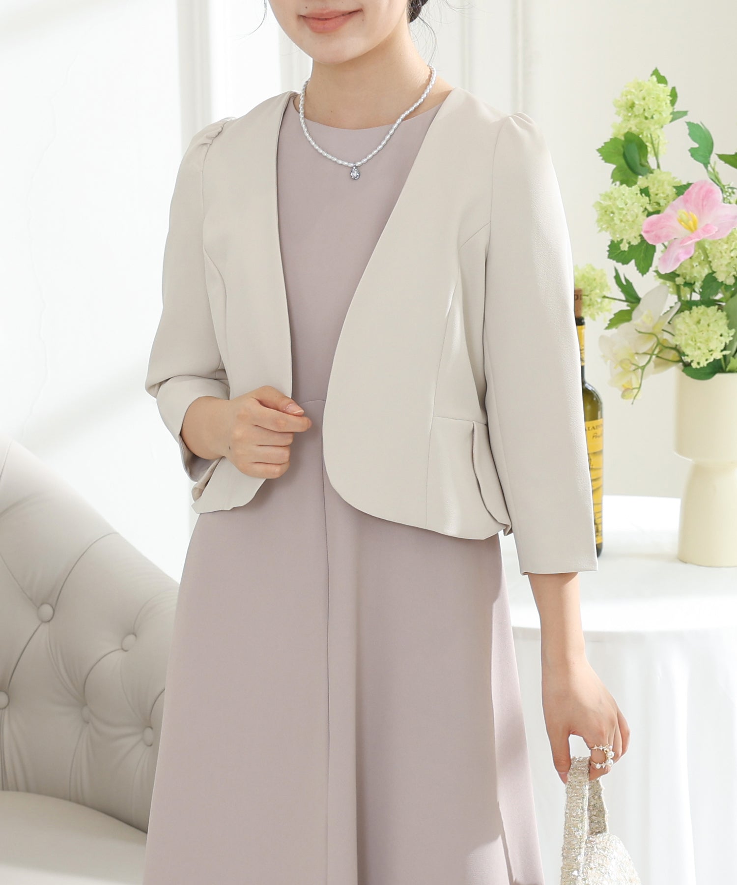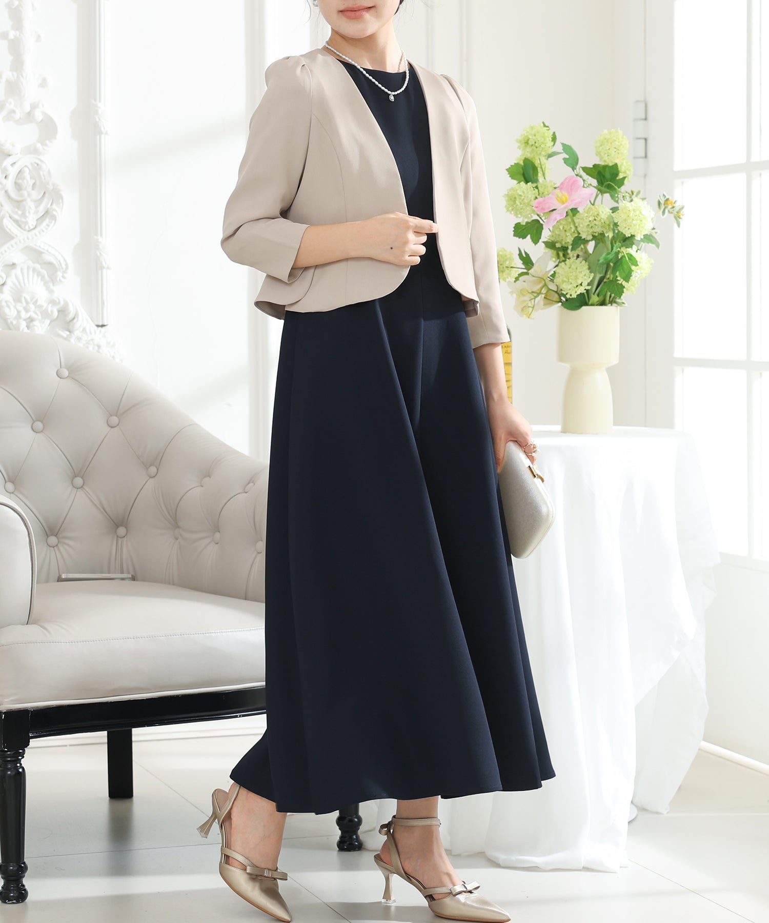 ジャケットはロング丈のドレスに合わせてジャストな丈感をチョイス。