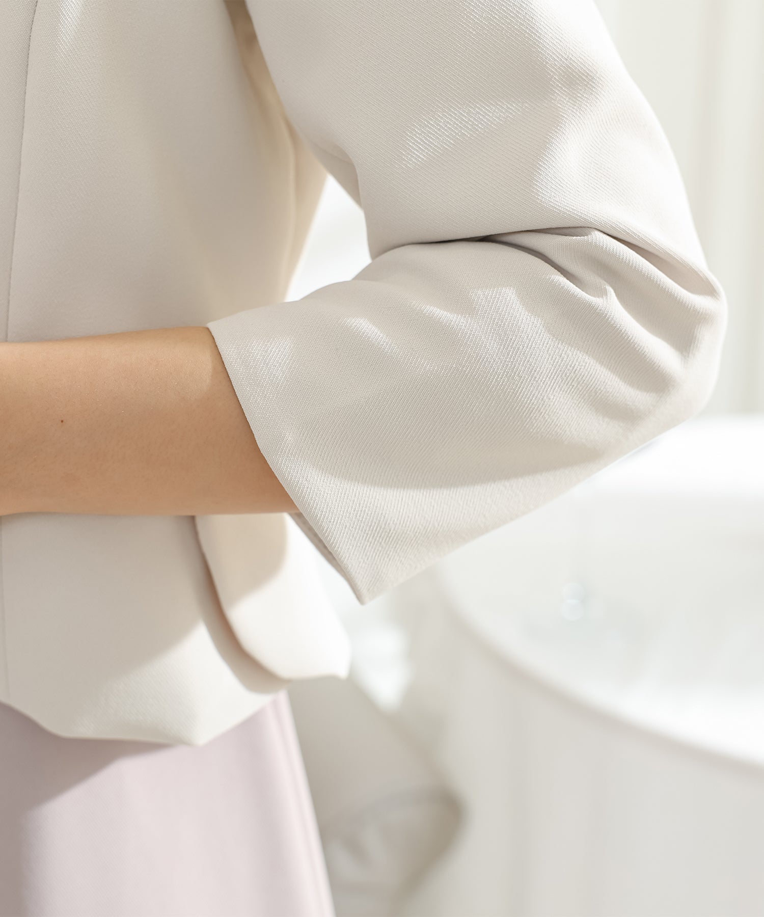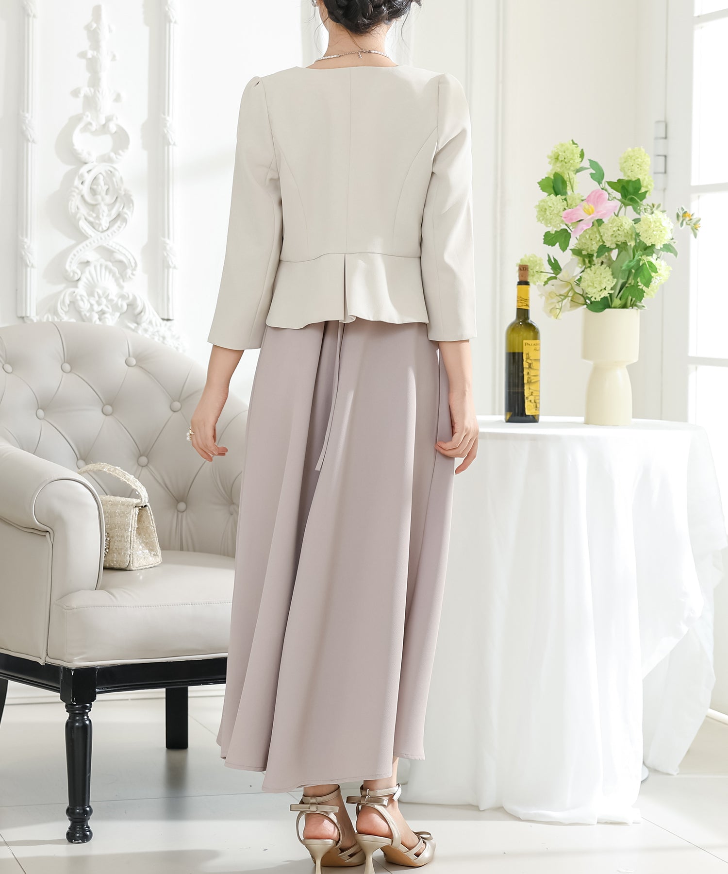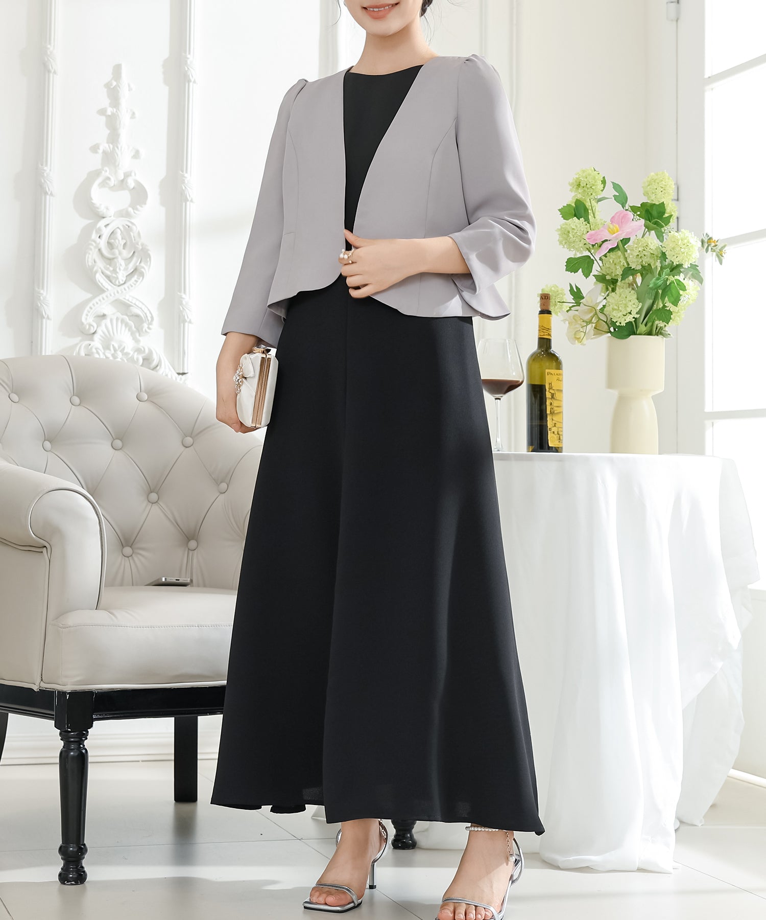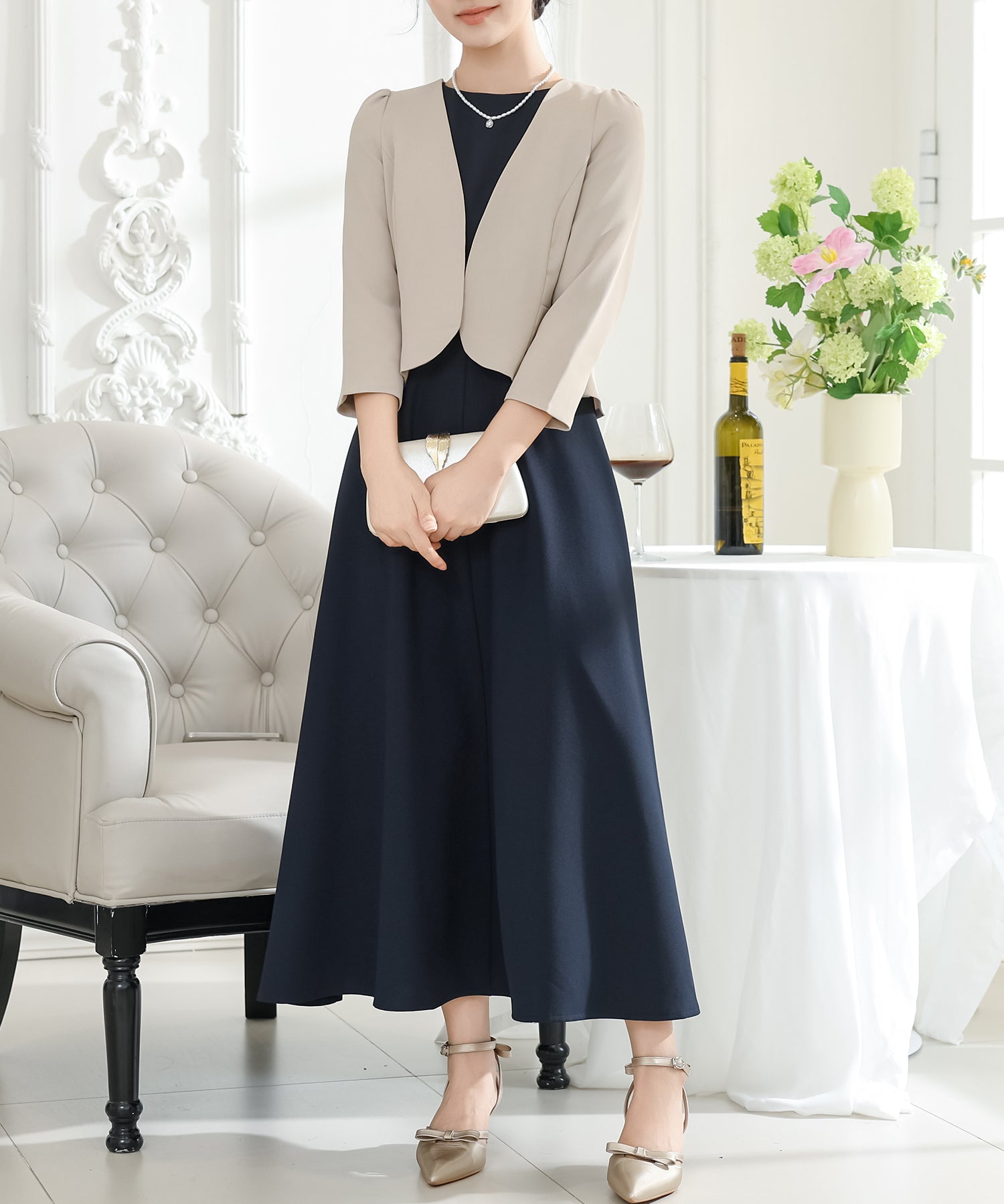 ジャケットはロング丈のドレスに合わせてジャストな丈感をチョイス。