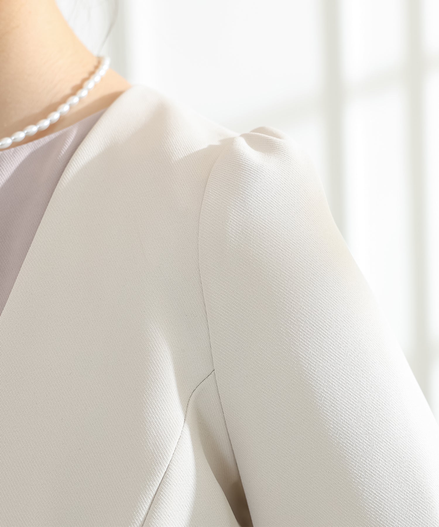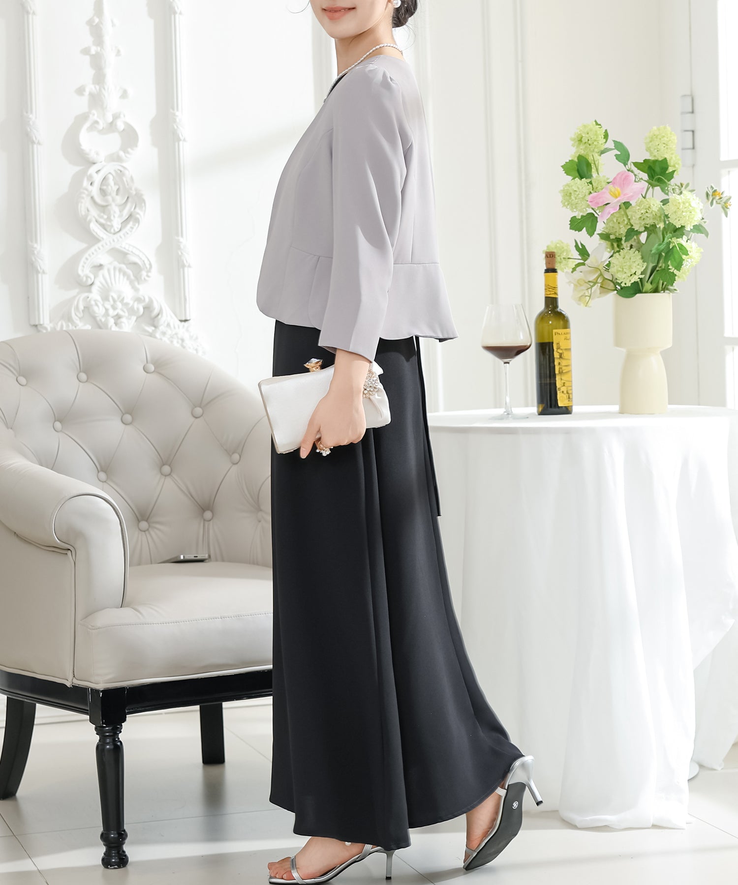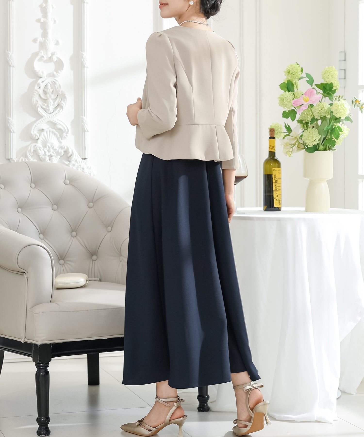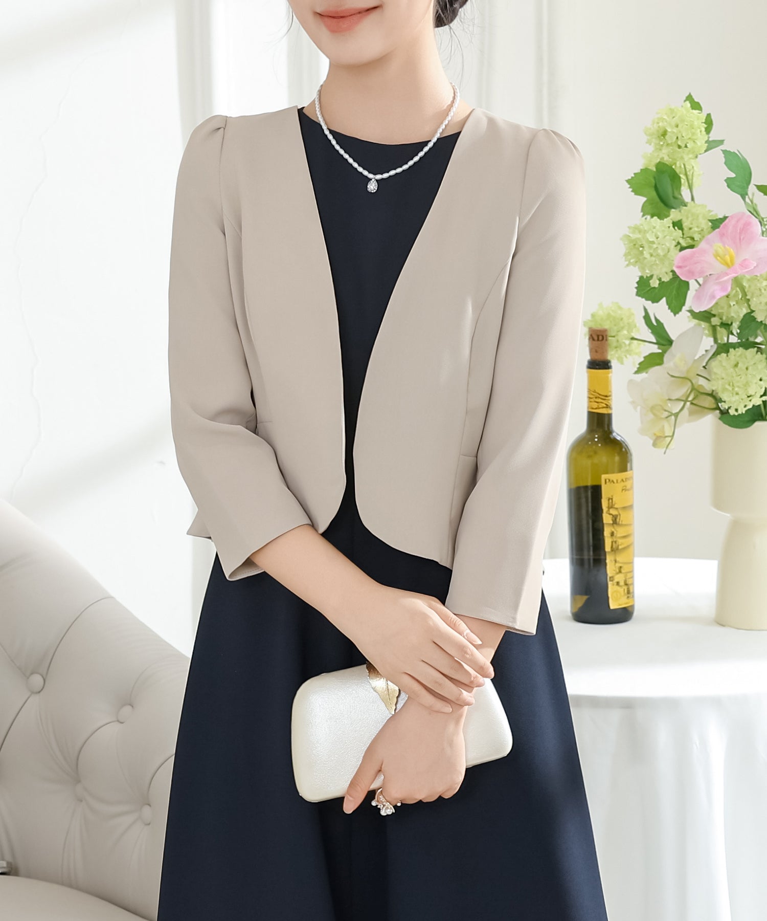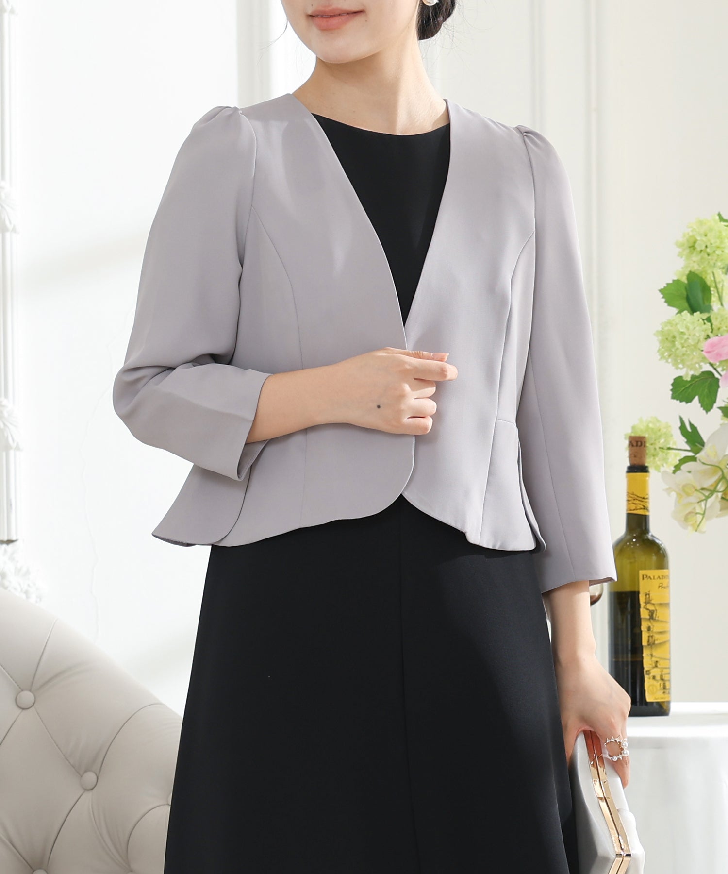 ジャケットはロング丈のドレスに合わせてジャストな丈感をチョイス。