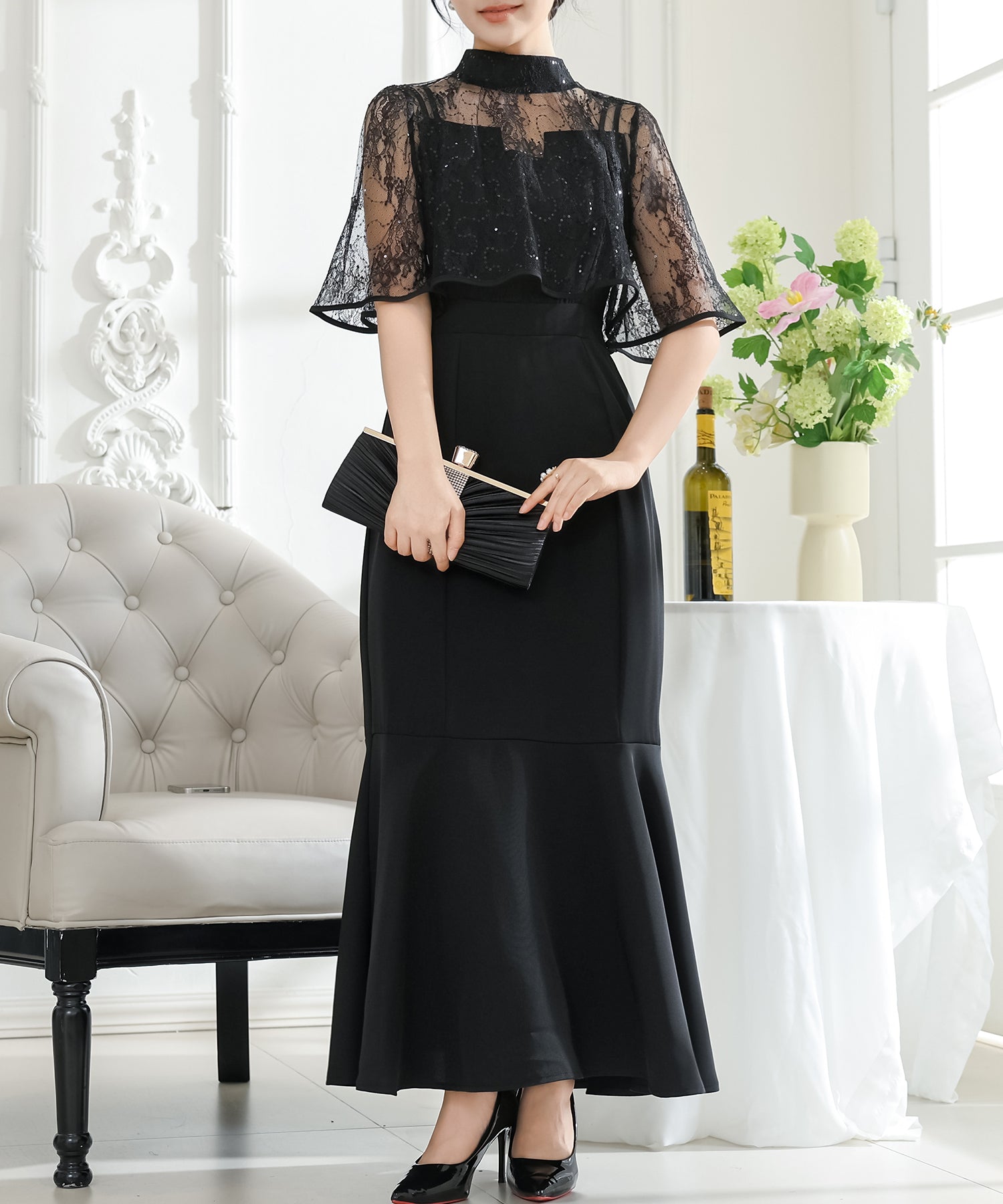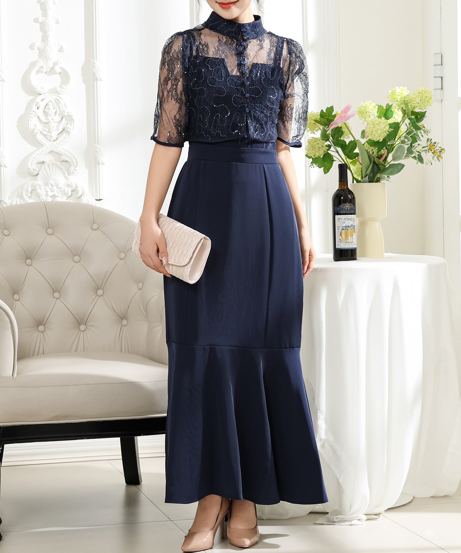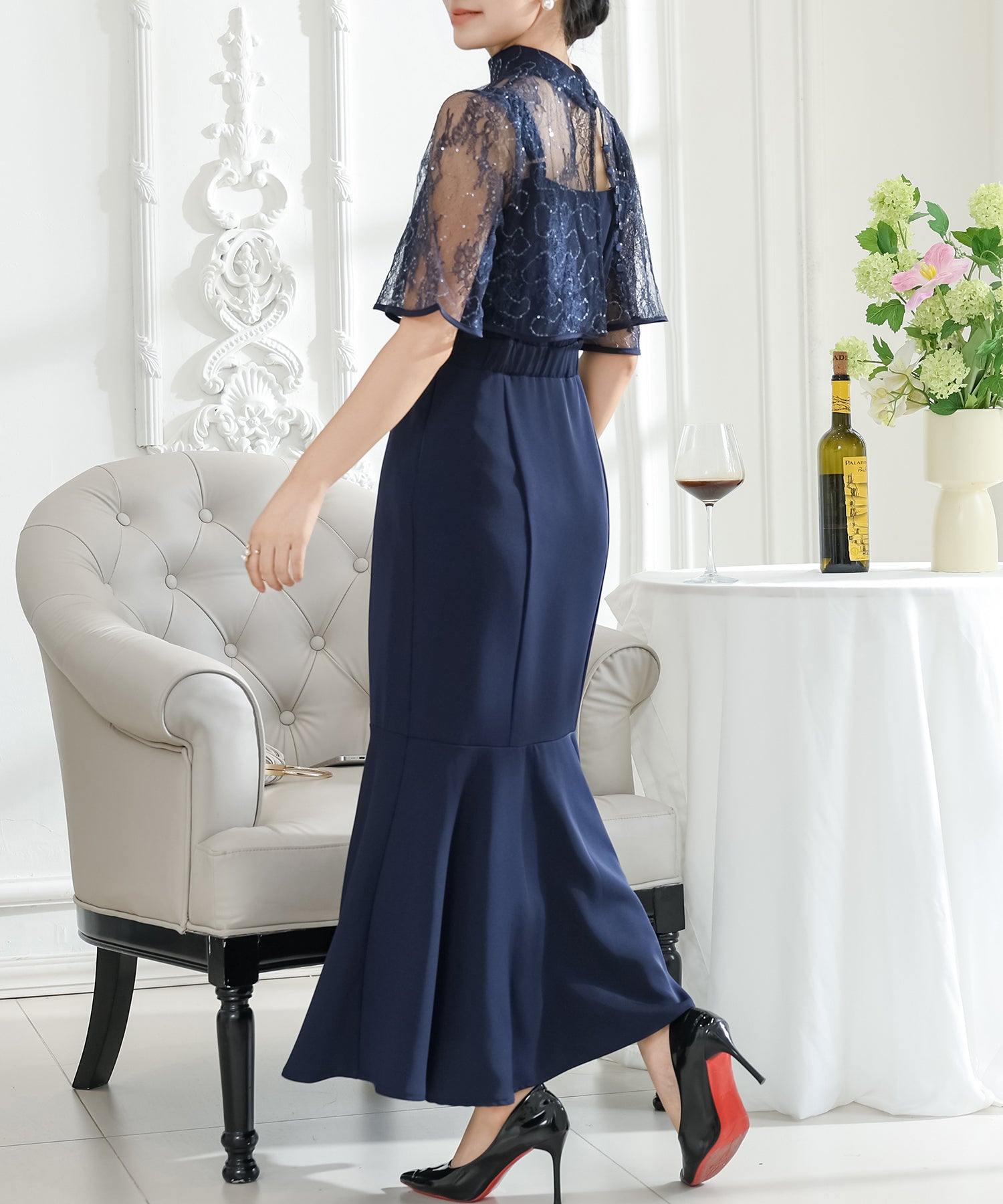 歩くたびにエレガントに揺れる、マーメイドスカートが印象的なワンピース。