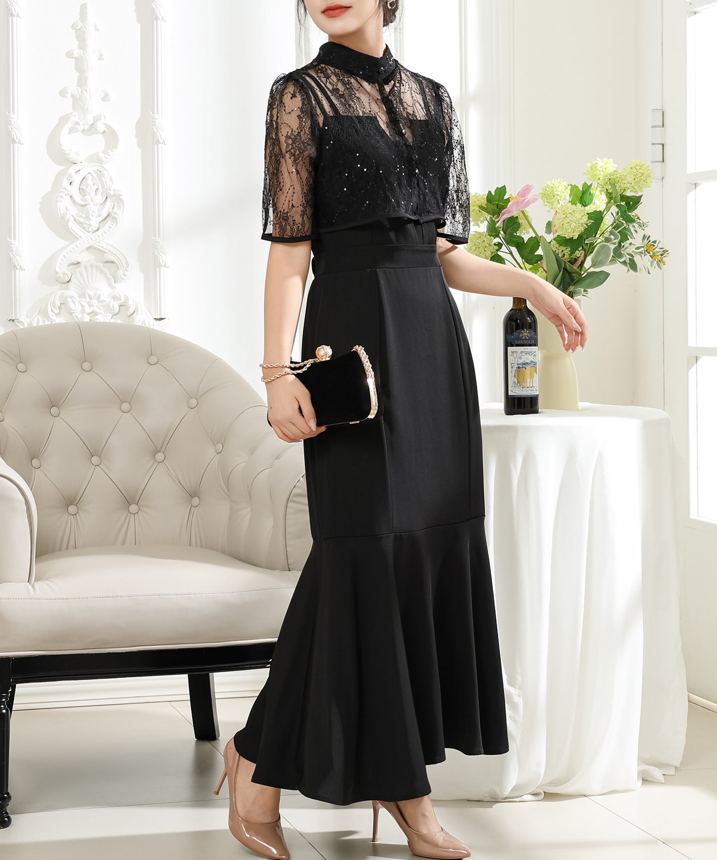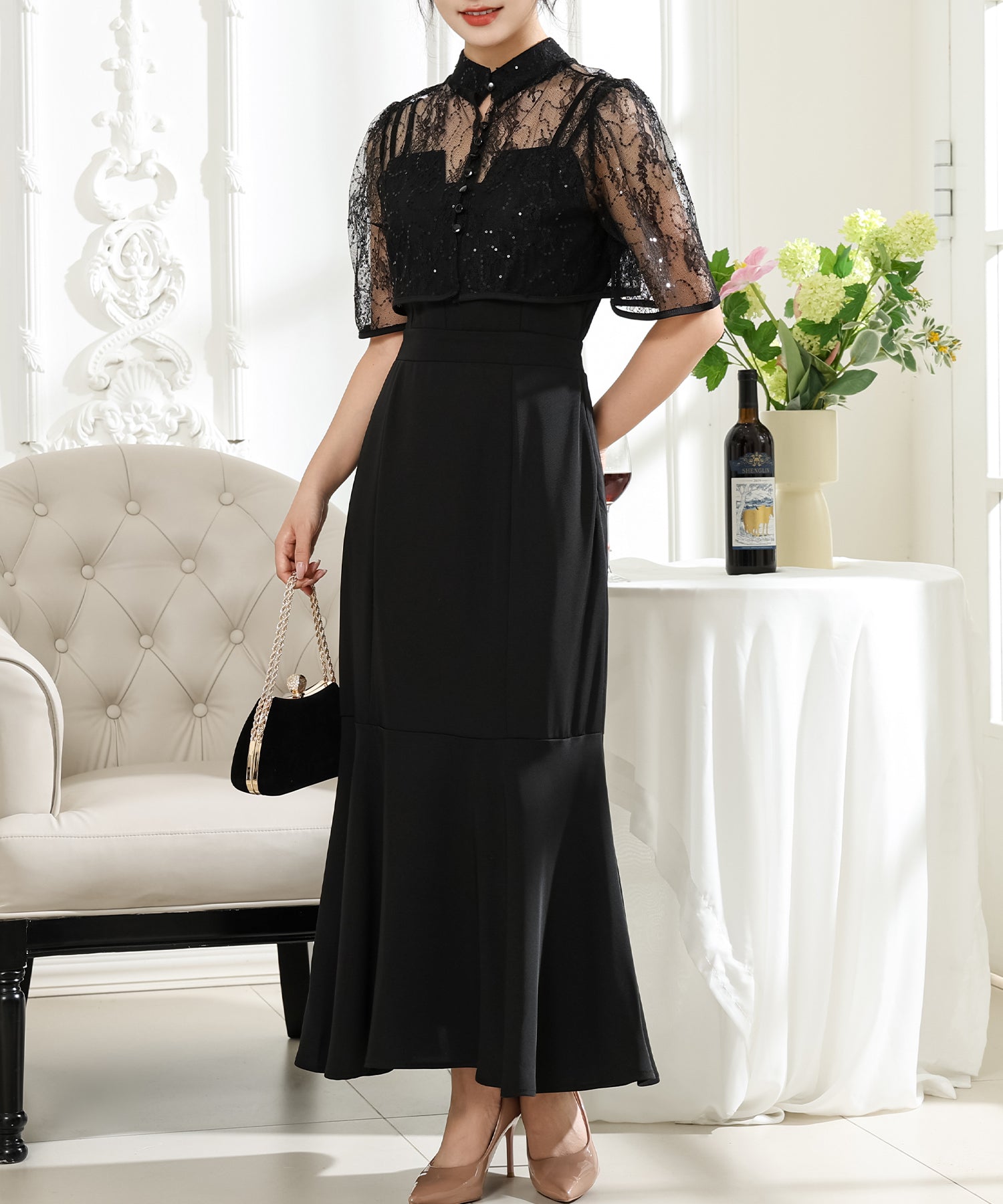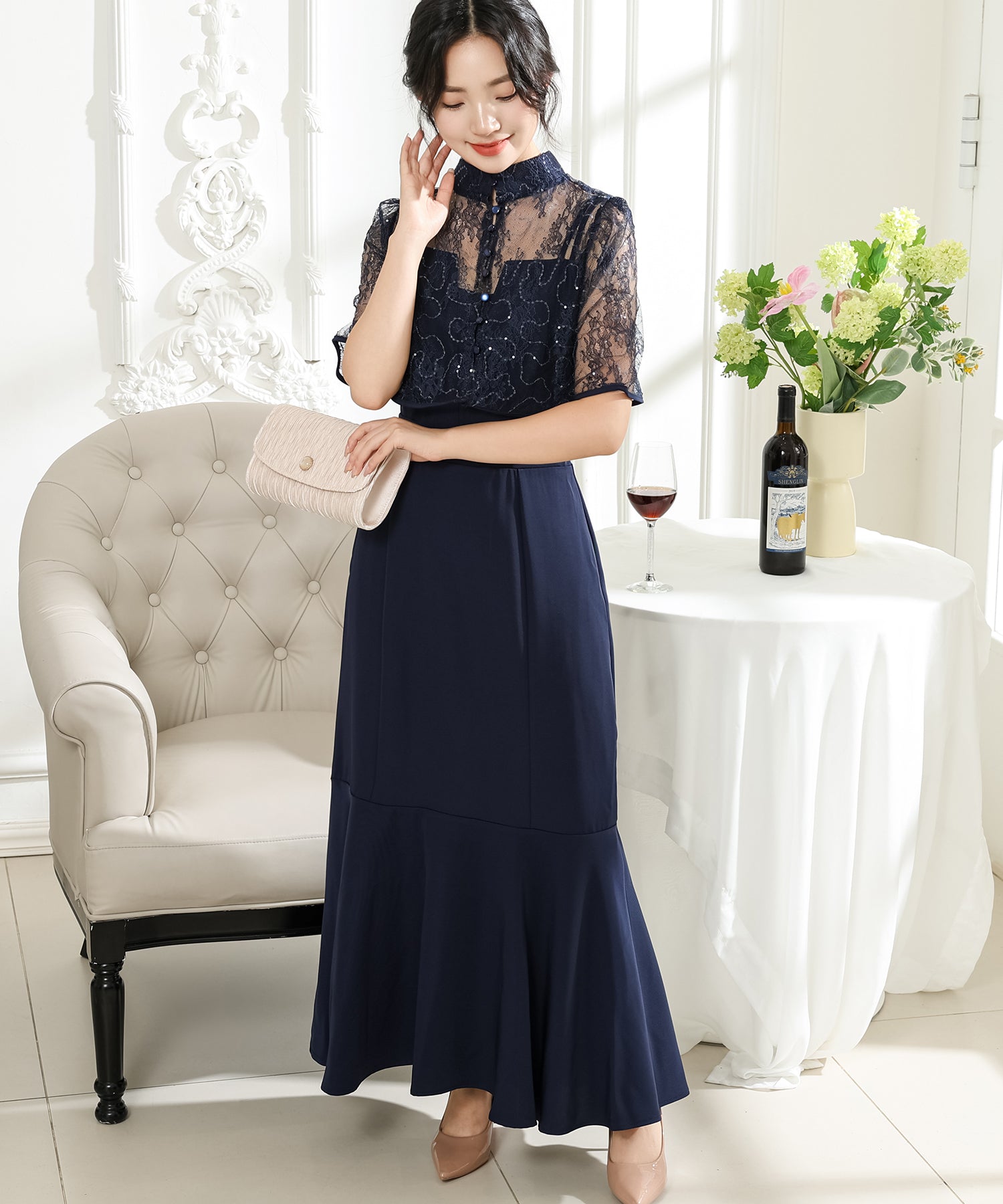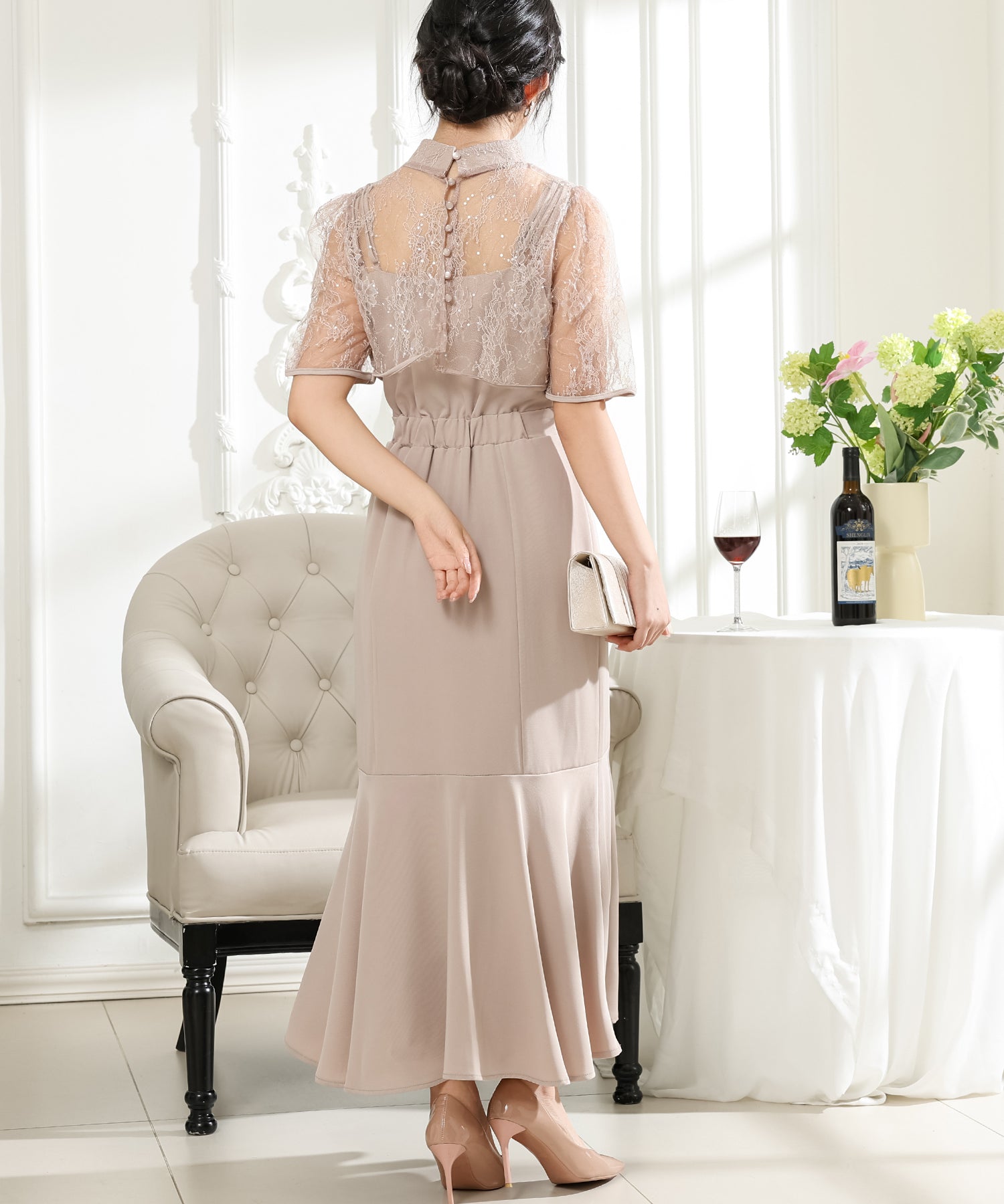 歩くたびにエレガントに揺れる、マーメイドスカートが印象的なワンピース。