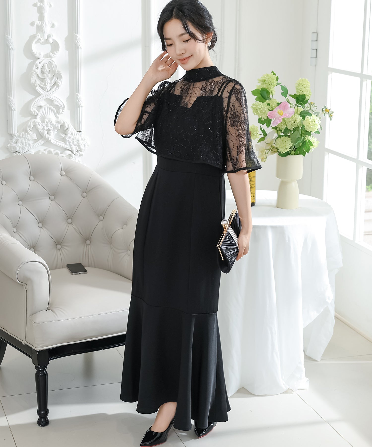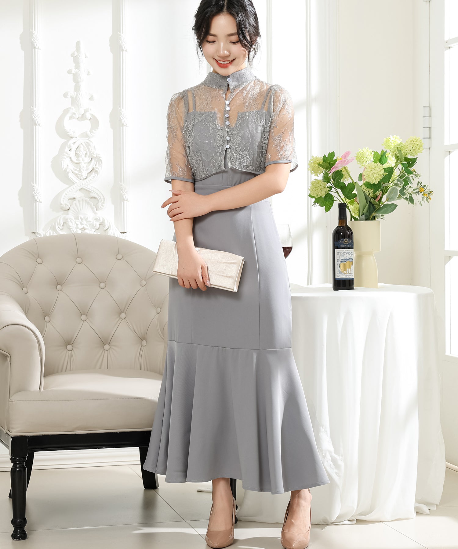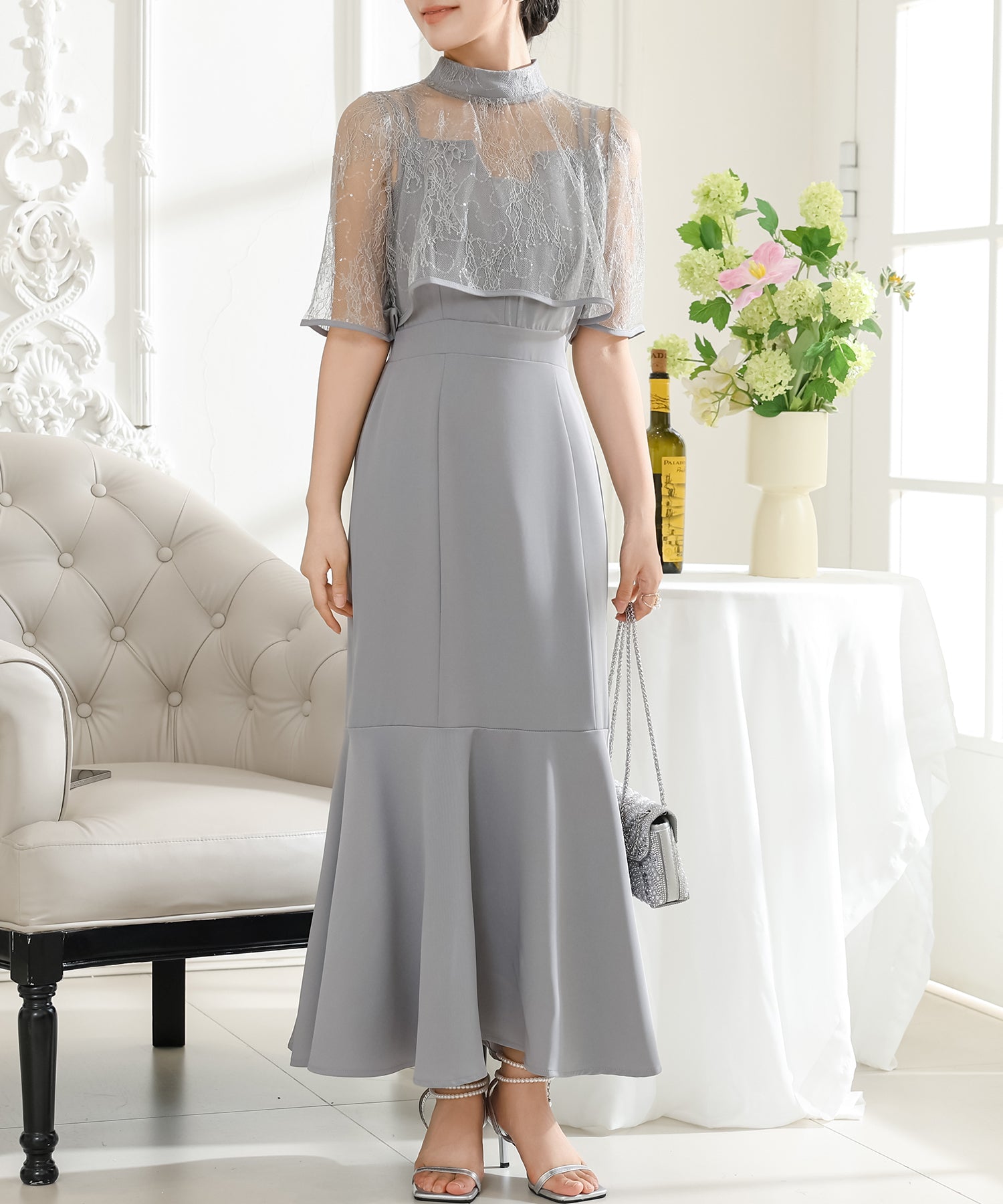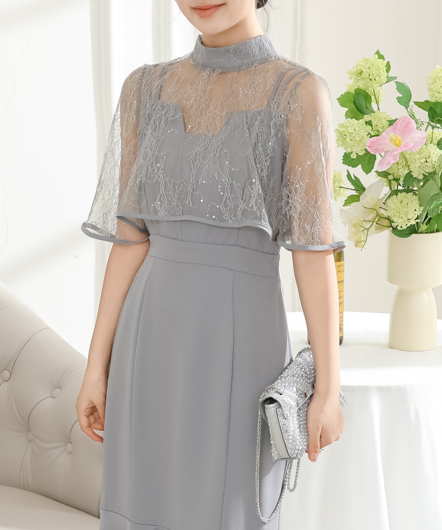 プチハイネックのレースボレロがセットになっており、その日の気分や着用シーンに合わせて、フェミニンな華やかさをプラスできるのもうれしいところ。