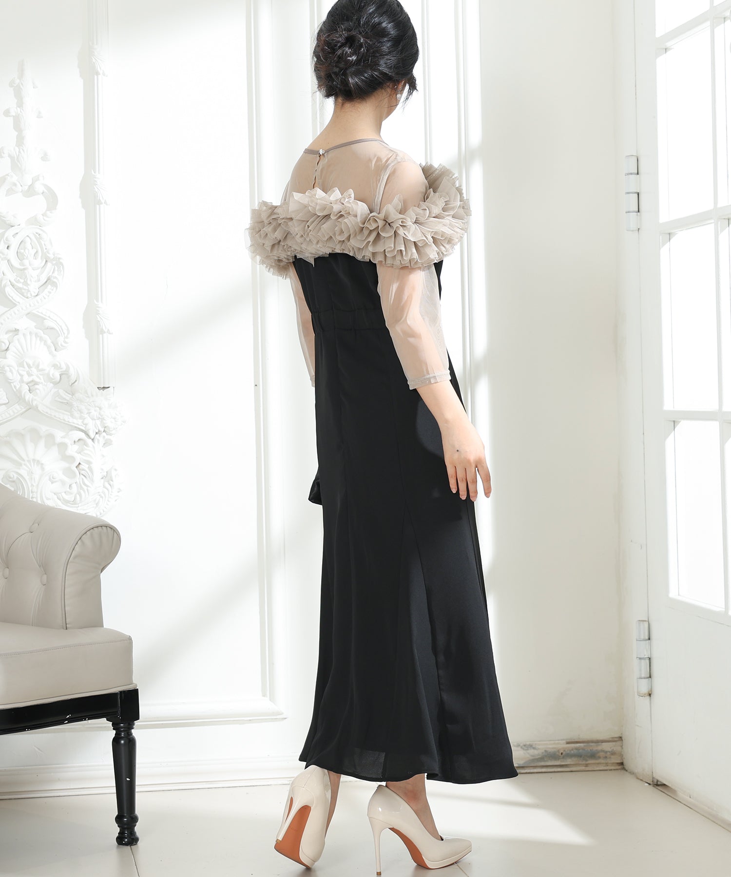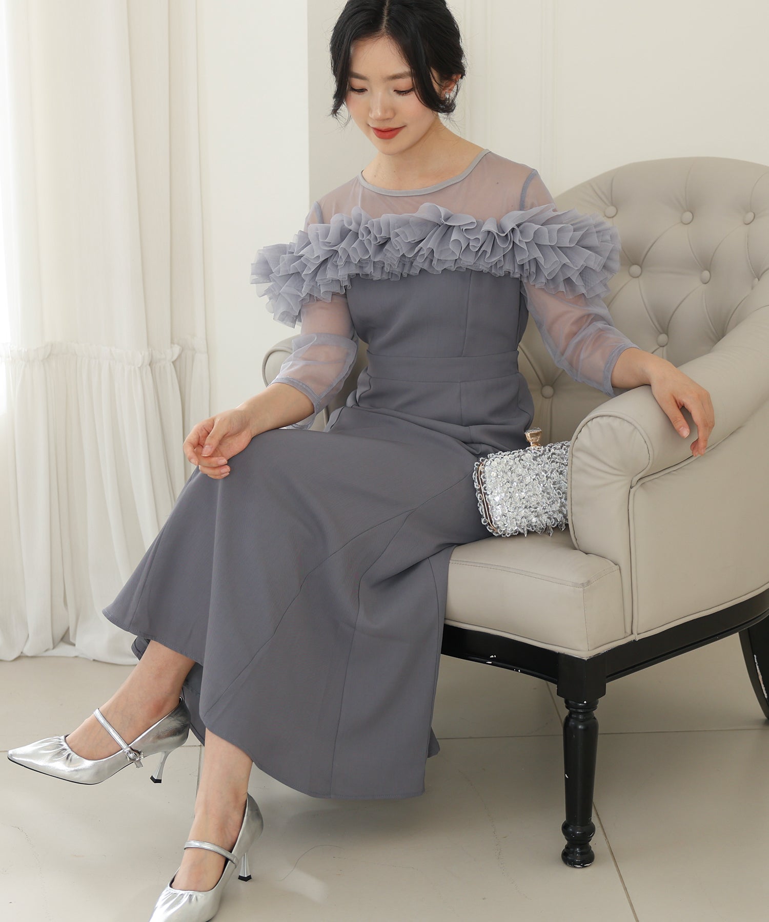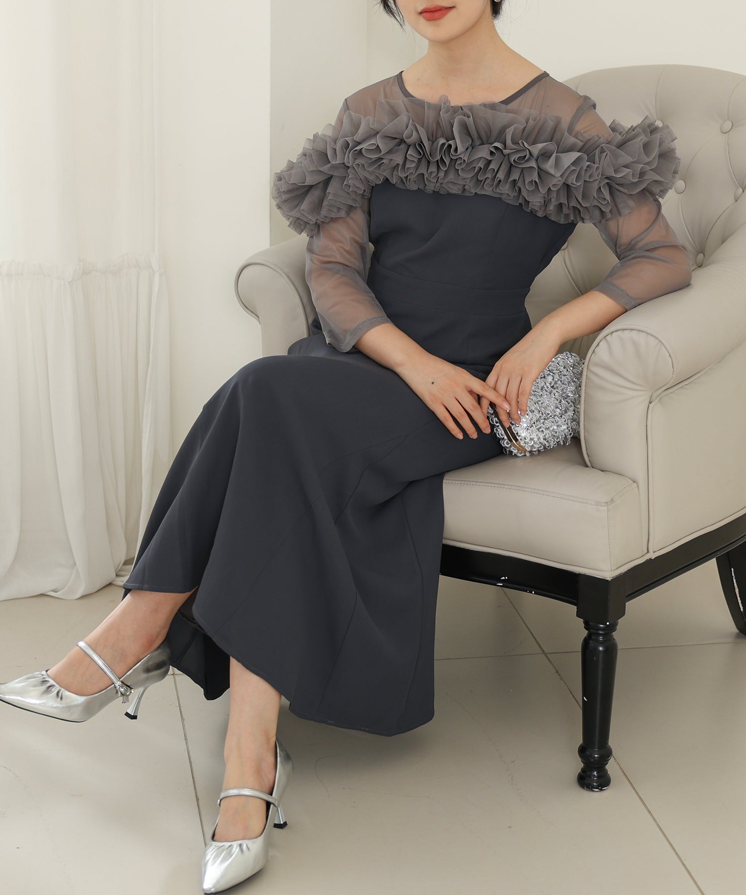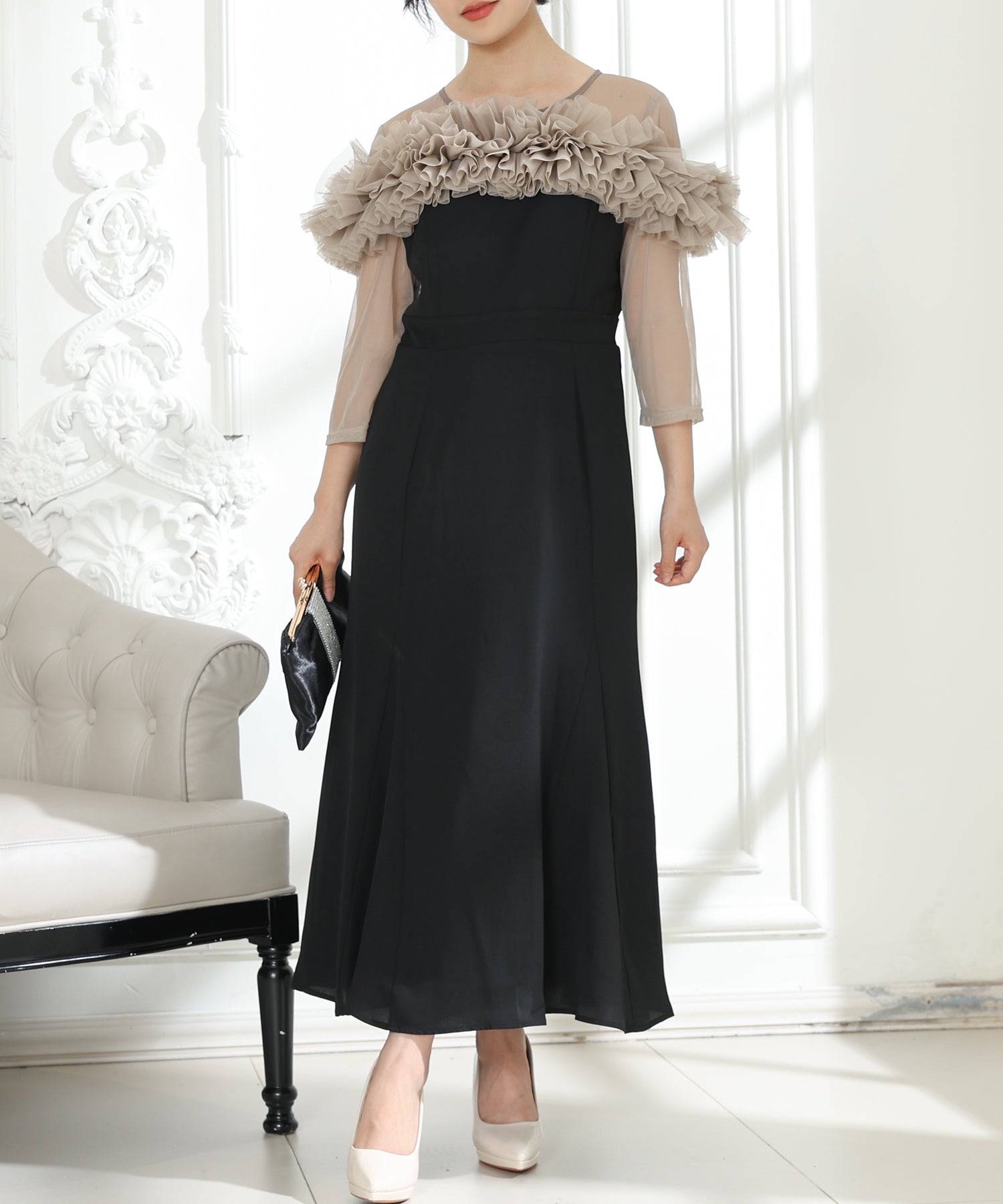 チュールフリル シアー 切り替え フレア ロング ドレス