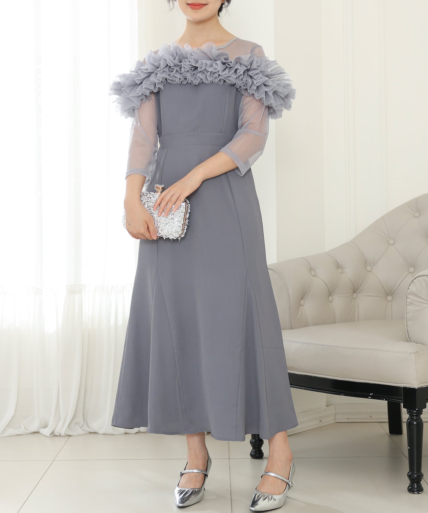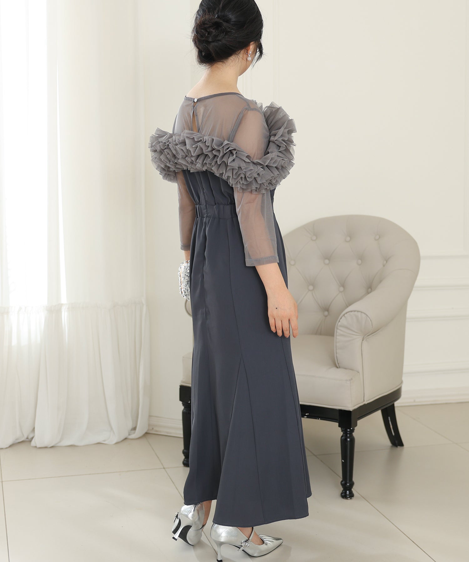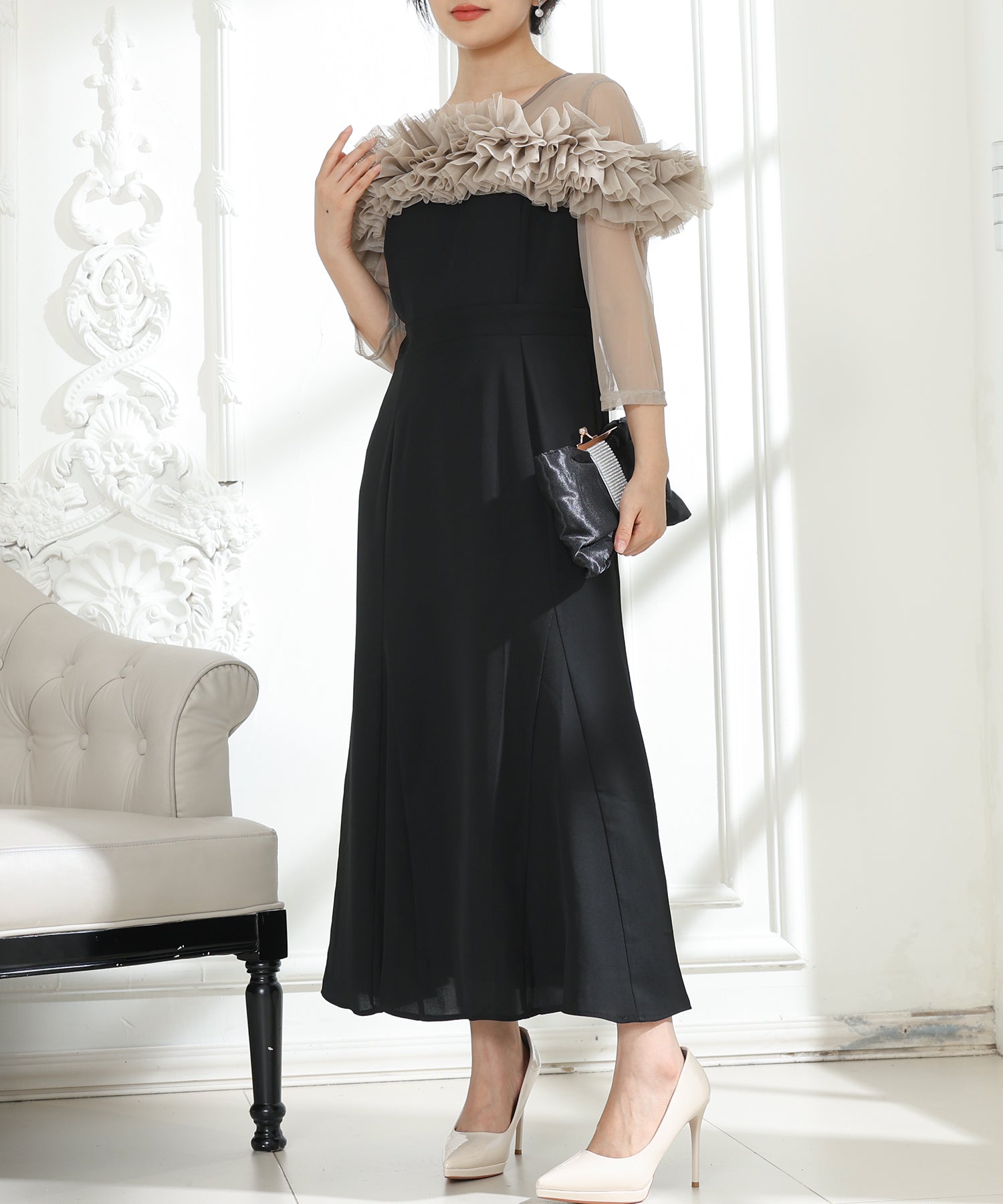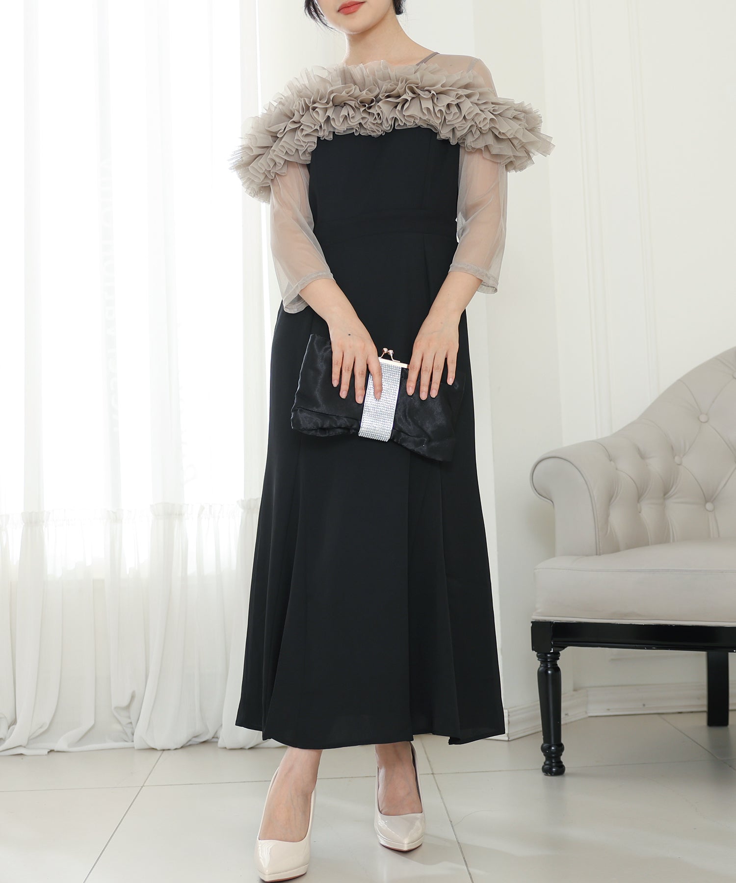 チュールフリル シアー 切り替え フレア ロング ドレス