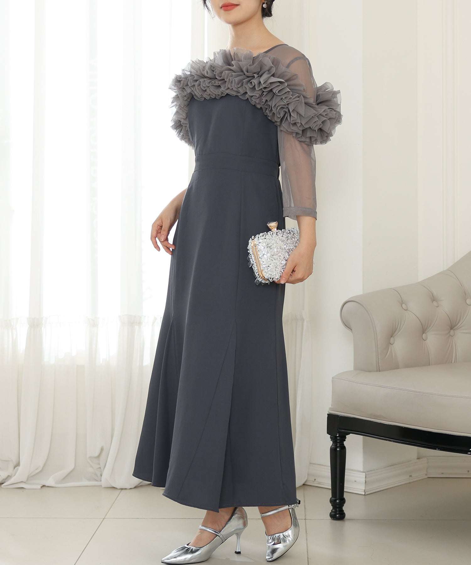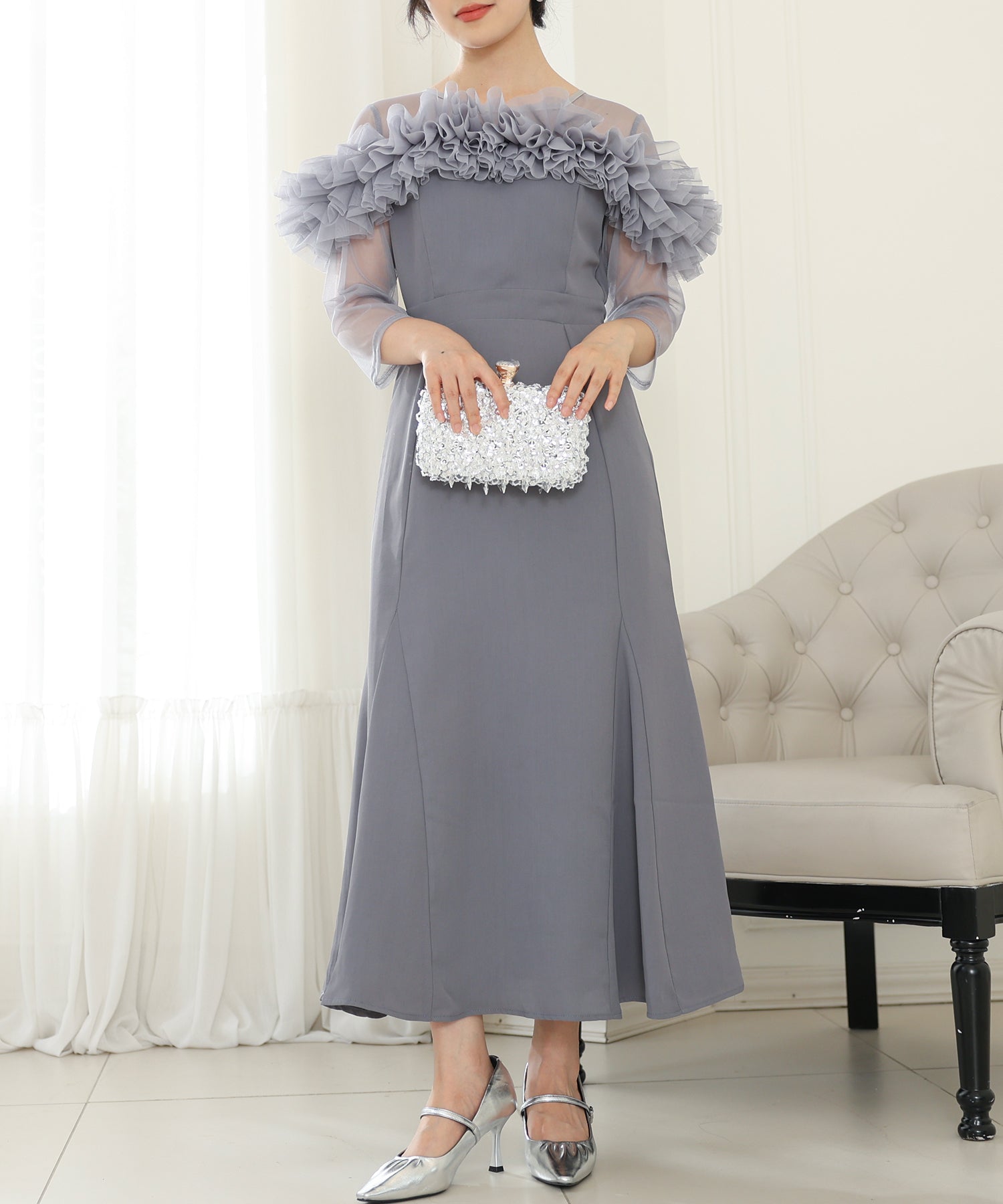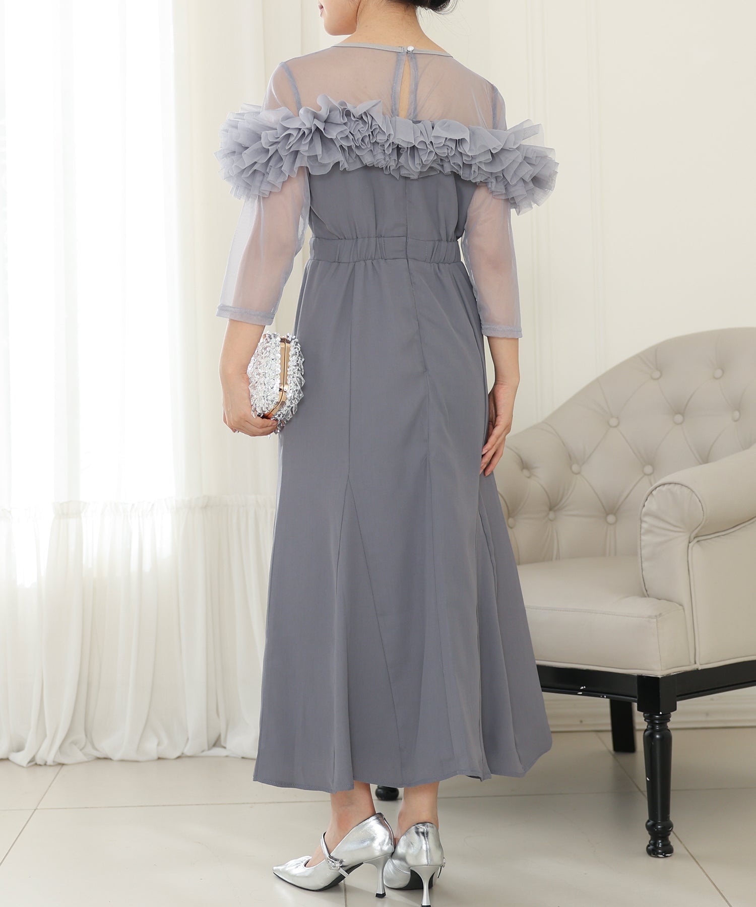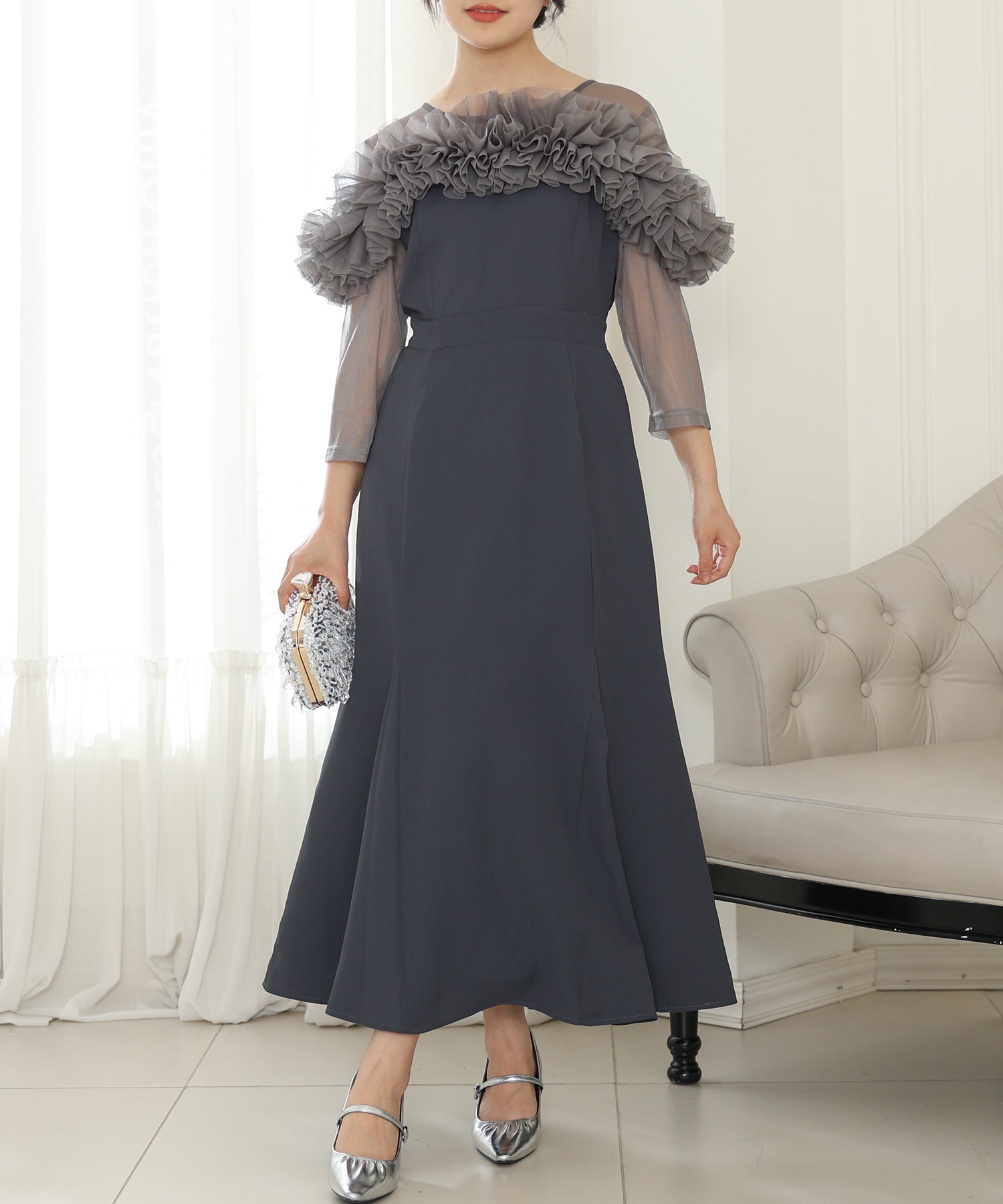 チュールフリル シアー 切り替え フレア ロング ドレス