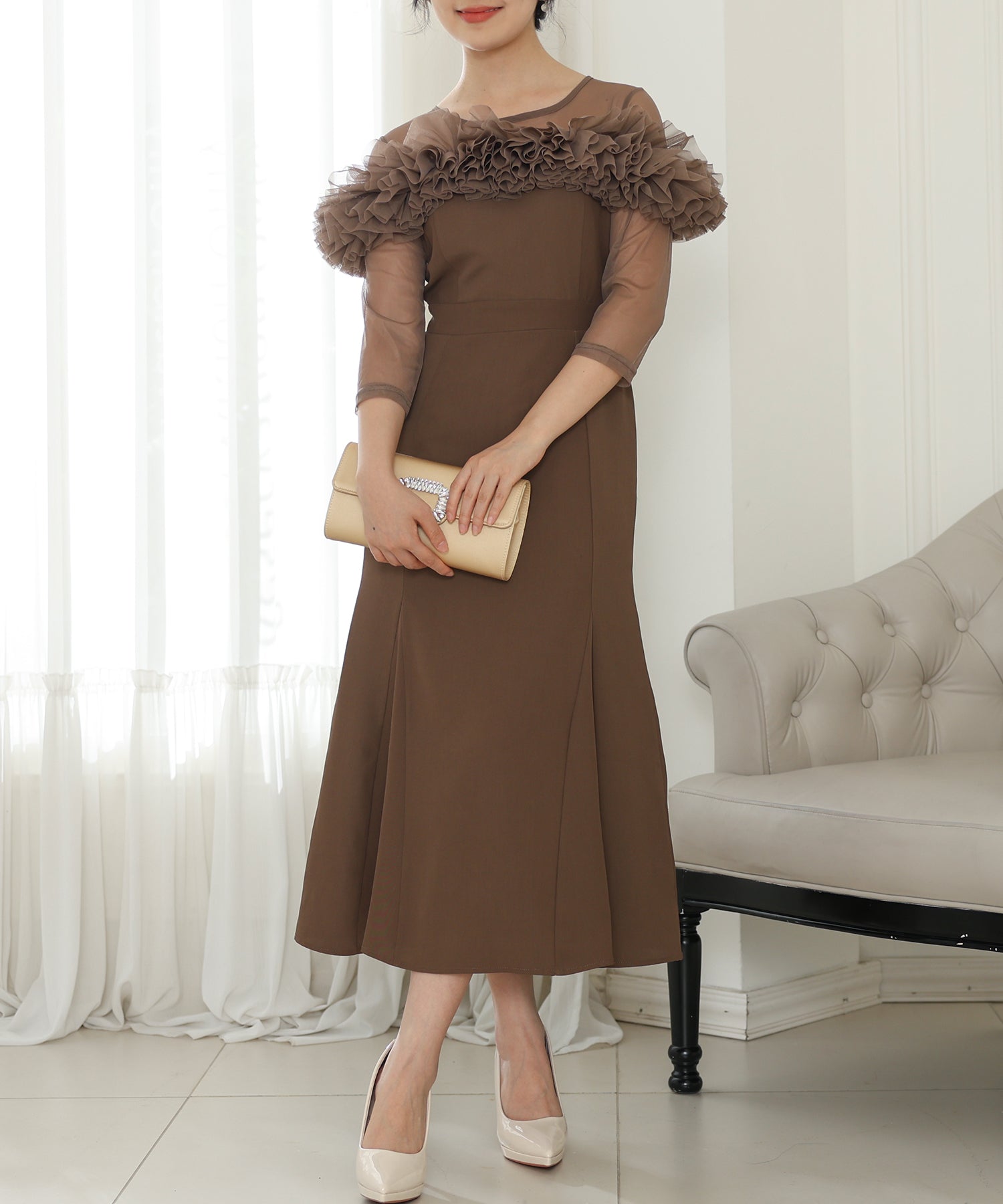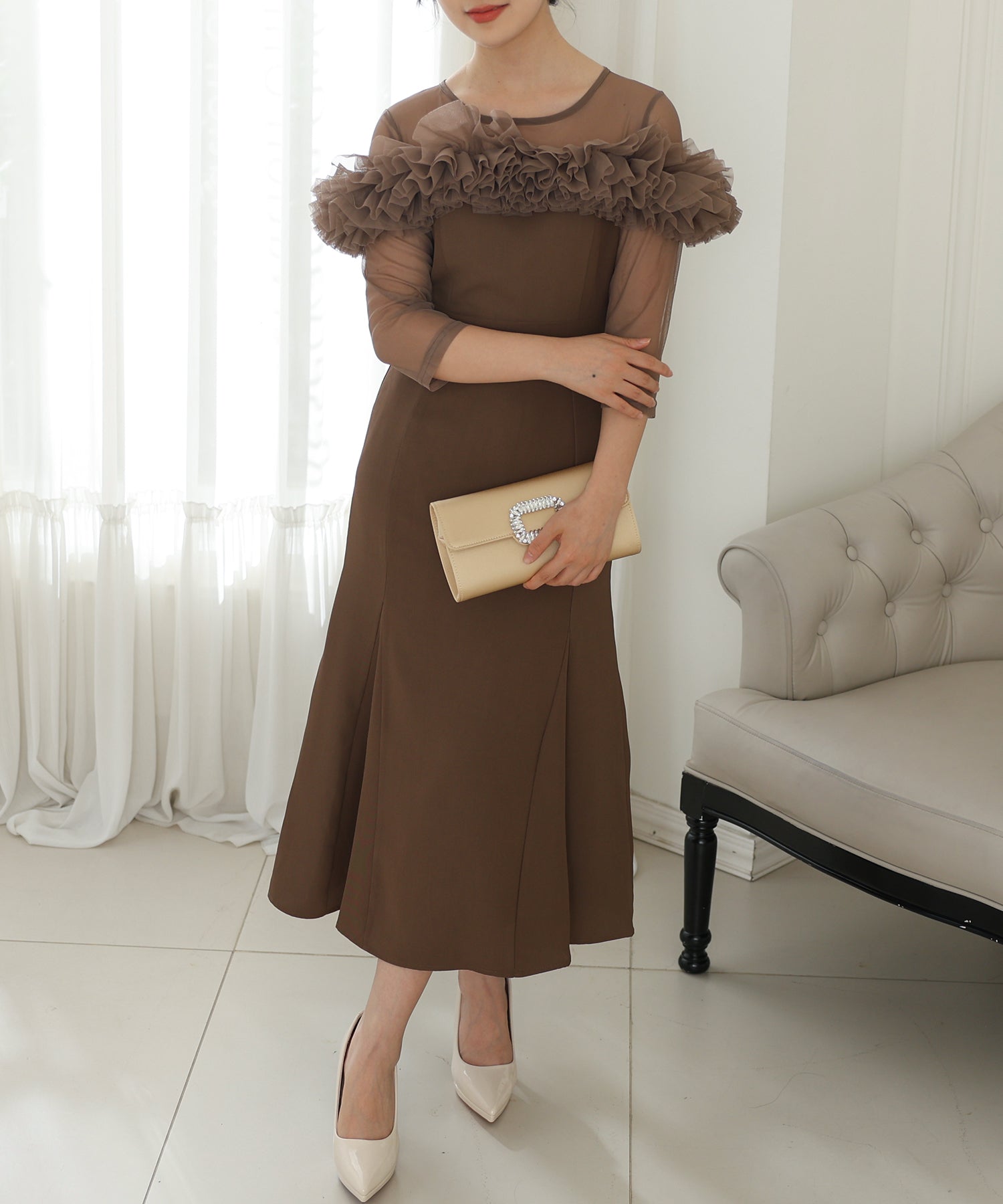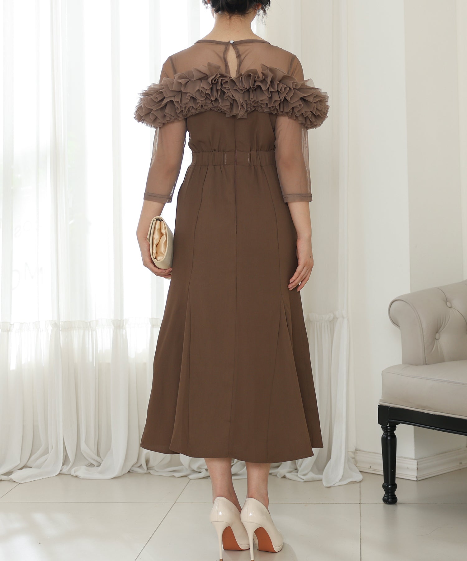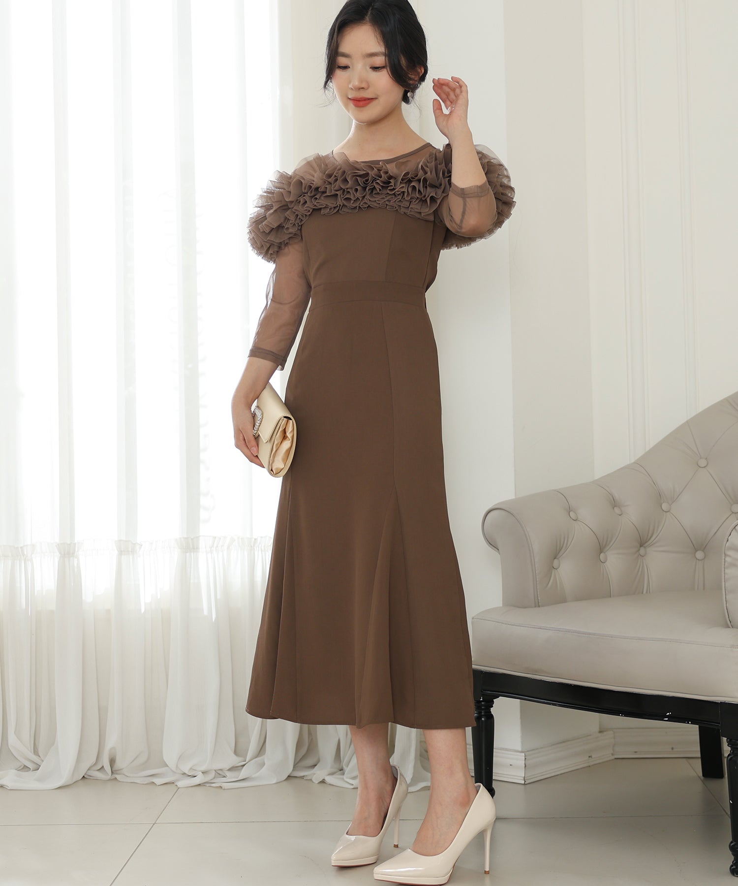 チュールフリル シアー 切り替え フレア ロング ドレス