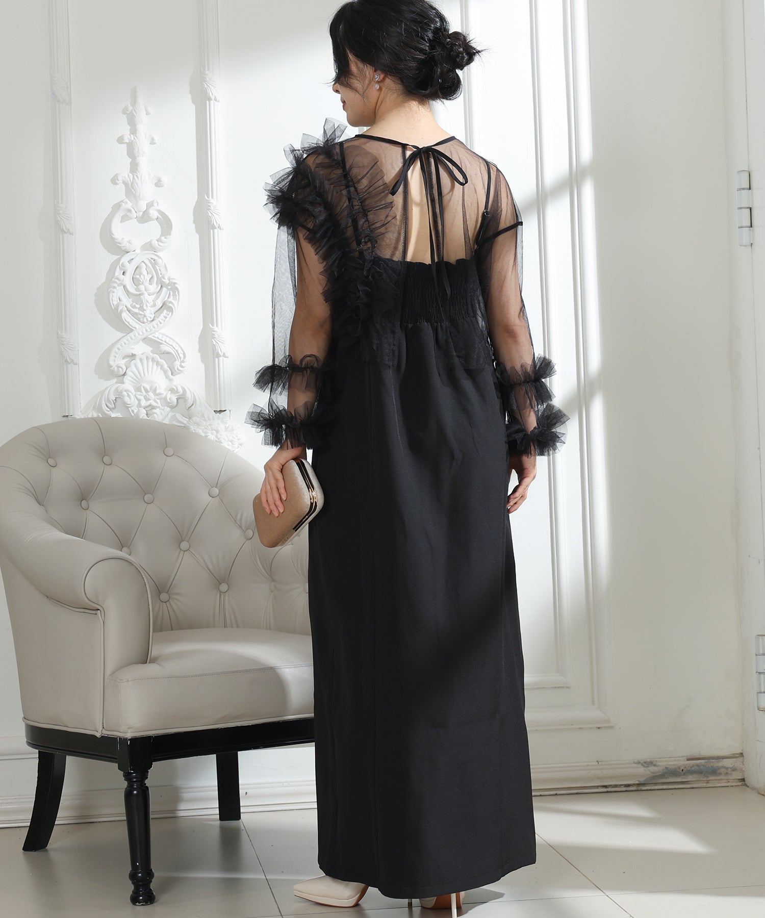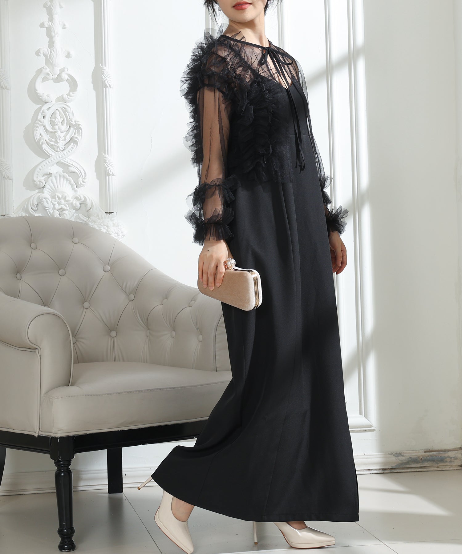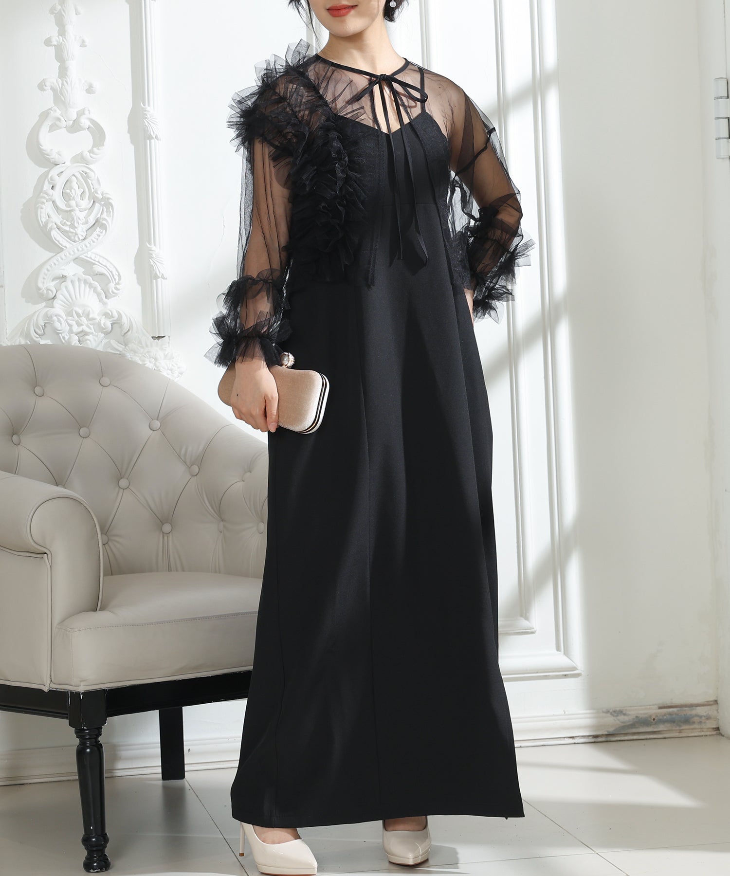 チュールフリル シアー 切り替え フレア ロング ドレス