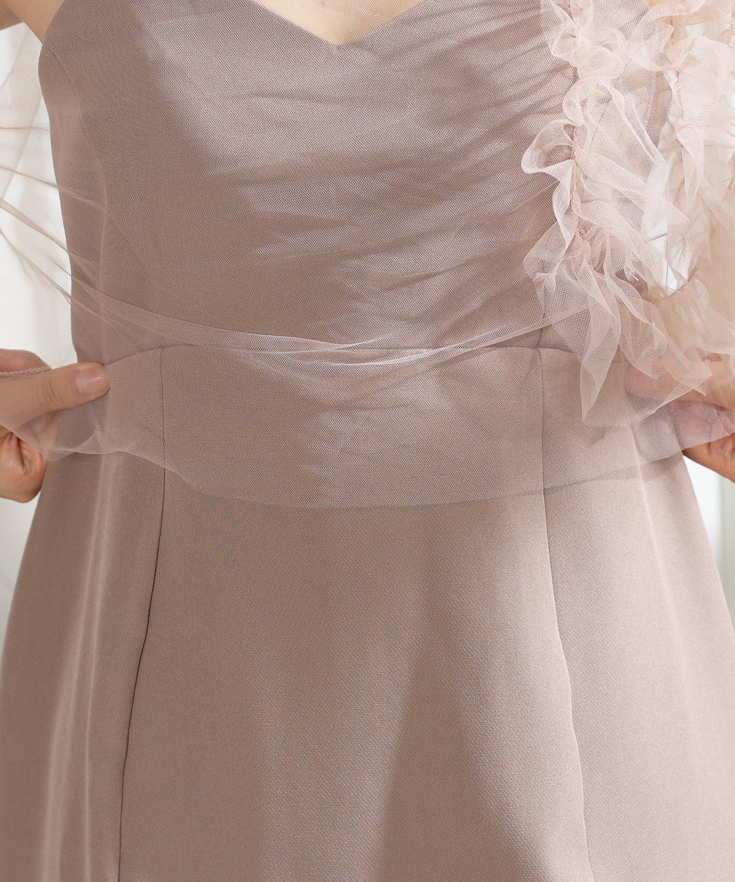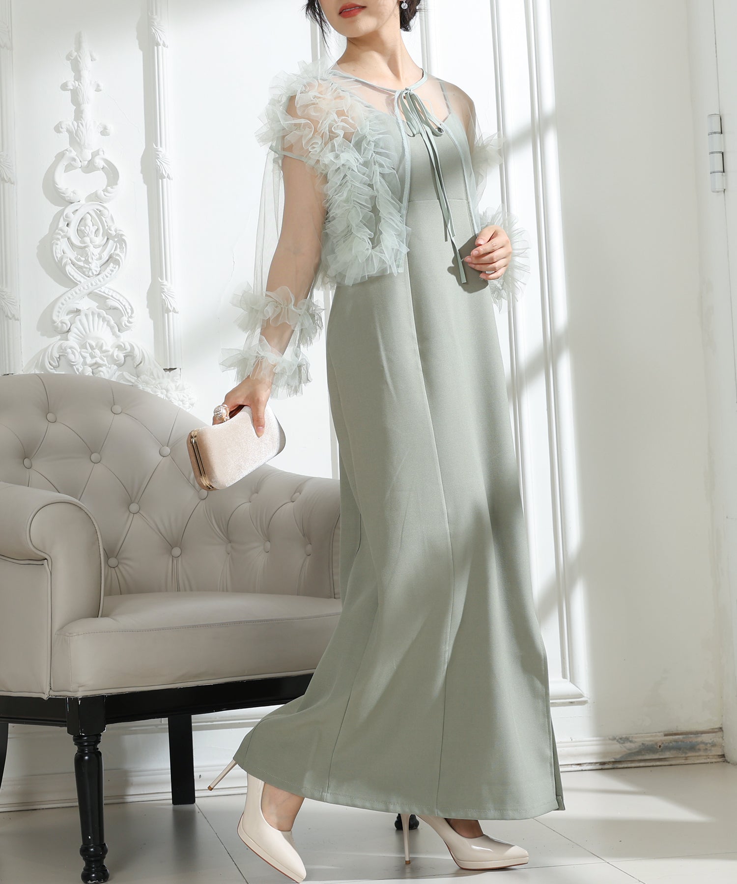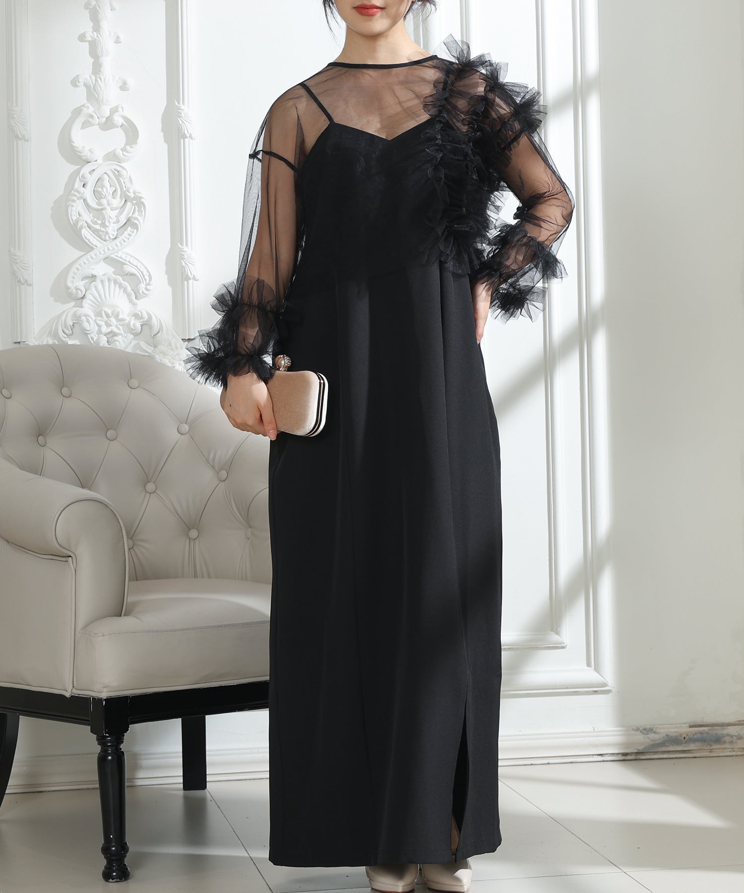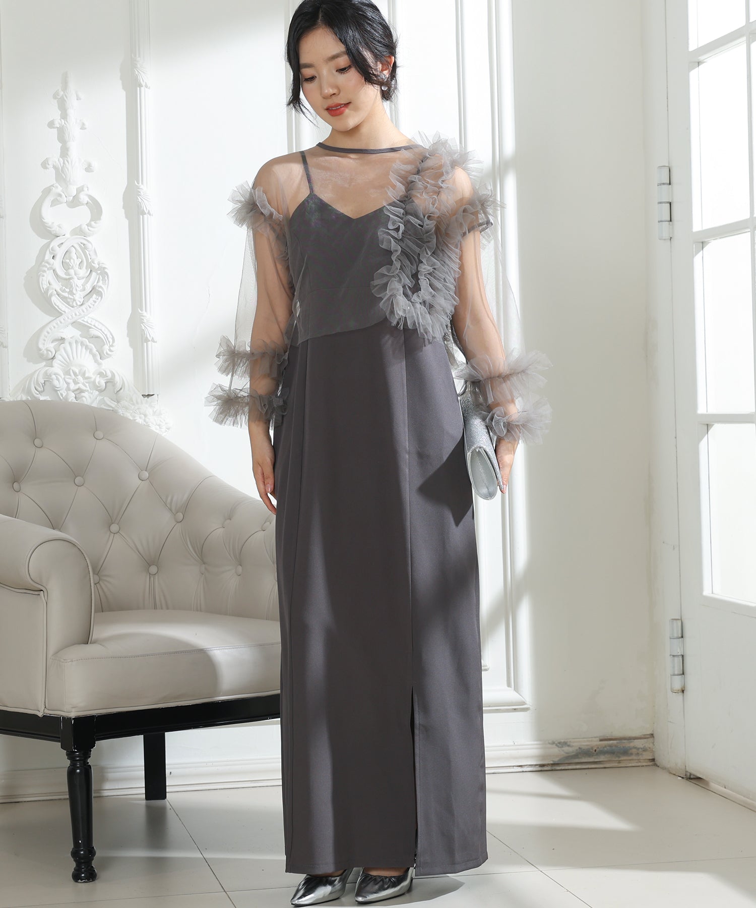 チュールフリル シアー 切り替え フレア ロング ドレス