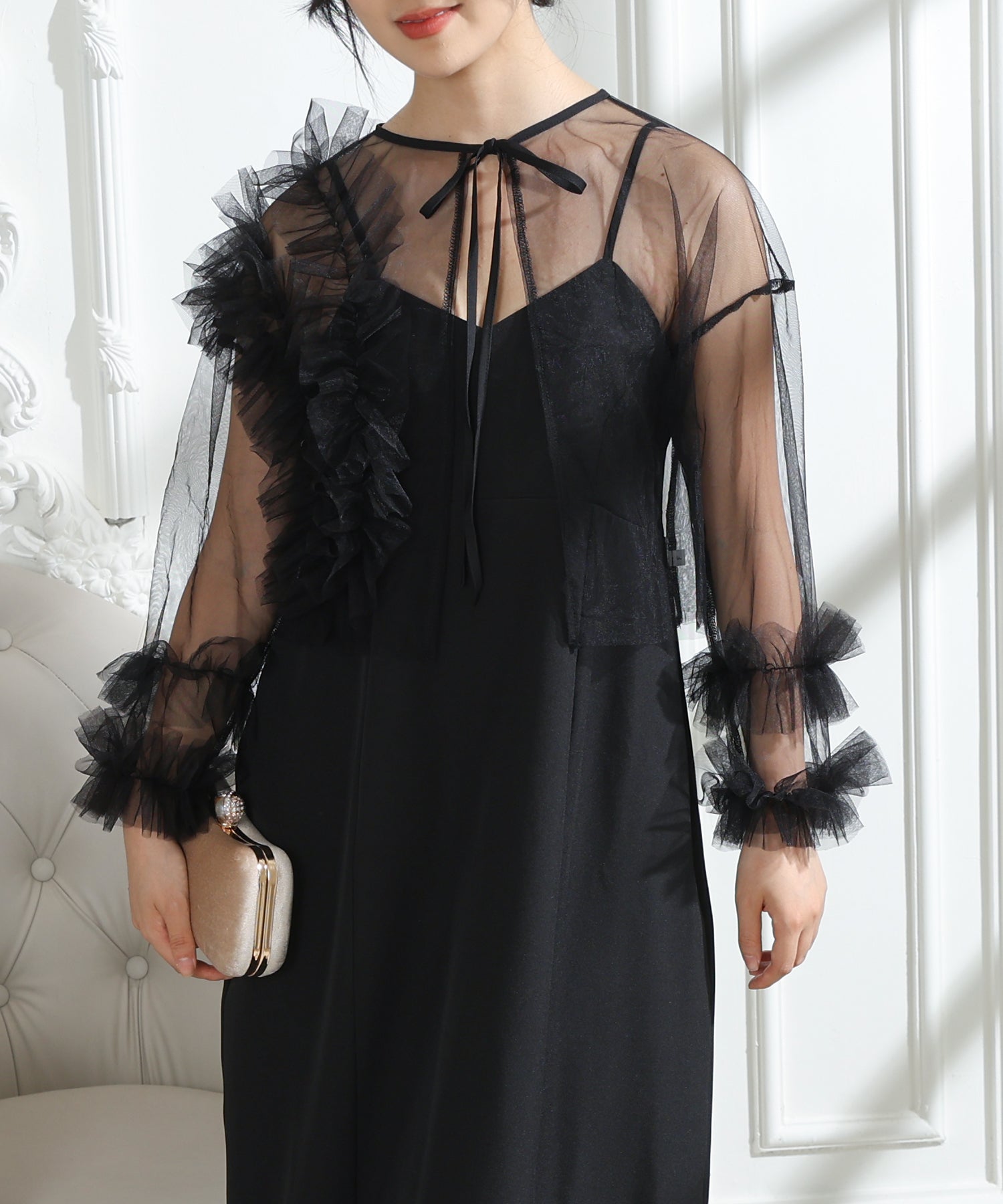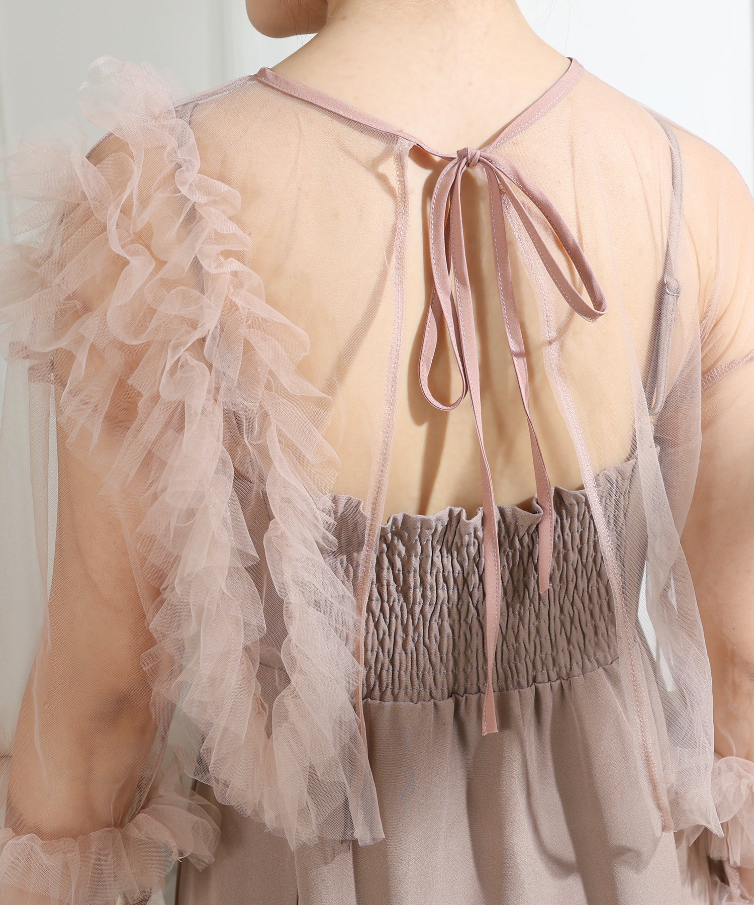 チュールフリルをあしらったシアー素材のケープをセットにしました。