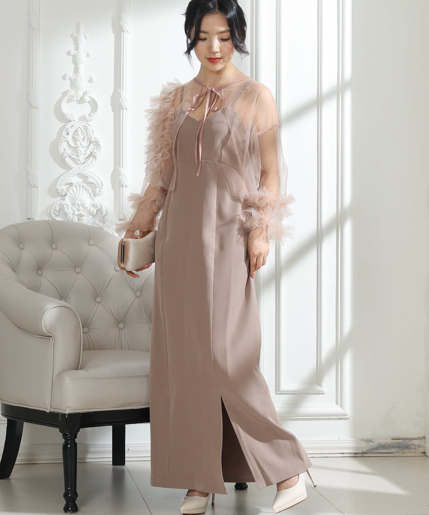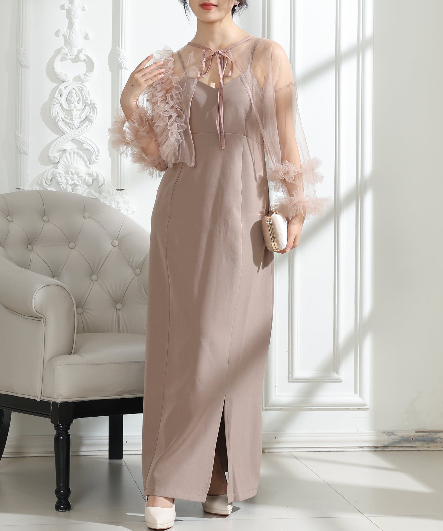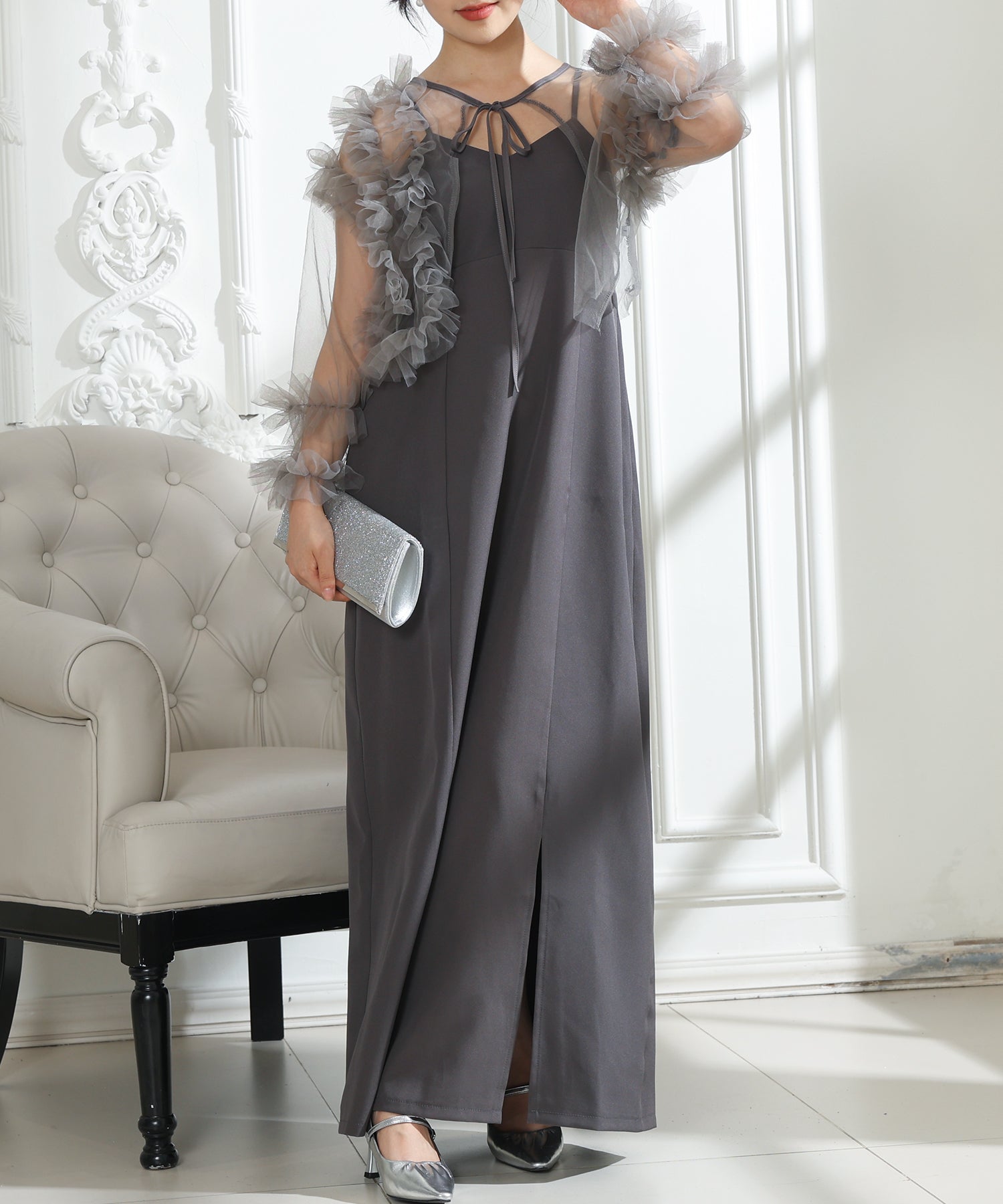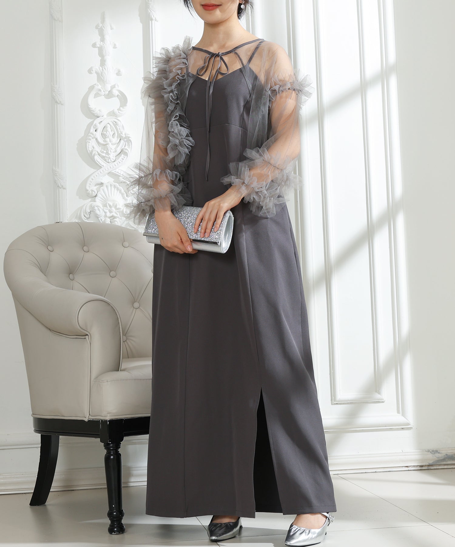 チュールフリル ケープ付き スリット キャミソール ドレス