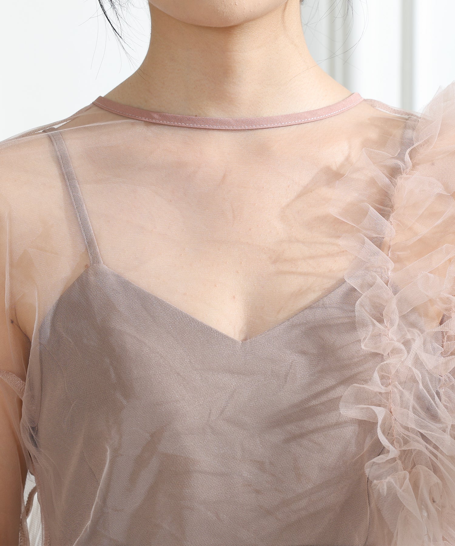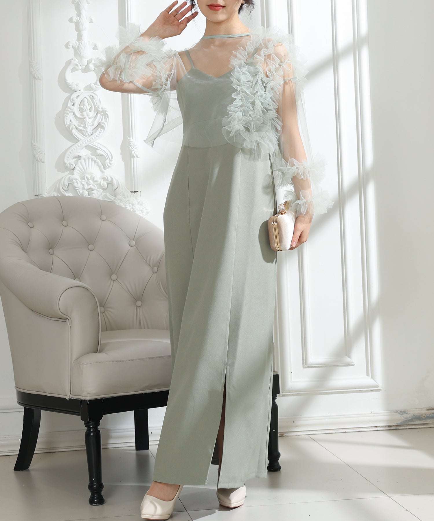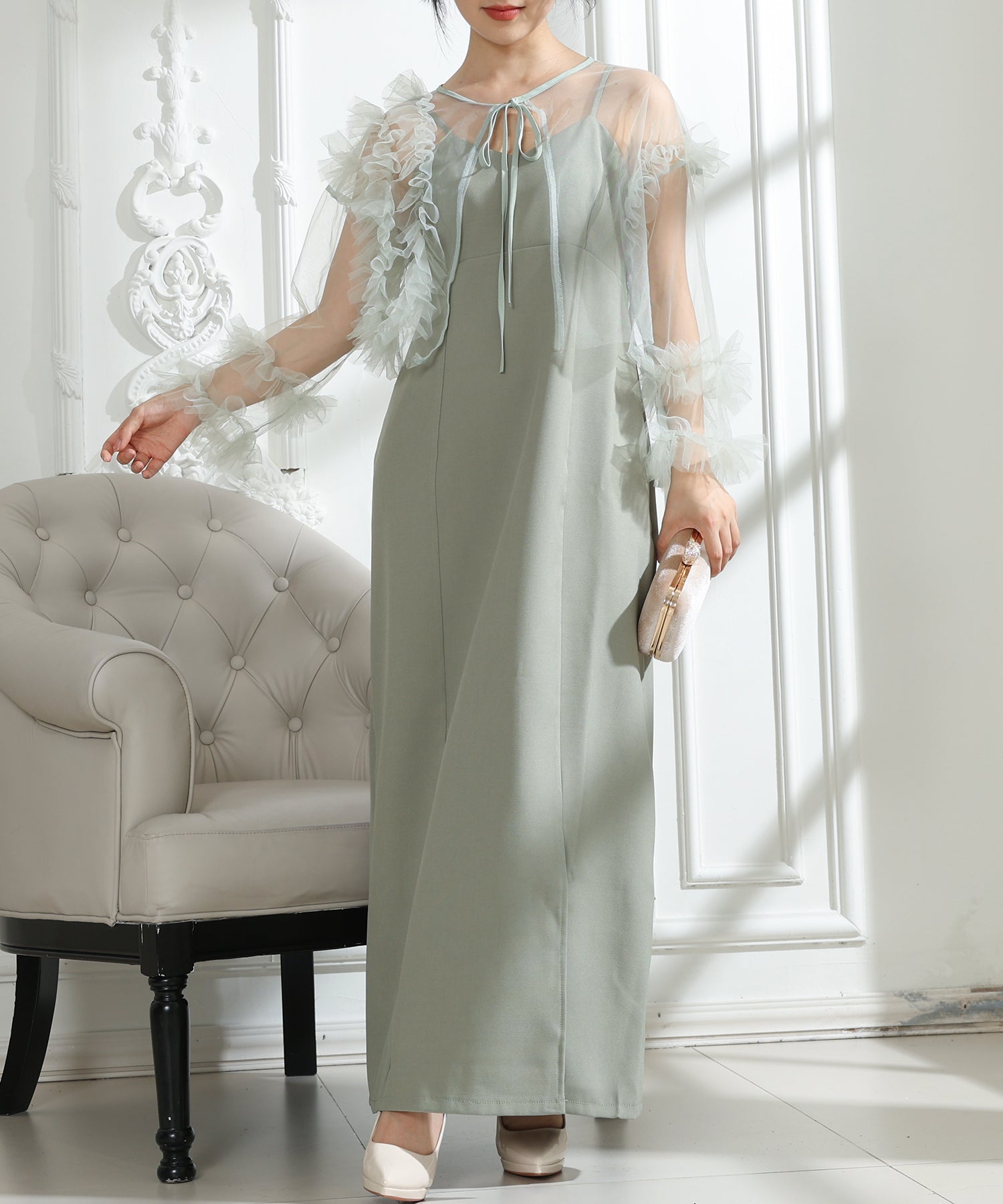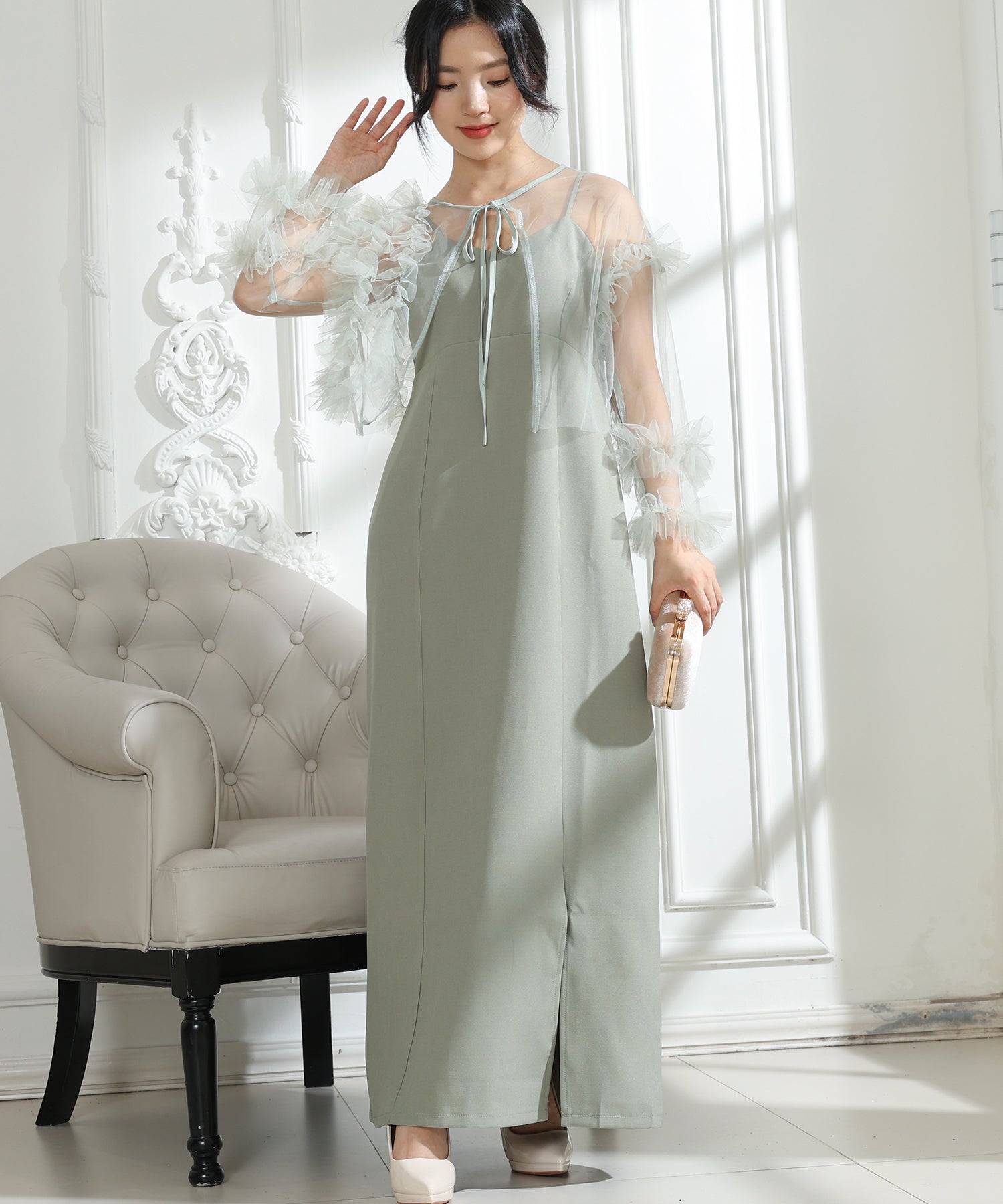 チュールフリル ケープ付き スリット キャミソール ドレス