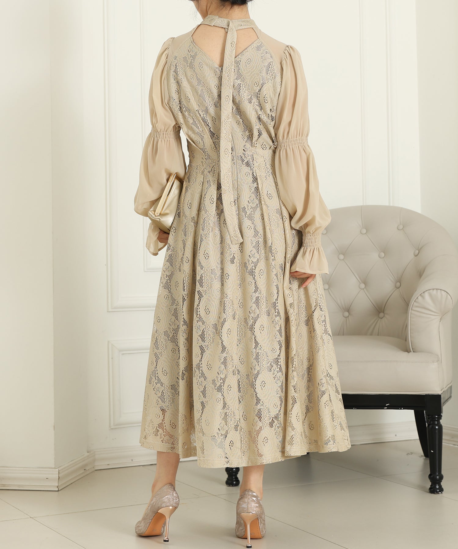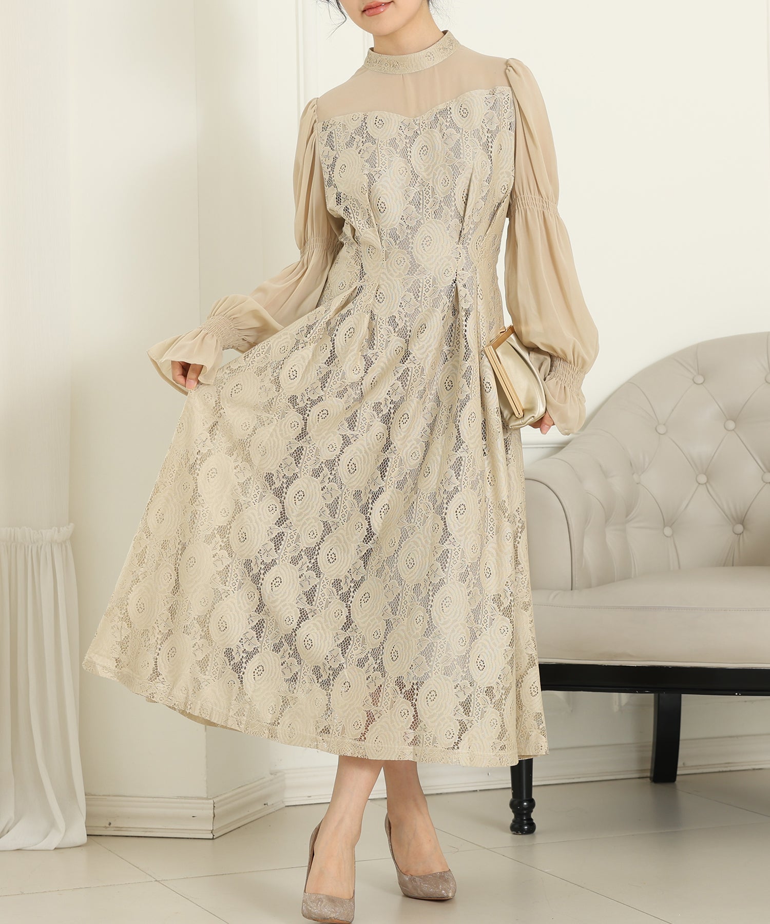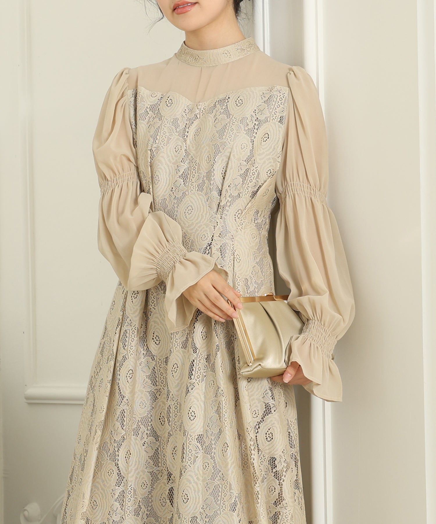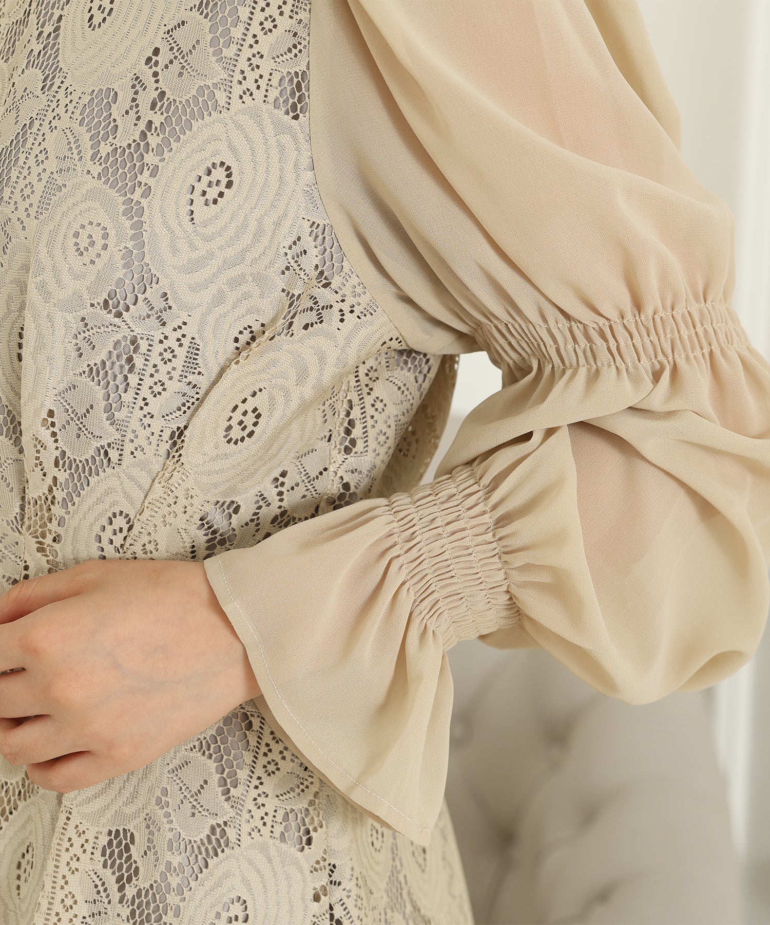 チョーカーネック 花柄 レース ドッキング キャンディースリーブ ドレス