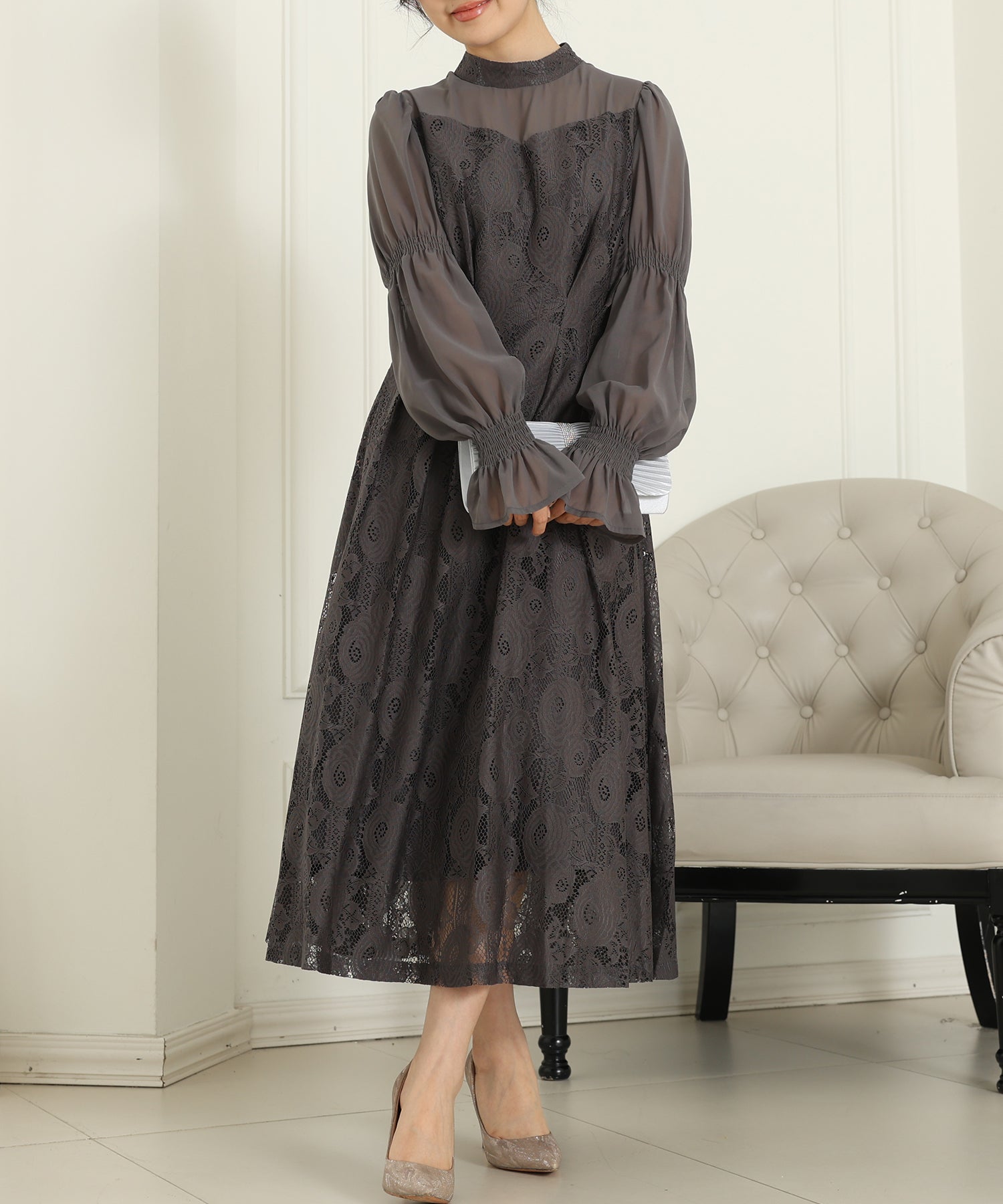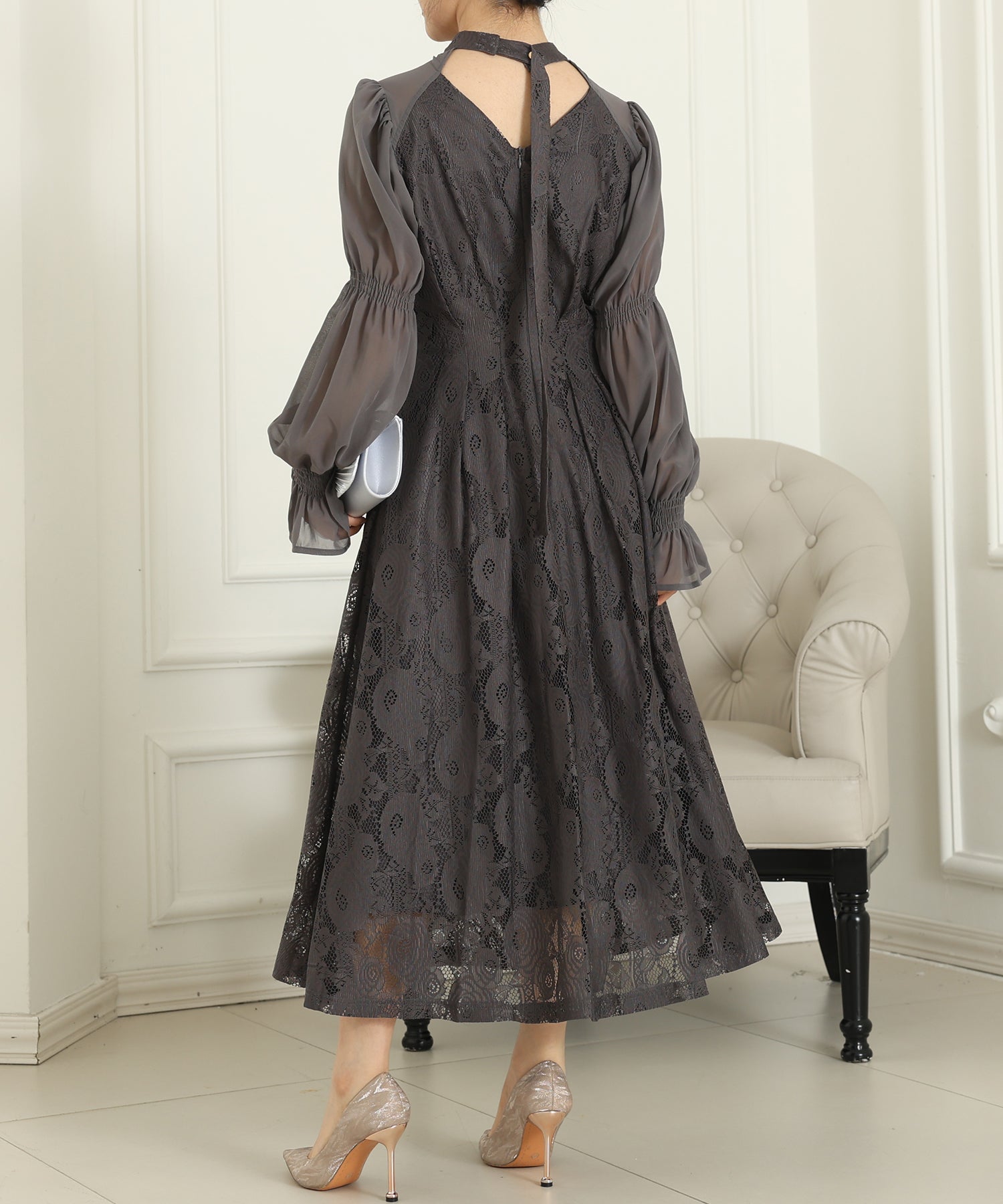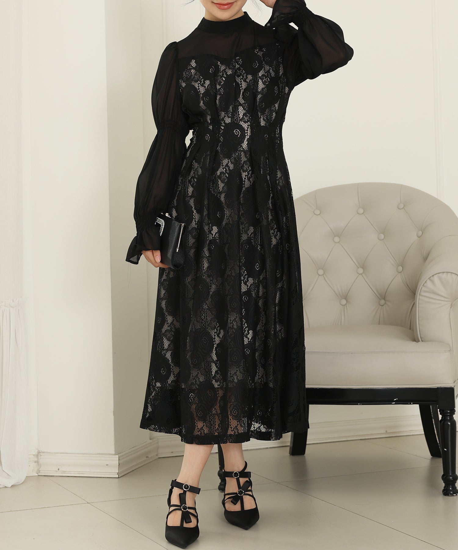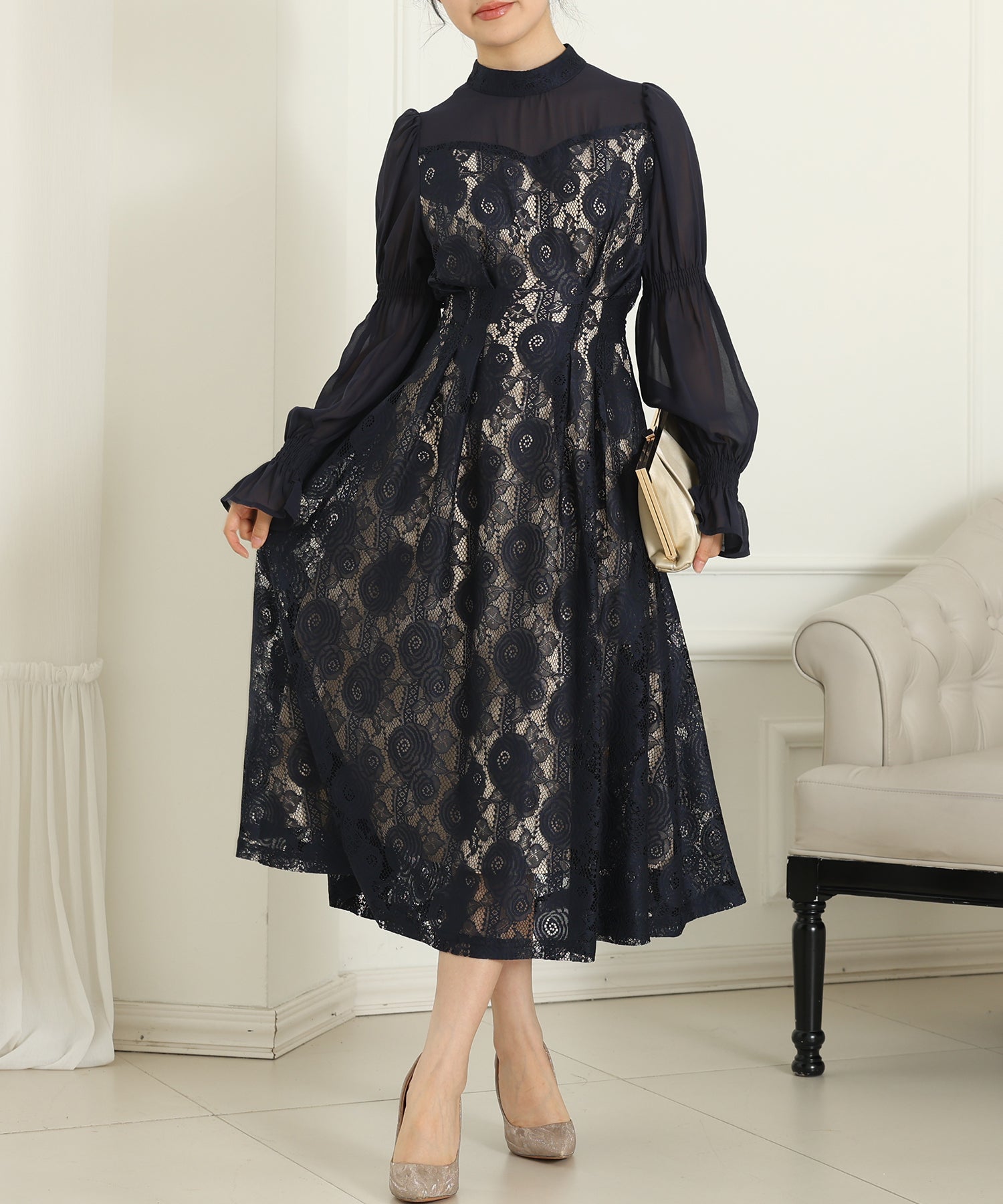 チョーカーネック 花柄 レース ドッキング キャンディースリーブ ドレス