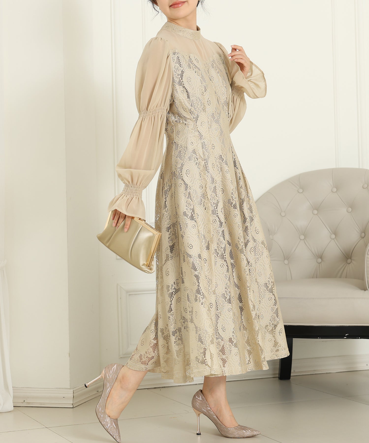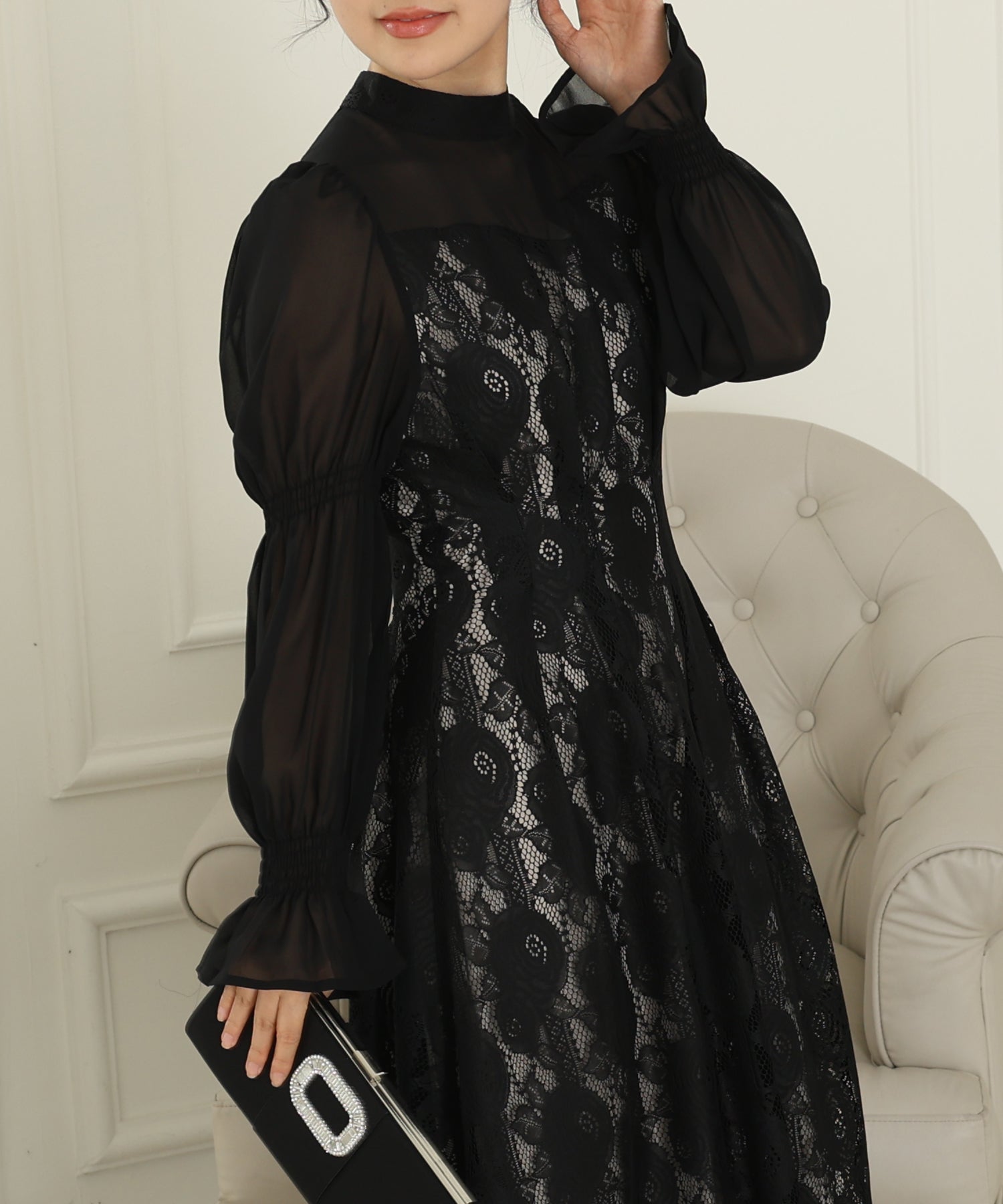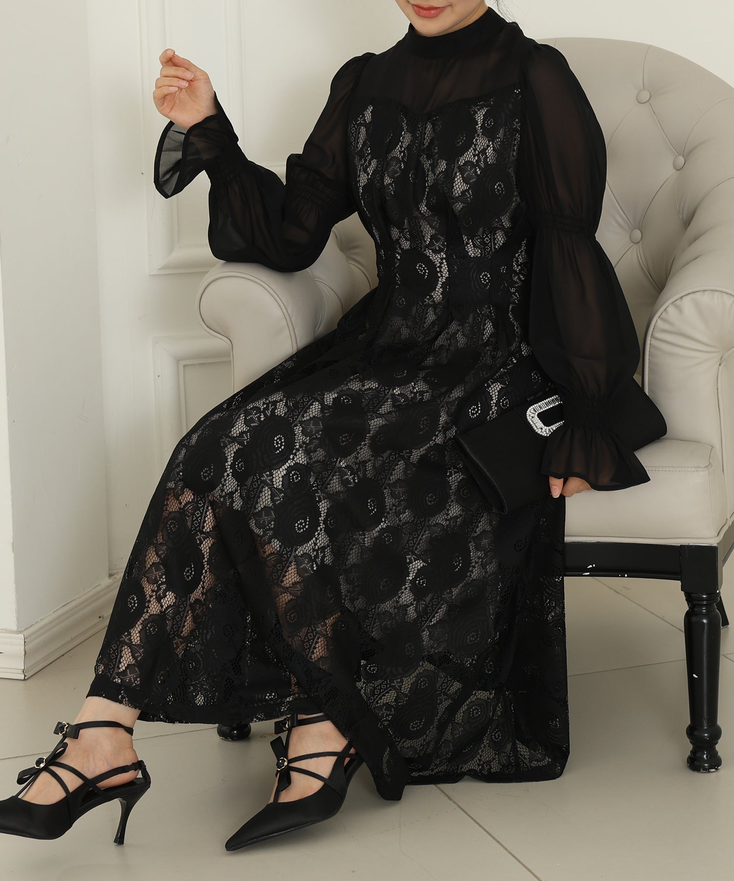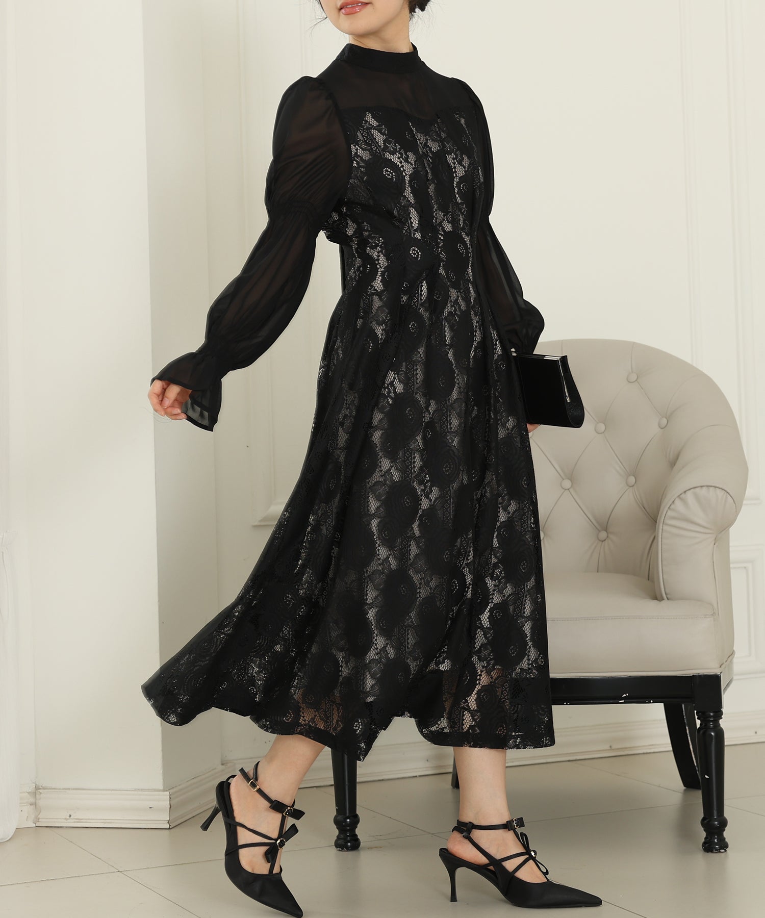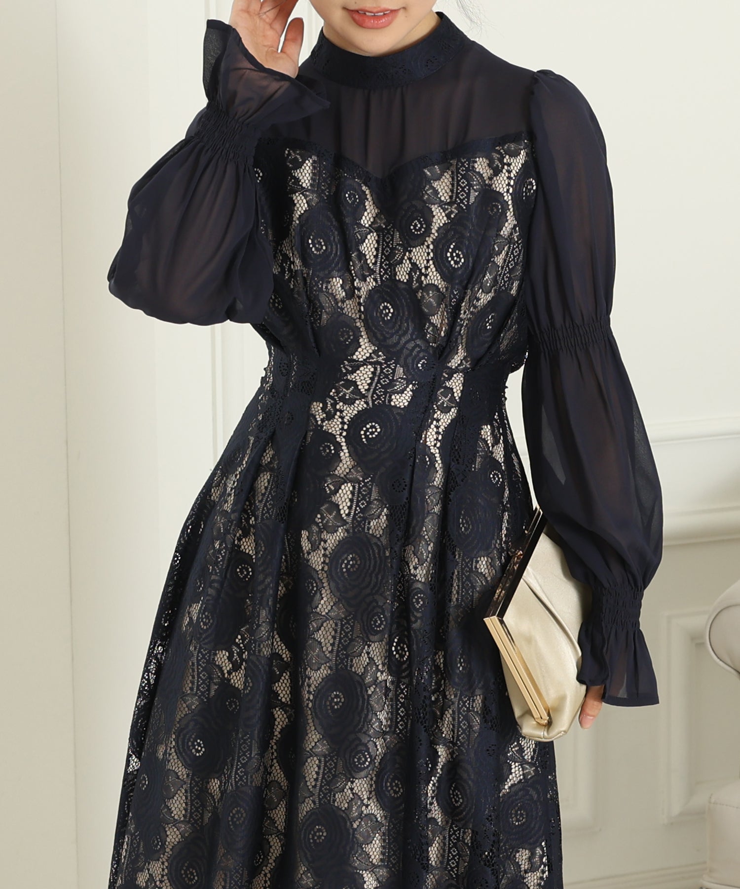 チョーカーネック 花柄 レース ドッキング キャンディースリーブ ドレス