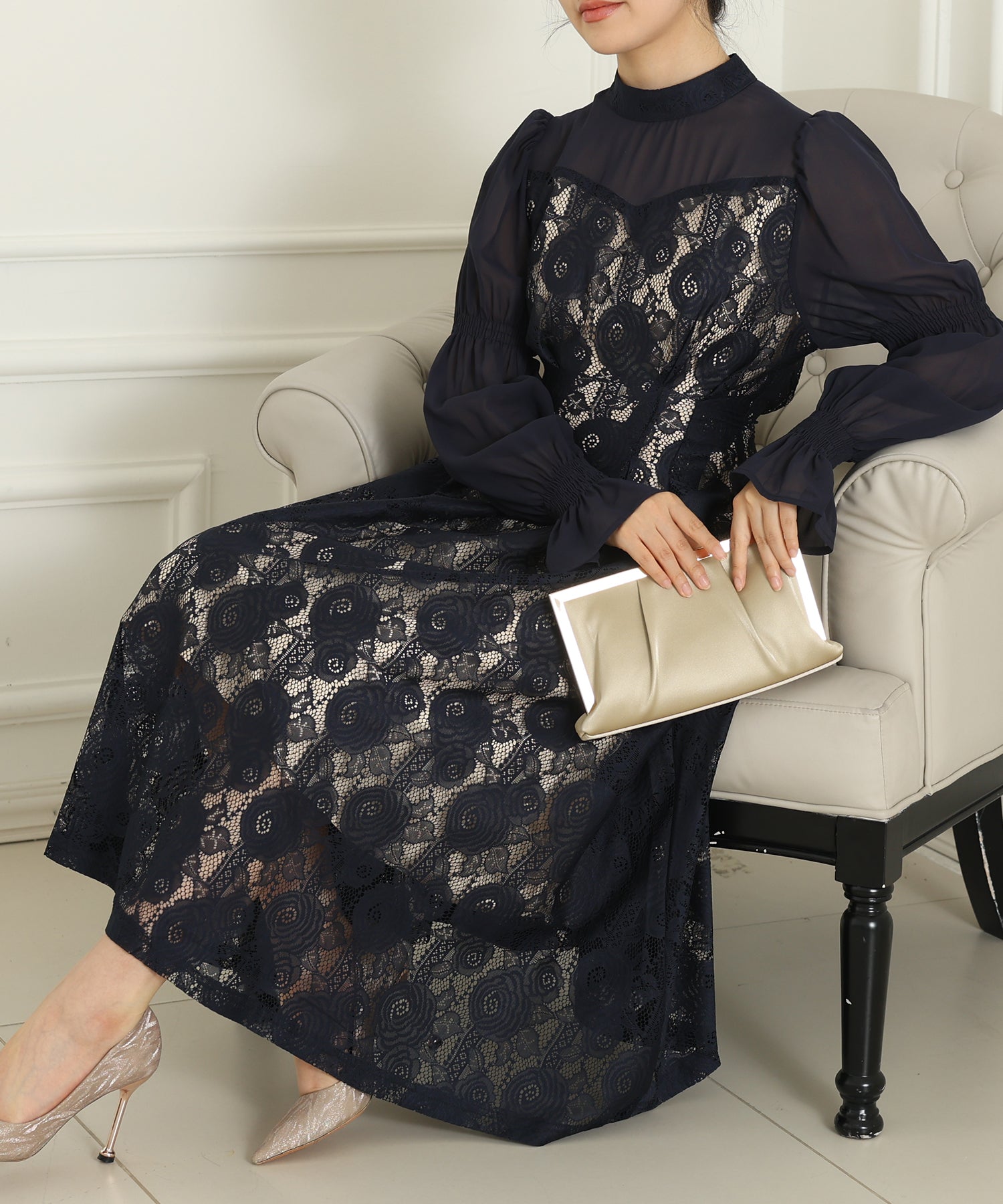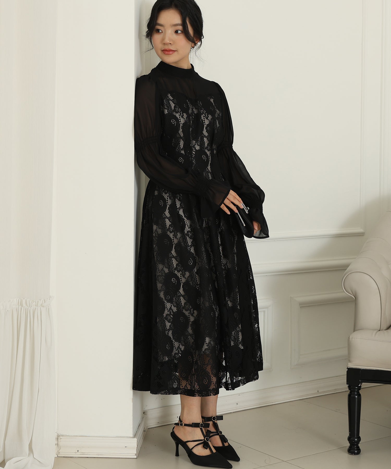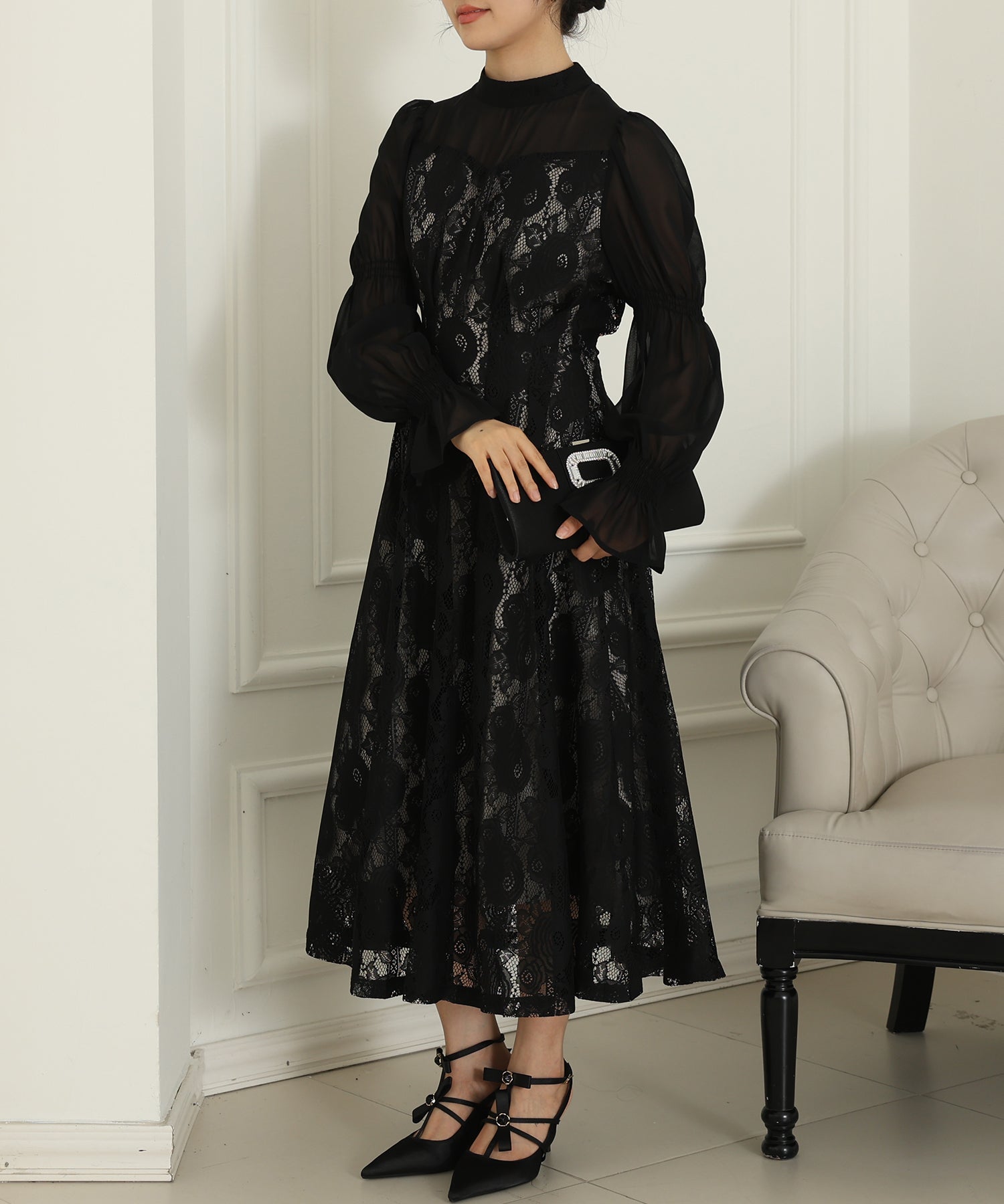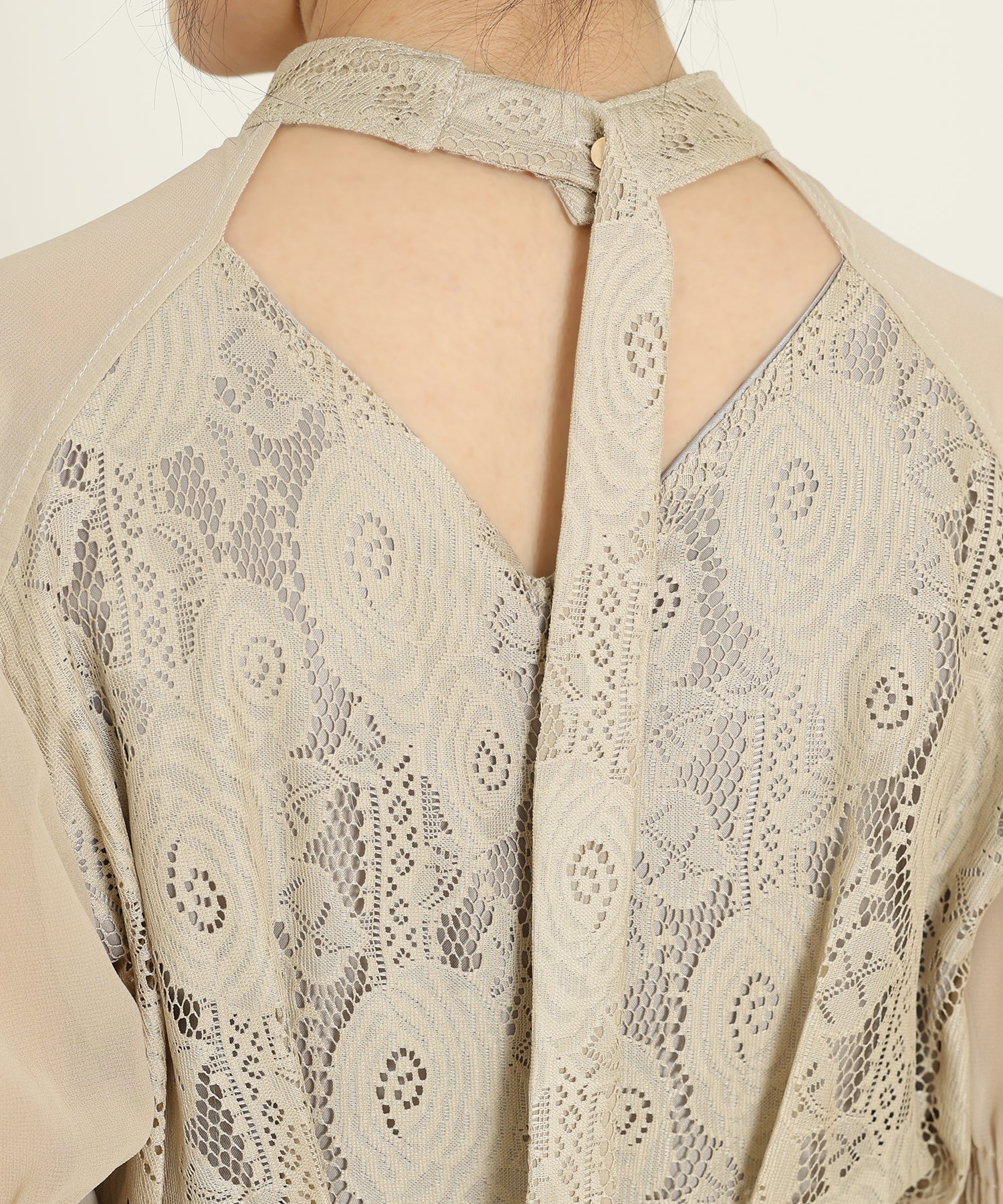 チョーカーネック 花柄 レース ドッキング キャンディースリーブ ドレス