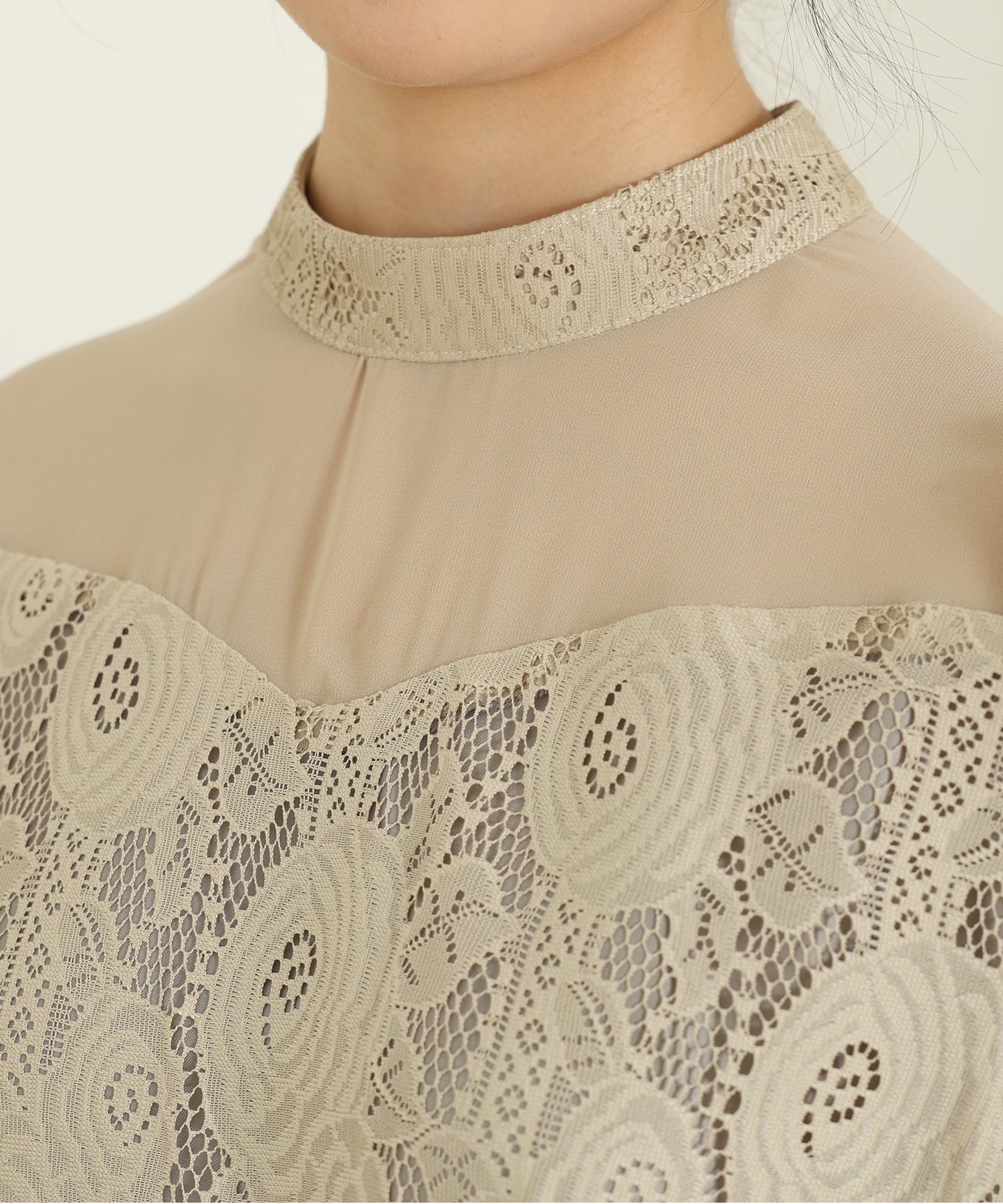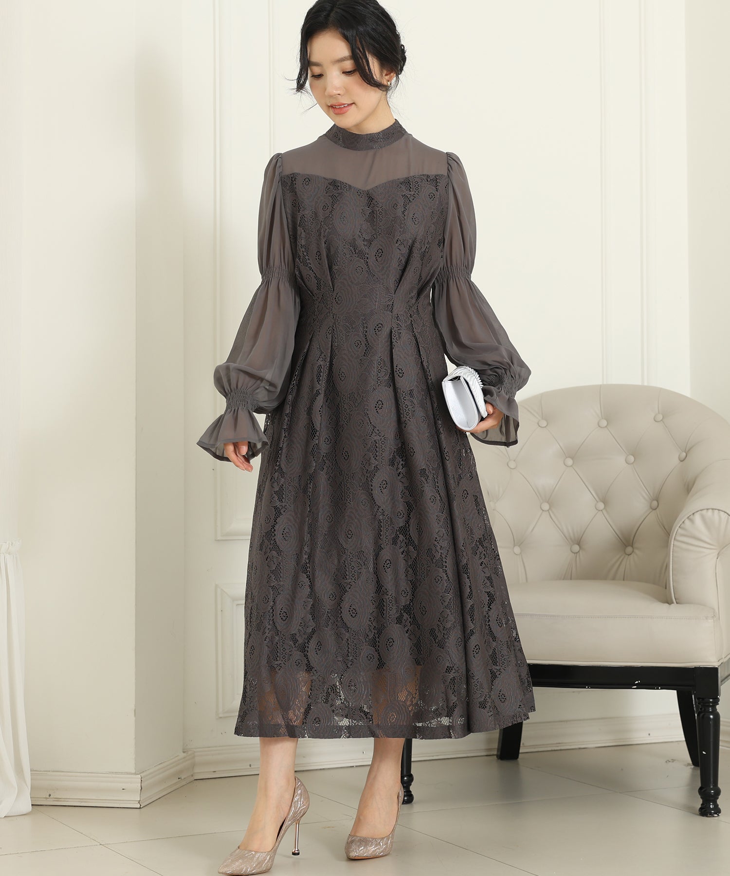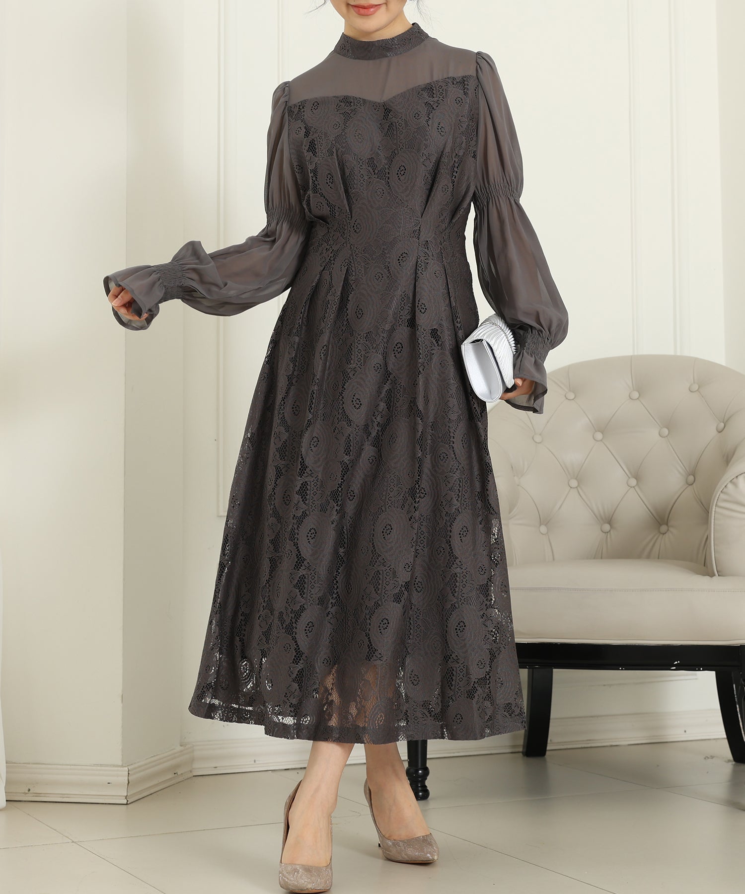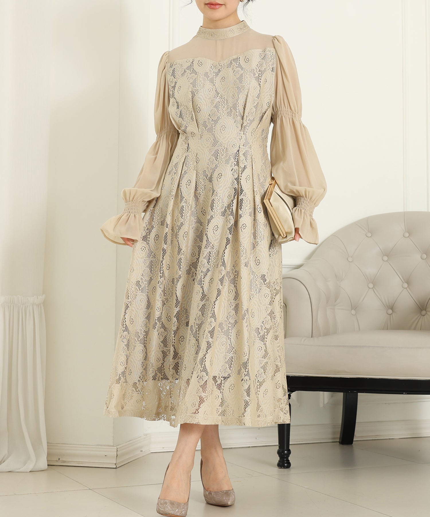 チョーカーネック 花柄 レース ドッキング キャンディースリーブ ドレス