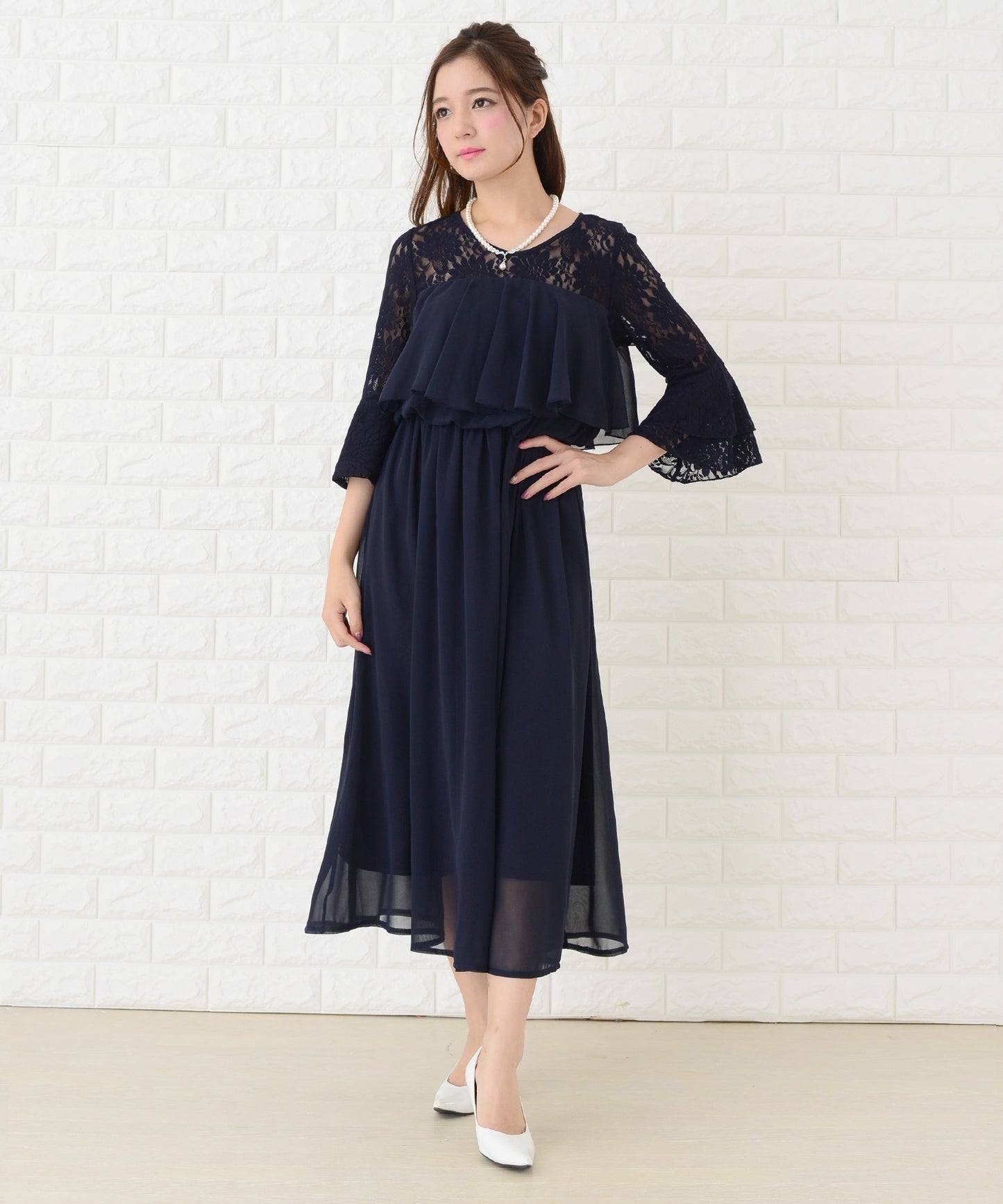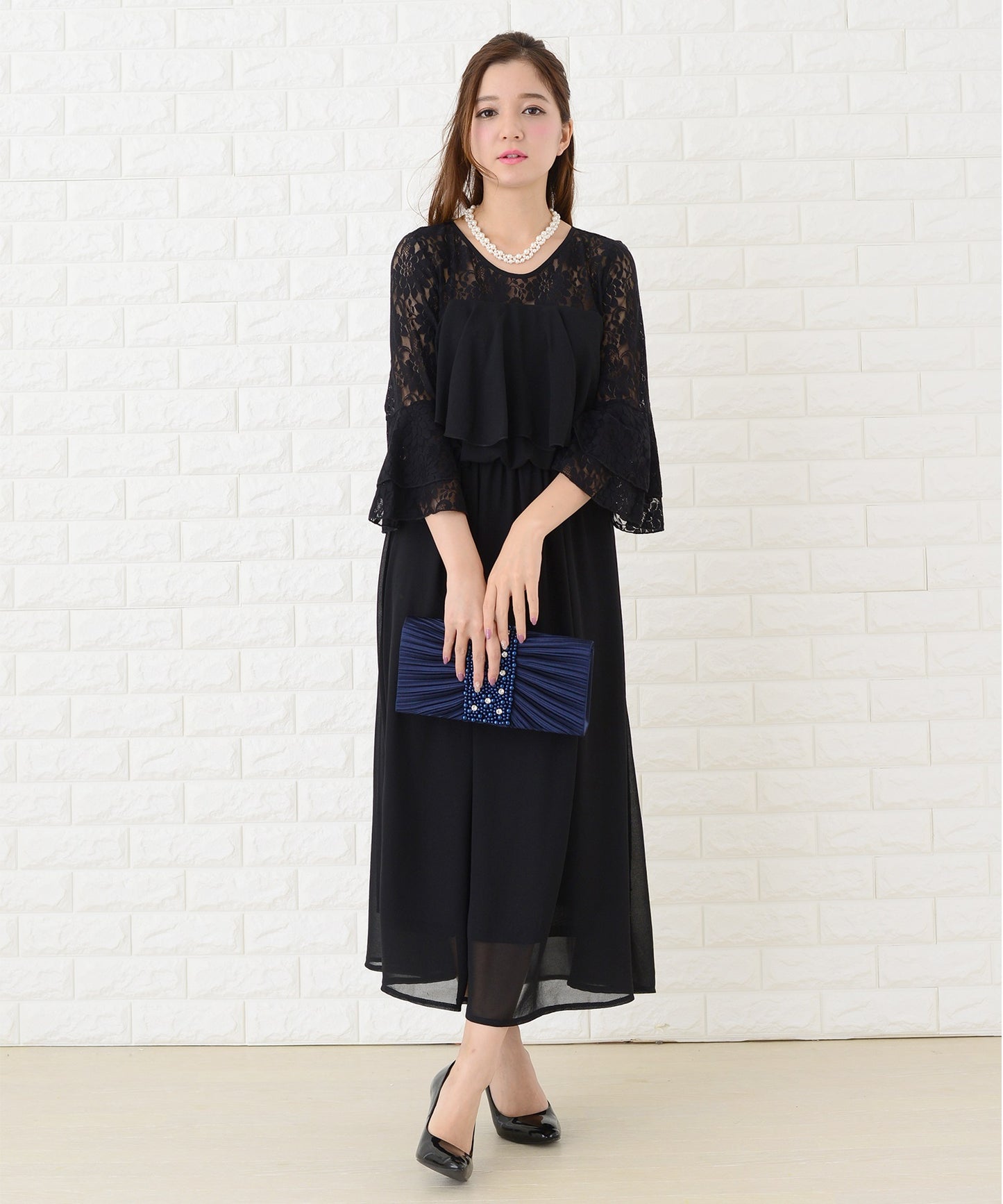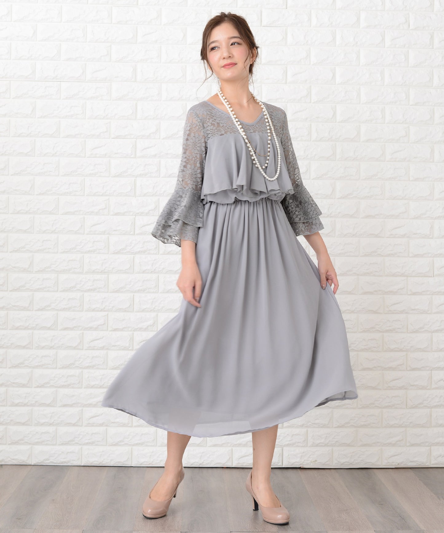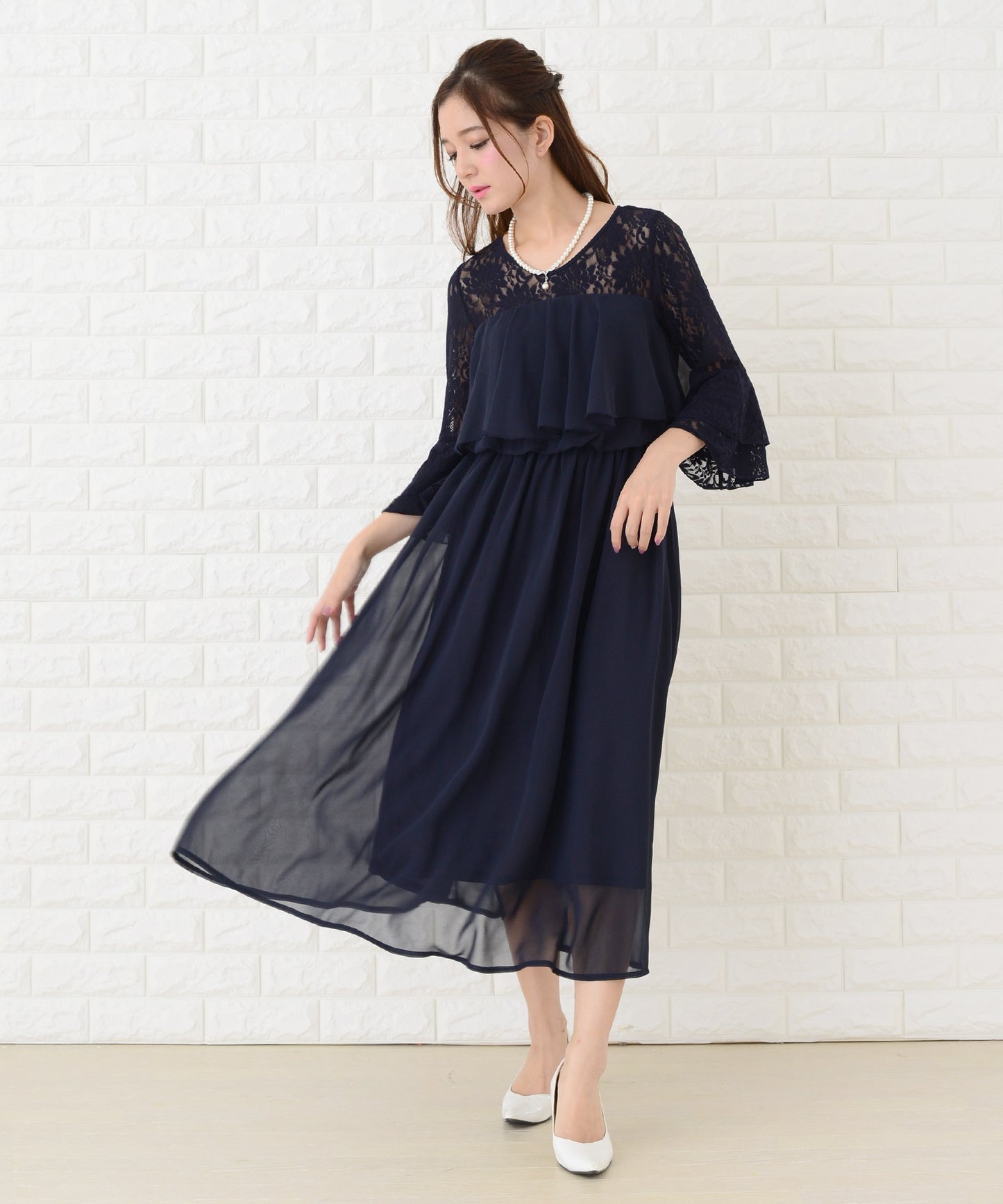 シフォン胸元プリーツロングワンピース・ドレス